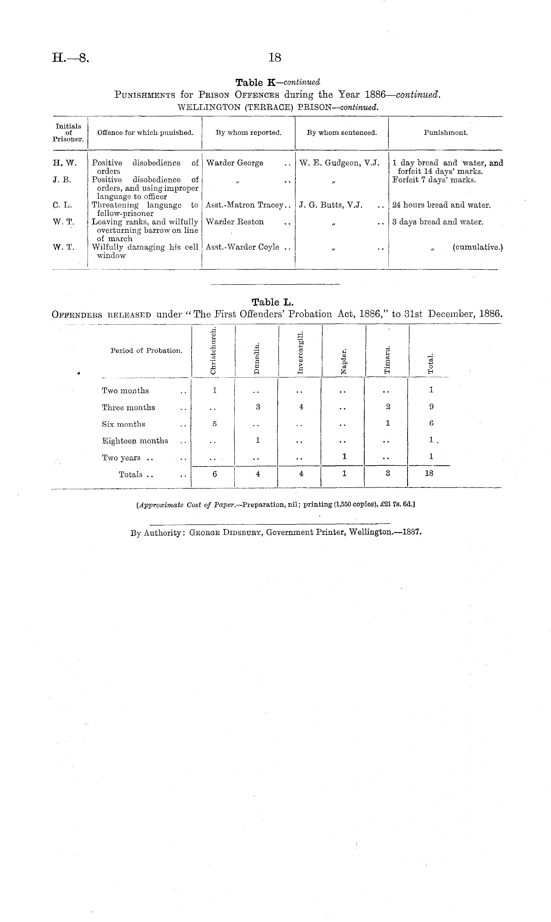 Table K—continued Punishments for Prison Offences during the Year 1886— continued. WELLINGTON (TERRACE) PRISON— continued.