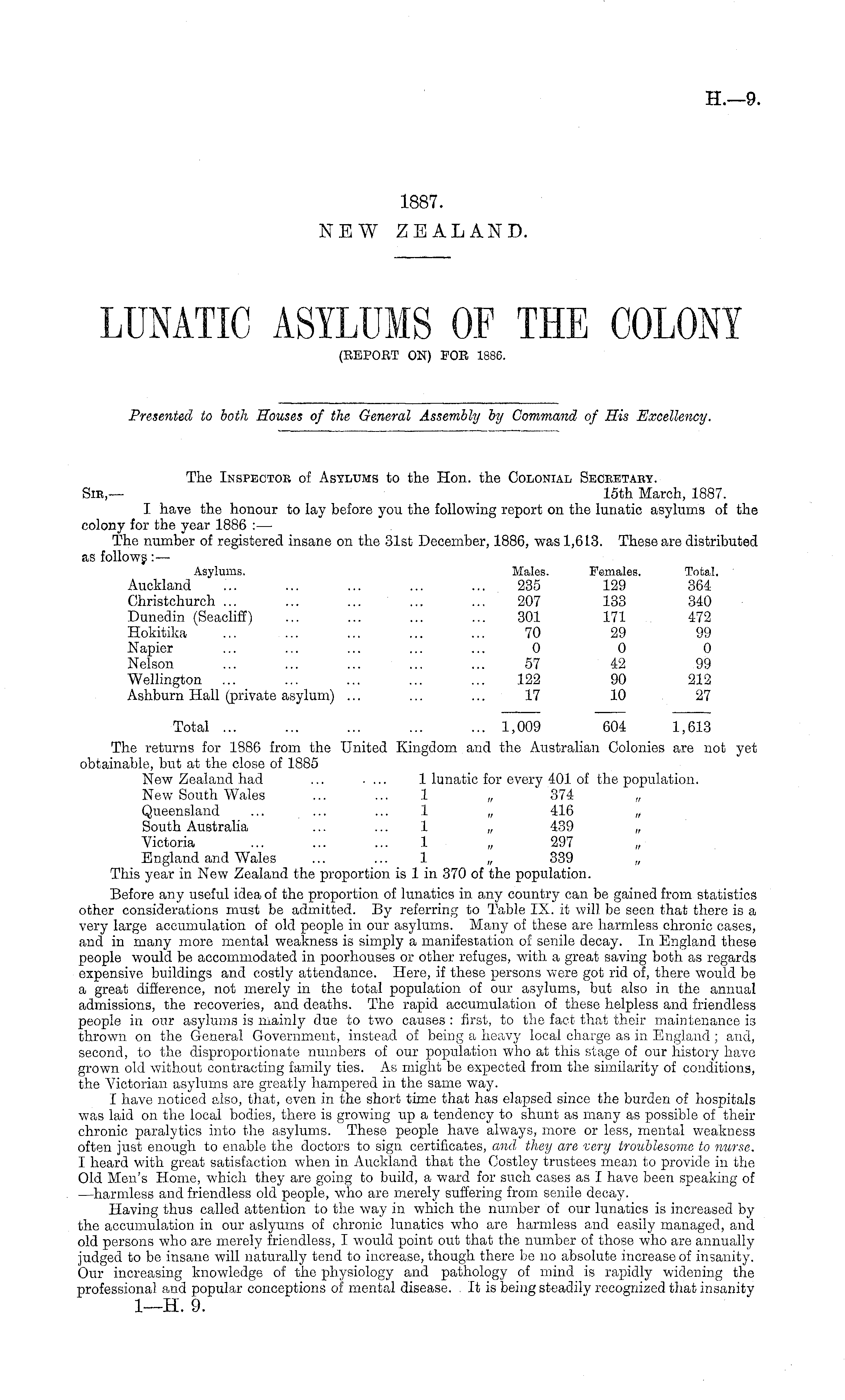 The Inspector of Asylums to the Hon. the Colonial Secretary. Sir — 15th March, 1887. I have the honour to lay before you the following report on the lunatic asylums of the colony for the year 1886 : — The number of registered insane on the 31st December, 1886, was 1,613. These are distributed as followj : — Asylums. Males. Females. Total. Auckland ... ... ... ... ... 235 129 364 Christchurch ... ... ... ... ... 207 133 340 Dunedin (Seaeliff) ... ... ... ... 301 171 472 Hokitika ... ... ... ... ... 70 29 99 Napier ... ... ... ... ... 0 0 0 Nelson ... ... ... ... ... 57 42 99 Wellington ... ... ... ... ... 122 90 212 Ashburn Hall (private asylum) ... ... ... 17 10 27 Total ... ... ... ... ... 1,009 604 1,613 The returns for 1886 from the United Kingdom and the Australian Colonies are not yet obtainable, but at the close of 1885 New Zealand had ... .... 1 lunatic for every 401 of the population. New South Wales ... ... 1 „ 374 Queensland ... ... ... 1 „ 416 „ South Australia ... ... 1 „ 439 „ Victoria ... ... ... 1 „ 297 „ England and Wales ... ... 1 „ 339 This year in New Zealand the proportion is 1 in 370 of the population. Before any useful idea of the proportion of lunatics in any country can be gained from statistics other considerations must be admitted. By referring to Table IX. it will be seen that there is a very large accumulation of old people in our asylums. Many of these are harmless chronic cases, and in many more mental weakness is simply a manifestation of senile decay. In England these people would be accommodated in poorhouses or other refuges, w xith a great saving both as regards expensive buildings and costly attendance. Here, if these persons were got rid of, there would be a great difference, not merely in the total population of our asylums, but also in the annual admissions, the recoveries, and deaths. The rapid accumulation of these helpless and friendless people in our asylums is mainly due to two causes : first, to the fact that their maintenance is thrown on the General Government, instead of being a heavy local charge as in England ; and, second, to the disproportionate numbers of our population who at this stage of our history have grown old without contracting family ties. As might be expected from the similarity of conditions, the Victorian asylums are greatly hampered in the same way. I have noticed also, that, even in the short time that has elapsed since the burden of hospitals was laid on the local bodies, there is growing up a tendency to shunt as many as possible of their chronic paralytics into the asylums. These people have always, more or less, mental weakness often just enough to enable the doctors to sign certificates, and they are very troublesome to nurse. I heard with great satisfaction when in Auckland that the Costley trustees mean to provide in the Old Men's Home, which they are going to build, a ward for such cases as I have been speaking of —harmless and friendless old people, who are merely suffering from senile decay. Having thus called attention to the way in which the number of our lunatics is increased by the accumulation in our aslyums of chronic lunatics who are harmless and easily managed, and old persons who are merely friendless, I would point out that the number of those who are annually judged to be insane w 7ill naturally tend to increase, though there be no absolute increase of insanity. Our increasing knowledge of the physiology and pathology of mind is rapidly widening the professional and popular conceptions of mental disease. . It is being steadilv recognized that insanity I—H. 9.