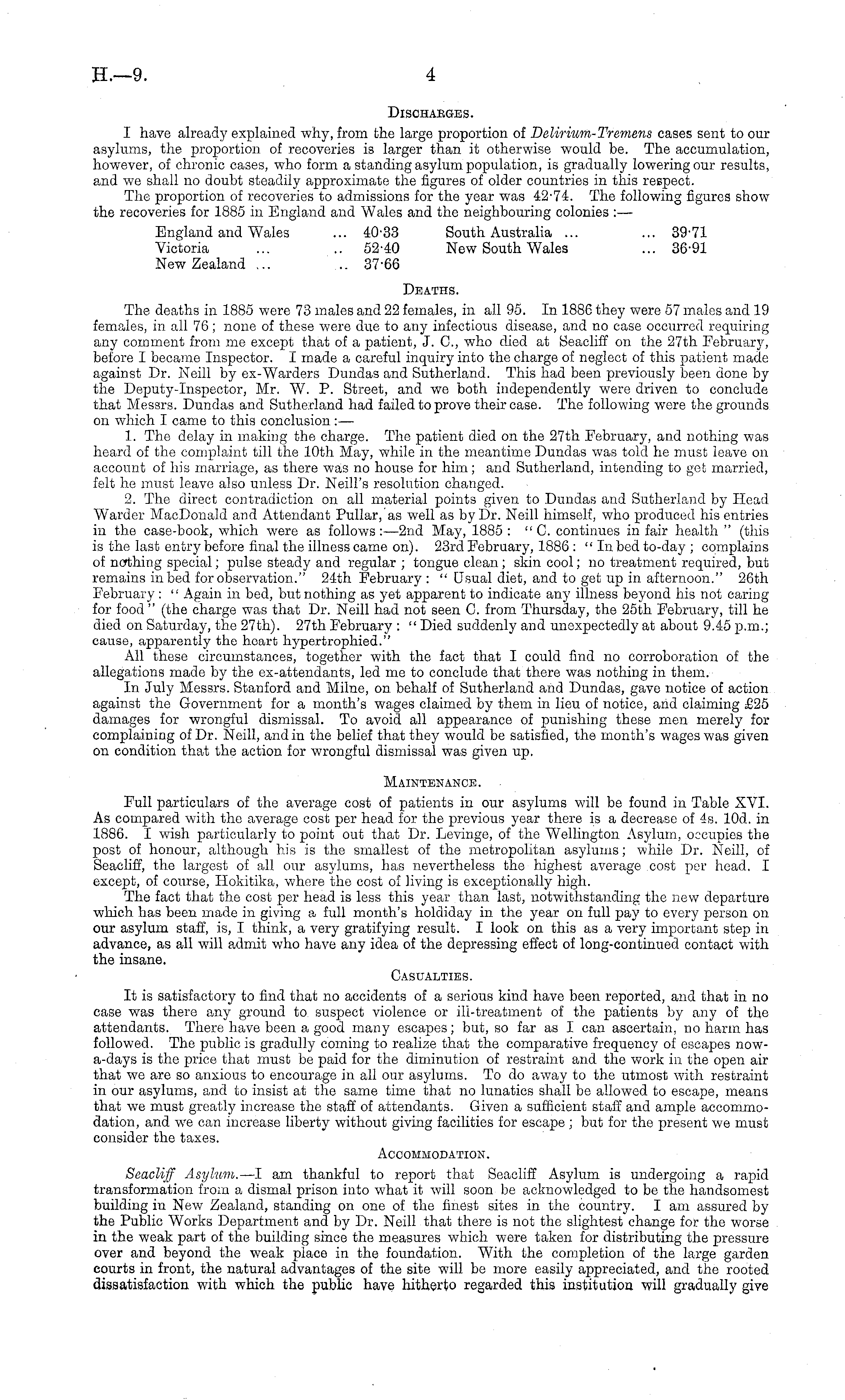 Discharges. I have already explained why, from the large proportion of Delirium-Tremens cases sent to our asylums, the proportion of recoveries is larger than it otherwise would be. The accumulation, however, of chronic cases, who form a standing asylum population, is gradually lowering our results, and we shall no doubt steadily approximate the figures of older countries in this respect. The proportion of recoveries to admissions for the year was 42-74. The following figures show the recoveries for 1885 in England and Wales and the neighbouring colonies : — England and Wales ... 40-33 South Australia ... ... 39-71 Victoria ... .. 52-40 New South Wales ... 36-91 New Zealand ... ... 37-66 Deaths. The deaths in 1885 were 73 males and 22 females, in all 95. In 1886 they were 57 males and 19 females, in all 76; none of these were due to any infectious disease, and no case occurred requiring any comment from me except that of a patient, J. C, who died at Seacliff on the 27th February, before I became Inspector. I made a careful inquiry into the charge of neglect of this patient made against Dr. Neill by ex-Warders Dnndas and Sutherland. This had been previously been done by the Deputy-Inspector, Mr. W. P. Street, and we both independently were driven to conclude that Messrs. Dundas and Sutherland had failed to prove their case. The following were the grounds on which I came to this conclusion:— 1. The delay in making the charge. The patient died on the 27th February, and nothing was heard of the complaint till the 10th May, while in the meantime Dundas was told he must leave on account of his marriage, as there was no house for him; and Sutherland, intending to get married, felt he must leave also unless Dr. Neill's resolution changed. 2. The direct contradiction on all material points given to Dundas and Sutherland by Head Warder MacDonald and Attendant Pullar, as well as by Dr. Neill himself, who produced his entries in the case-book, which were as follows : —2nd May, 1885 : " C. continues in fair health " (this is the last entry before final the illness came on). 23rd February, 1886 : "In bed to-day ; complains of nothing special; pulse steady and regular ; tongue clean ; skin cool; no treatment required, but remains in bed for observation." 24th February : " Usual diet, and to get up in afternoon." 26th February : " Again in bed, but nothing as yet apparent to indicate any illness beyond his not caring for food" (the charge was that Dr. Neill had not seen C. from Thursday, the 25th February, till he died on Saturday, the 27th). 27th February : " Died suddenly and unexpectedly at about 9.45 p.m.; cause, apparently the heart hypertrophied." All these circumstances, together with the fact that I could find no corroboration of the allegations made by the ex-attendants, led me to conclude that there was nothing in them. In July Messrs. Stanford and Milne, on behalf of Sutherland and Dundas, gave notice of action against the Government for a month's wages claimed by them in lieu of notice, and claiming £25 damages for wrongful dismissal. To avoid all appearance of punishing these men merely for complaining of Dr. Neill, and in the belief that they would be satisfied, the month's wages was given on condition that the action for wrongful dismissal was given up. Maintenance. Full particulars of the average cost of patients in our asylums will be found in Table XVI. As compared with the average cost per head for the previous year there is a decrease of 4s. lOd. in 1886. I wish particularly to point out that Dr. Levinge, of the Wellington Asylum, occupies the post of honour, although his is the smallest of the metropolitan asylums; while Dr. Neill, of Seacliff, the largest of all our asylums, has nevertheless the highest average cost per head. I except, of course, Hokitika, where the cost of living is exceptionally high. The fact that the cost per head is less this year than last, notwithstanding the new departure which has been made in giving a full month's holdiday in the year on full pay to every person on our asylum staff, is, I think, a very gratifying result. I look on this as a very important step in advance, as all will admit who have any idea of the depressing effect of long-continued contact with the insane. Casualties. It is satisfactory to find that no accidents of a serious kind have been reported, and that in no case was there any ground to suspect violence or ill-treatment of the patients by any of the attendants. There have been a good many escapes; but, so far as I can ascertain, no harm has followed. The public is gradully coming to realize that the comparative frequency of escapes now-a-days is the price that must be paid for the diminution of restraint and the work in the open air that we are so anxious to encourage in all our asylums. To do away to the utmost with restraint in our asylums, and to insist at the same time that no lunatics shall be allowed to escape, means that we must greatly increase the staff of attendants. Given a sufficient staff and ample accommodation, and we can increase liberty without giving facilities for escape ; but for the present we must consider the taxes. Accommodation. Seacliff Asylum. —l am thankful to report that Seacliff Asylum is undergoing a rapid transformation from a dismal prison into what it will soon be acknowledged to be the handsomest building in New Zealand, standing on one of the finest sites in the country. I am assured by the Public Works Department and by Dr. Neill that there is not the slightest change for the worse in the weak part of the building since the measures which were taken for distributing the pressure over and beyond the weak place in the foundation. With the completion of the large garden courts in front, the natural advantages of the site will be more easily appreciated, and the rooted dissatisfaction with which the public have hitherto regarded this institution will gradually give