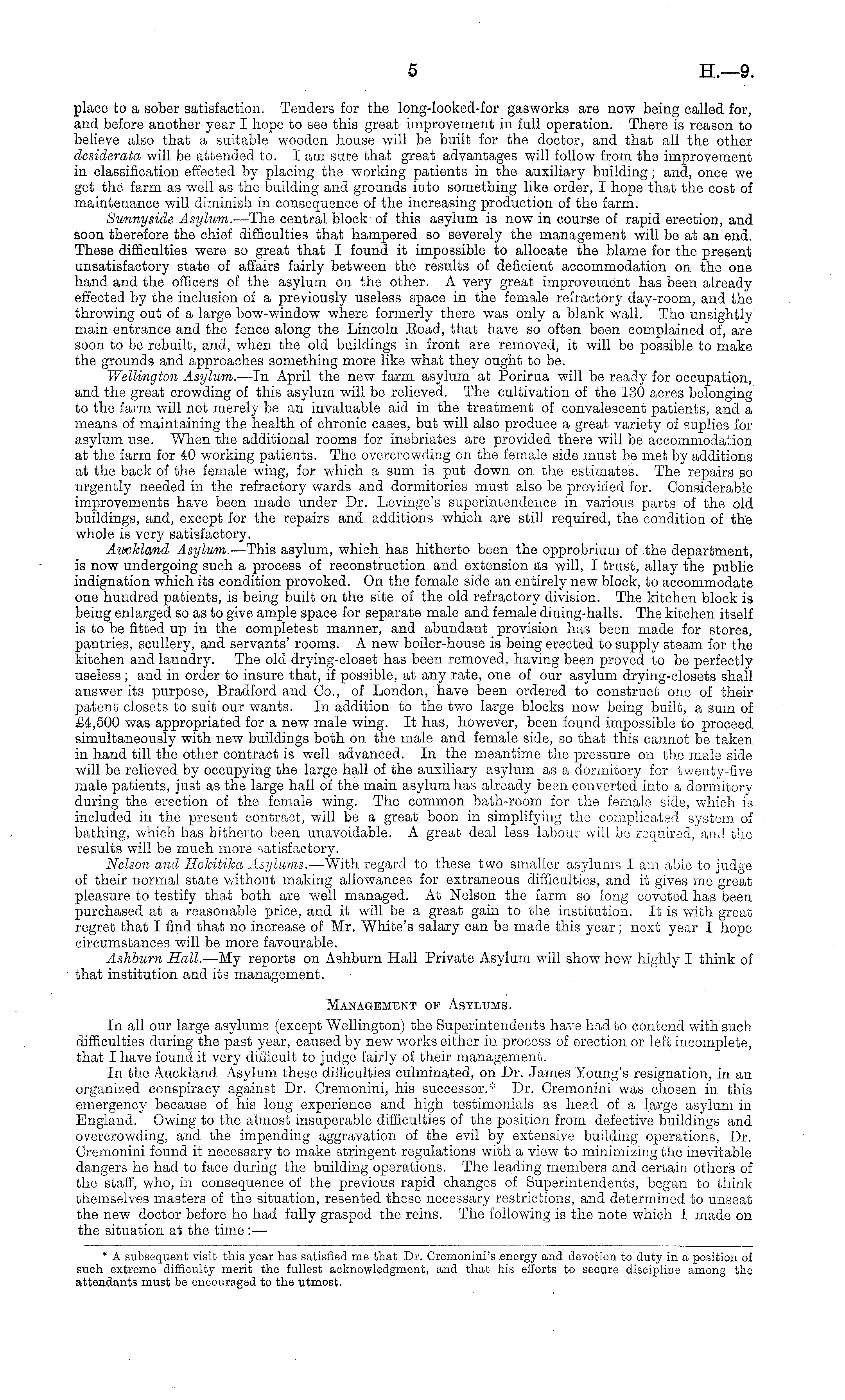 place to a sober satisfaction. Tenders for the long-looked-for gasworks are now being called for, and before another year I hope to see this great improvement in full operation. There is reason to believe also that a suitable wooden house will be built for the doctor, and that all the other desiderata will be attended to. lam sure that great advantages will follow from the improvement in classification effected by placing the working patients in the auxiliary building; and, once we get the farm as well as the building and grounds into something like order, I hope that the cost of maintenance will diminish in consequence of the increasing production of the farm. Sunnyside Asylum. —The central block of this asylum is now in course of rapid erection, and soon therefore the chief difficulties that hampered so severely the management will be at an end. These difficulties were so great that I found it impossible to allocate the blame for the present unsatisfactory state of affairs fairly between the results of deficient accommodation on the one hand and the officers of the asylum on the other. A very great improvement has been already effected by the inclusion of a previously useless space in the female refractory day-room, and the throwing out of a large bow-window where formerly there was only a blank wall. The unsightly main entrance and the fence along the Lincoln Eoad, that have so often been complained of, are soon to be rebuilt, and, when the old buildings in front are removed, it will be possible to make the grounds and approaches something more like what they ought to be. Wellington Asylum. —ln April the new farm asylum at Porirua will be ready for occupation, and the great crowding of this asylum will be relieved. The cultivation of the 130 acres belonging to the farm will not merely be an invaluable aid in the treatment of convalescent patients, and a means of maintaining the health of chronic cases, but will also produce a great variety of suplies for asylum use. When the additional rooms for inebriates are provided there will be accommodation at the farm for 40 working patients. The overcrowding on the female side must be met by additions at the back of the female wing, for which a sum is put down on the estimates. The repairs so urgently needed in the refractory wards and. dormitories must also be provided for. Considerable improvements have been made under Dr. Levinge's superintendence in various parts of the old buildings, and, except for the repairs and. additions which are still required, the condition of the whole is very satisfactory. Awckland Asylum. —This asylum, which has hitherto been the opprobrium of the department, is now undergoing such a process of reconstruction and extension as will, I trust, allay the public indignation which its condition provoked. On the female side an entirely new block, to accommodate one hundred patients, is being built on the site of the old refractory division. The kitchen block is being enlarged so as to give ample space for separate male and female diiiing-halls. The kitchen itself is to be fitted up in the completest manner, and abundant provision has been made for stores, pantries, scullery, and servants' rooms. A new boiler-house is being erected to supply steam for the kitchen and laundry. The old drying-closet has been removed, having been proved to be perfectly useless ; and in order to insure that, if possible, at any rate, one of our asylum drying-closets shall answer its purpose, Bradford and Co., of London, have been ordered to construct one of thenpatent closets to suit our wants. In addition to the two large blocks now being built, a sum of £4,500 was appropriated for a new male wing. It has, however, been found impossible to proceed simultaneously with new buildings both on the male and female side, so that this cannot be taken in hand till the other contract is well advanced. In the meantime the pressure on the male side will be relieved by occupying the large hall of the auxiliary asylum as a dormitory for twenty-five male patients, just as the large hall of the main asylum has already been converted into a dormitory during the erection of the female wing. The common bath-room for the female side, which is included in the present contract, will be a great boon in simplifying the complicated system, of bathing, which has hitherto been unavoidable. A great deal less labour will be required, and the results will be much more satisfactory. Nelson and Hokitika Asylums. —With regard to these two smaller asylums I am able to judge of their normal state without making allowances for extraneous difficulties, and it gives me great pleasure to testify that both are well managed. At Nelson the farm so long coveted has been purchased at a reasonable price, and it will be a great gain to the institution. It is with great regret that I find that no increase of Mr. White's salary can be made this year; next year I hope circumstances will be more favourable. Ashburn Hall. —My reports on Ashburn Hall Private Asylum will show how highly I think of that institution and its management. Management op Asylums. In all our large asylums (except Wellington) the Superintendents have had to contend with such difficulties during the past year, caused by new works either in process of erection or left incomplete, that I have found it very difficult to judge fairly of their management. In the Auckland Asylum these difficulties culminated, on Dr. James Young's resignation, in an organized conspiracy against Dr. Cremonini, his successor.* Dr. Cremonini was chosen in this emergency because of his long experience and high testimonials as head of a large asylum in England. Owing to the almost insuperable difficulties of the position from defective buildings and overcrowding, and the impending aggravation of the evil by extensive building operations, Dr. Cremonini found it necessary to make stringent regulations with a view to minimizing the inevi