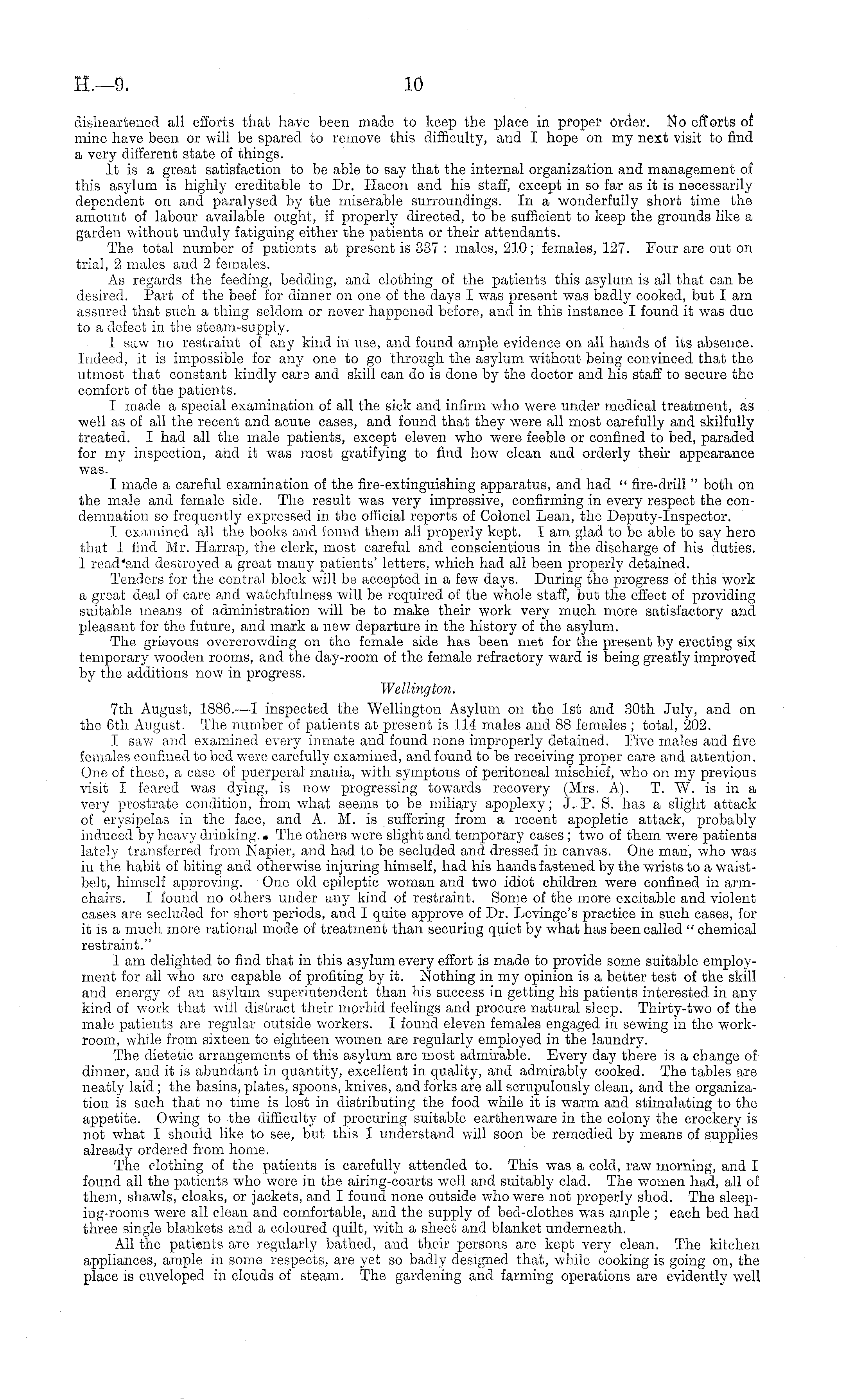disheartened all efforts that have been made to keep the place in propel- Order. No efforts of mine have been or will be spared to remove this difficulty, and I hope on my next visit to find a very different state of things. It is a great satisfaction to be able to say that the internal organization and management of this asylum is highly creditable to Dr. Hacon and his staff, except in so far as it is necessarily dependent on and paralysed by the miserable surroundings. In a wonderfully short time the amount of labour available ought, if properly directed, to be sufficient to keep the grounds like a garden without unduly fatiguing either the patients or their attendants. The total number of patients at present is 337 : males, 210; females, 127. Four are out on trial, 2 males and 2 females. As regards the feeding, bedding, and clothing of the patients this asylum is all that can be desired. Part of the beef for dinner on one of the days I was present was badly cooked, but lam assured that such a thing seldom or never happened before, and in this instance I found it was due to a defect in the steam-supply. I saw no restraint of any kind in use, and found ample evidence on all hands of its absence. Indeed, it is impossible for any one to go through the asylum without being convinced that the utmost that constant kindly care and skill can do is done by the doctor and his staff to secure the comfort of the patients. I made a special examination of all the sick and infirm who were under medical treatment, as well as of all the recent and acute cases, and found that they were all most carefully and skilfully treated. I had all the male patients, except eleven who were feeble or confined to bed, paraded for my inspection, and it was most gratifying to find how clean and orderly their appearance was. I made a careful examination of the fire-extinguishing apparatus, and had " fire-drill " both on the male and female side. The result was very impressive, confirming in every respect the condemnation so frequently expressed in the official reports of Colonel Lean, the Deputy-Inspector. 1 examined all the books and found them all properly kept. lam glad to be able to say here that I find Mr. Harrap, the clerk, most careful and conscientious in the discharge of his duties. I read'and destroyed a great many patients' letters, which had all been properly detained. Tenders for the central block will be accepted in a few days. During the progress of this work a great deal of care and watchfulness will be required of the whole staff, but the effect of providing suitable means of administration will be to make their work very much more satisfactory and pleasant for the future, and mark a new departure in the history of the asylum. The grievous overcrowding on the female side has been met for the present by erecting six temporary wooden rooms, and the day-room of the female refractory ward is being greatly improved by the additions now in progress. Wellington. 7th August, 1886.—1 inspected the Wellington Asylum on the Ist and 30th July, and on the 6th August. The number of patients at present is 114 males and 88 females ; total, 202. I saw and examined every inmate and found none improperly detained. Five males and five females confined to bed were carefully examined, and found to be receiving proper care and attention. One of these, a case of puerperal mania, with symptons of peritoneal mischief, who on my previous visit I feared was dying, is now progressing towards recovery (Mrs. A). T. W. is in a very prostrate condition, from what seems to be miliary apoplexy; J. P. S. has a slight attack of erysipelas in the face, and A. M. is suffering from a recent apopletic attack, probably induced by heavy drinking. • The others were slight and temporary cases; two of them were patients lately transferred from Napier, and had to be secluded and dressed in canvas. One man, who was in the habit of biting and otherwise injuring himself, had his hands fastened by the wrists to a waistbelt, himself approving. One old epileptic woman and two idiot children w Tere confined in armchairs. I found no others under any kind of restraint. Some of the more excitable and violent cases are secluded for short periods, and I quite approve of Dr. Levinge's practice in such cases, for it is a much more rational mode of treatment than securing quiet by what has been called " chemical restraint." I am delighted to find that in this asylum every effort is made to provide some suitable employment for all who are capable of profiting by it. Nothing in my opinion is a better test of the skill and energy of an asylum superintendent than his success in getting his patients interested in any kind of work that will distract their morbid feelings and procure natural sleep. Thirty-two of the male patients are regular outside workers. I found eleven females engaged in sewing in the workroom, while from sixteen to eighteen women are regularly employed in the laundry. The dietetic arrangements of this asylum are most admirable. Every day there is a change of dinner, and it is abundant in quantity, excellent in quality, and admirably cooked. The tables are neatly laid ; the basins, plates, spoons, knives, and forks are all scrupulously clean, and the organization is such that no time is lost in distributing the food while it is warm and stimulating to the appetite. Owing to the difficulty of procuring suitable earthenware in the colony the crockery is not what I should like to see, but this I understand will soon be remedied by means of supplies already ordered from home. The clothing of the patients is carefully attended to. This was a cold, raw morning, and I found all the patients who were in the airing-courts well and suitably clad. The women had, all of them, shawls, cloaks, or jackets, and I found none outside who were not properly shod. The sleep-ing-rooms were all clean and comfortable, and the supply of bed-clothes was ample ; each bed h