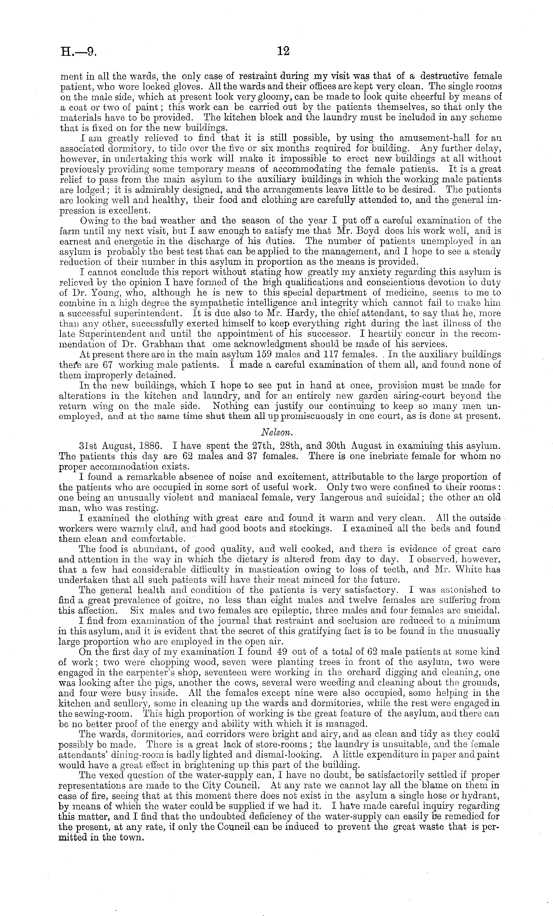 ment in all the wards, the only case of restraint during my visit was that of a destructive female patient, who wore locked gloves. All the wards and their offices are kept very clean. The single rooms on the male side,' which at present look very gloomy, can be made to look quite cheerful by means of a coat or two of paint; this work can be carried out by the patients themselves, so that only the materials have to be provided. The kitchen block and the laundry must be included in any scheme that is fixed on for the new buildings. I am greatly relieved to find that it is still possible, by using the amusement-hall for an associated dormitory, to tide over the five or six months required for building. Any further delay, however, in undertaking this work will make it impossible to erect new buildings at all without previously providing some temporary means of accommodating the female patients. It is a great relief to pass from the main asylum to the auxiliary buildings in which the working male patients are lodged ; it is admirably designed, and the arrangements leave little to be desired. The patients are looking well and healthy, their food and clothing are carefully attended to, and the general impression is excellent. Owing to the bad weather and the season of the year I put off a careful examination of the farm until my next visit, but I saw enough to satisfy me that Mr. Boyd does his work well, and is earnest and energetic in the discharge of his duties. The number of patients unemployed in an asylum is probably the best test that can be applied to the management, and 1 hope to see a steady reduction of their number in this asylum in proportion as the means is provided. I cannot conclude this report without stating how greatly my anxiety regarding this asylum is relieved by the opinion I have formed of the high qualifications and conscientious devotion to duty of Dr. Young, who, although he is new to this special department of medicine, seems to me to combine in a high degree the sympathetic intelligence and integrity which cannot fail to make him a successful superintendent. It is due also to Mr. Hardy, the chief attendant, to say that he, more than any other, successfully exerted himself to keep everything right during the last illness of the late Superintendent and until the appointment of his successor. I heartily concur in the recommendation of Dr. Grabham that ome acknowledgment should be made of his services. At present there are in the main asylum 159 males and 117 females. . In the auxiliary buildings thei'e are 67 working male patients. I made a careful examination of them all, and found none of them improperly detained. In the new buildings, which I hope to see put in hand at once, provision must be made for alterations in the kitchen and laundry, and for an entirely new garden airing-court beyond the return wing on the male side. Nothing can justify our continuing to keep so many men unemployed, and at the same time shut them all up promiscuously in one court, as is done at present. Nelson. 31st August, 1886. I have spent the 27th, 28th, and 30th August in examining this asylum. The patients this day are 62 males and 37 females. There is one inebriate female for whom no proper accommodation exists. I found a remarkable absence of noise and excitement, attributable to the large proportion of the patients who are occupied in some sort of useful work. Only two were confined to their rooms : one being an unusually violent and maniacal female, very dangerous and suicidal; the other an old man, who was resting. I examined the clothing with great care and found it warm and very clean. All the outside workers were warmly clad, and had good boots and stockings. I examined all the beds and found them clean and comfortable. The food is abundant, of good quality, and well cooked, and there is evidence of great care and attention in the way in which the dietary is altered from day to day. I observed, however, that a few had considerable difficulty in mastication owing to loss of teeth, and Mr. White has undertaken that all such patients will have their meat minced for the future. The general health and condition of the patients is very satisfactory. I was astonished to find a great prevalence of goitre, no less than eight males and twelve females are suffering from this affection. Six males and two females are epileptic, three males and four females are suicidal. I find from examination of the journal that restraint and seclusion are reduced to a minimum in this asylum, and it is evident that the secret of this gratifying fact is to be found in the unusually large proportion who are employed in the open air. On the first day of my examination I found 49 out of a total of 62 male patients at some kind of work; two were chopping wood, seven were planting trees in front of the asylum, two were engaged in the carpenter's shop, seventeen were working in the orchard digging and cleaning, one was looking after the pigs, another the cows, several were weeding and cleaning about the grounds, and four were busy inside. All the females except nine were also occupied, some helping in the kitchen and scullery, some in cleaning up the wards and dormitories, while the rest were engaged in the sewing-room. This high proportion of working is the great feature of the asylum, and there can be no better proof of the energy and ability with which it is managed. The wards, dormitories, and corridors were bright and airy, and as clean and tidy as they could possibly be made. There is a great lack of store-rooms ; the laundry is unsuitable, and the female attendants' dining-room is badly lighted and clismal-looking. A little expenditure in paper and paint would have a great effect in brightening up this part of the building. The vexed question of the water-supply can, I have no doubt, be satisfactorily settled if proper representations are made to the City Council. At any rate we cannot lay all the blame on 