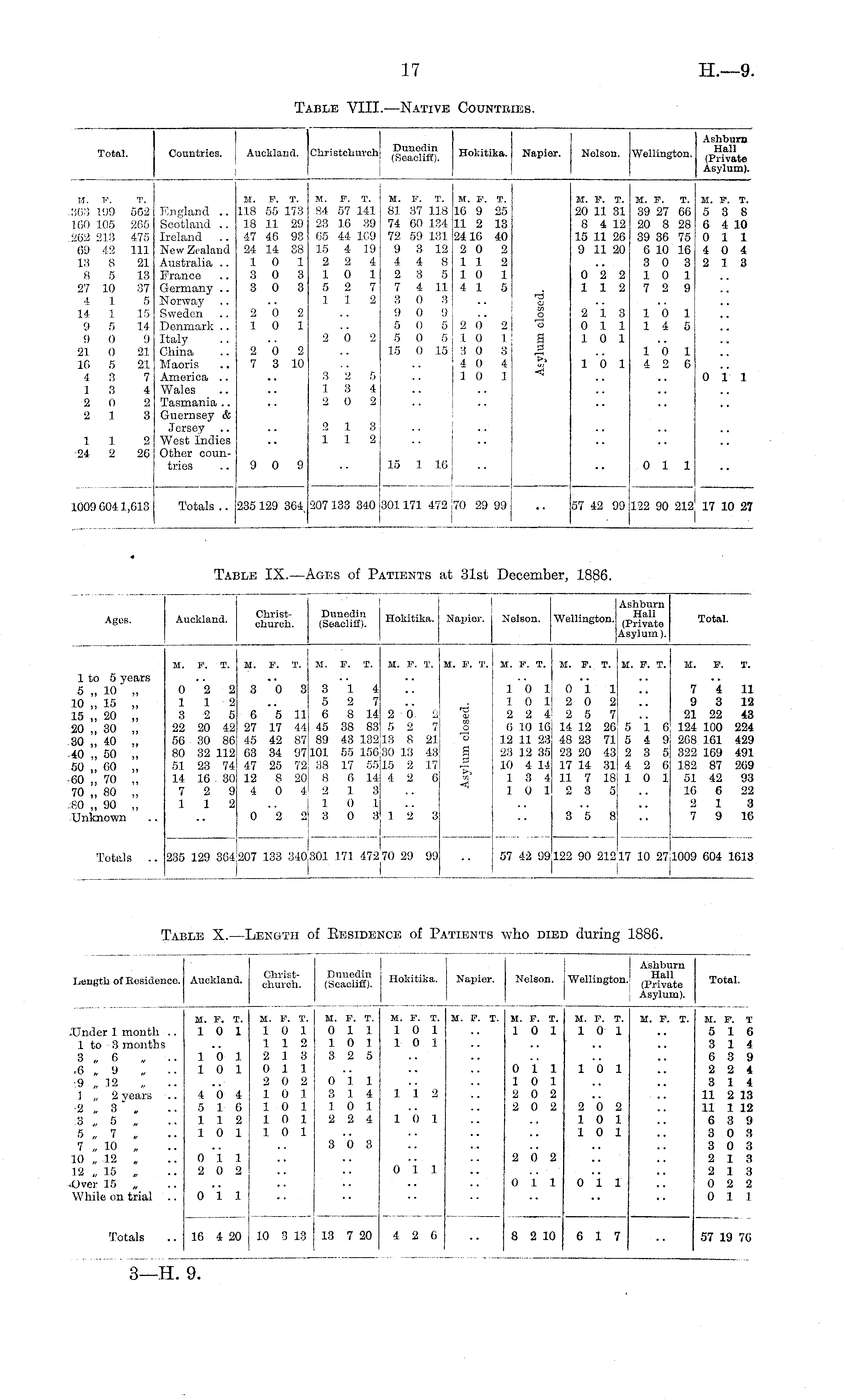Total. Countries. Auckland. Christchurch Dunedin (Seacliff). Hokitika. Napier. Nelson. Wellington. Ashburn Hall (Private Asylum). 1,1. v. 303 199 160 105 262 213 69 42 13 8 8 5 27 10 4 1 14 1 9 5 9 0 21 0 16 5 4 3 1 3 2 0 2 1 T. 562 265 475 111 21 13 37 5 15 14 9 21 21 7 4 2 3 England .. Scotland .. Ireland New Zealand Australia .. France Germany .. Norway Sweden Denmark .. Italy China Maoris America .. Wales Tasmania .. Guernsey & Jersey West Indies Other countries St. P. T. 118 55 173 18 11 29 47 46 93 24 14 38 10 1 3 0 3 3 0 3 St. F. T. 84 57 141 23 16 39 65 44 109 15 4 19 2 2 4 10 1 5 2 7 1 1 2 St. F. T. 81 37 118 74 60 134 72 59 131 9 3 12 4 4 8 2 3 5 7 4 11 3 0 3 9 0 9 5 0 5 5 0 5 15 0 15 St. F. T. 16 9 25 11 2 13 2416 40 2 0 2 11 2 10 1 4 15 M. F. T. 20 11 31 8 4 12 15 11 26 9 11 20 SI. F. T. 39 27 66 20 8 28 39 36 75 6 10 16 3 0 3 10 1 7 2 9 SI. F. T. 5 3 8 6 4 10 0 11 4 0 4 2 1 3 0 *2 2 112 2 0 2 10 1 2 0 2 2 0 2 | 1 0 1 | 3 0 3 ; 4 0 4 | 1 0 1 ••3 o o o B 2 13 0 11 10 1 10 1 14 5 2 0 2 7 3 10 10 1 10 1 4 2 6 3 2 5 1 3 4 2 0 2 0 1 1 1 1 24 2 2 26 2 1 3 1 1 2 9 0 9 15 1 16 0 11 1009 0041,613 Totals .. 235 129 364, 207133 340 301171 472 170 29 99 57 42 99 122 90 212 17 10 27