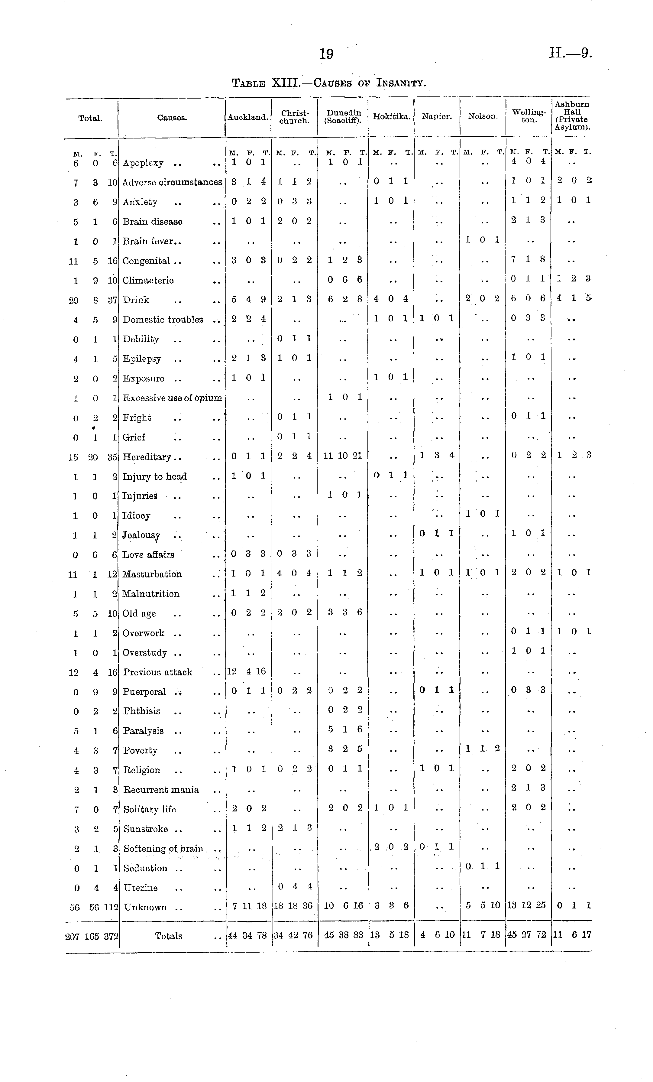 Total. Causes. Auckland. Christchurch. Dunodin (Seacliff). Hokitika. Napier. Nelson. Wellington. Aahburn Hall (Private Asylum). M. F. T. 6 0 6 SI. F. T. 10 1 M. F. T. M. F. T. 10 1 M. F. T. M. F. T. 31. F. T. M. F. T. 4 0 4 M. F. T. Apoplexy 7 3 10 Adverse circumstances 3 14 112 Oil 1 0 1 2 0 2: 3 6 9 Anxiety 0 2 2 0 3 3 10 1 112 1 0 1 5 16 Brain disease 10 1 2 0 2 2 1 3 10 1 Brain fever.. 10 1 11 5 16 Congenital 3 0 3 0 2 2 12 3 7 18 1 9 10 Climacterio 0 G 6 0 1 1 12 3 29 8 37 Drink 5 4 9 2 13 6 2 8 4 0 4 2 0 2 6 0 6 4 154 5 9 Domestic troubles .. 2 2 4 10 1 10 1 0 3 3 Oil Debility Oil 4 1 5 Epilepsy 2 13 10 1 10 1 2 0 2 Exposure 10 1 1 0 1 10 1 Excessive use of opium 10 1 0 2 2 Fright Oil Oil a 011 Grief :. 0 1 1 15 20 35 Hereditary Oil 2 2 4 11 10 21 13 4 0 2 2 1 2 3 1 1 2 Injury to bead 10 1 Oil 10 1 Injuries 10 1 10 1 Idiocy 10 1 112 Jealousy Oil 10 1 0 G 6 Love affairs 0 3 3 0 3 3 11 1 12 Masturbation 10 1 4 0 4 112 10 1 10 1 2 0 2 10 1 112 Malnutrition 112 5 5 10 Old age 0 2 2 2 0 2 3 3 6 1 1 2 Overwork Oil 10 1 10 1 Overstudy 10 1 12 4 16 Previous attack 12 4 16 0 9 9 Puerperal .', Oil 0 2 2 0 2 2 Oil 0 3 3 0 2 2 Phthisis 0 2 2 5 16 Paralysis 5 16 4 3 7 Poverty 3 2 5 112 4 3 7 Eeligion 10 1 0 2 2 0 11 10 1 2 0 2 2 13 Recurrent mania 2 13 7 0 7 Solitary life 2 0 2 2 0 2 10 1 2 0 2 3 2 5 Sunstroke 112 2 13 2 13 Softening of brain .. 2 0 2 0 1 1 Oil Seduction Oil 0 4 4 Uterine 0 4 4 56 50 112 Unknown .. 7 11 18 18 18 3G 10 6 16 3 3 G 5 5 10 13 12 25 Oil !07 165 372 Totals 44 34 78 134 42 76 45 38 83 13 5 18 4 6 10 11 7 18 45 27 72 11 6 r