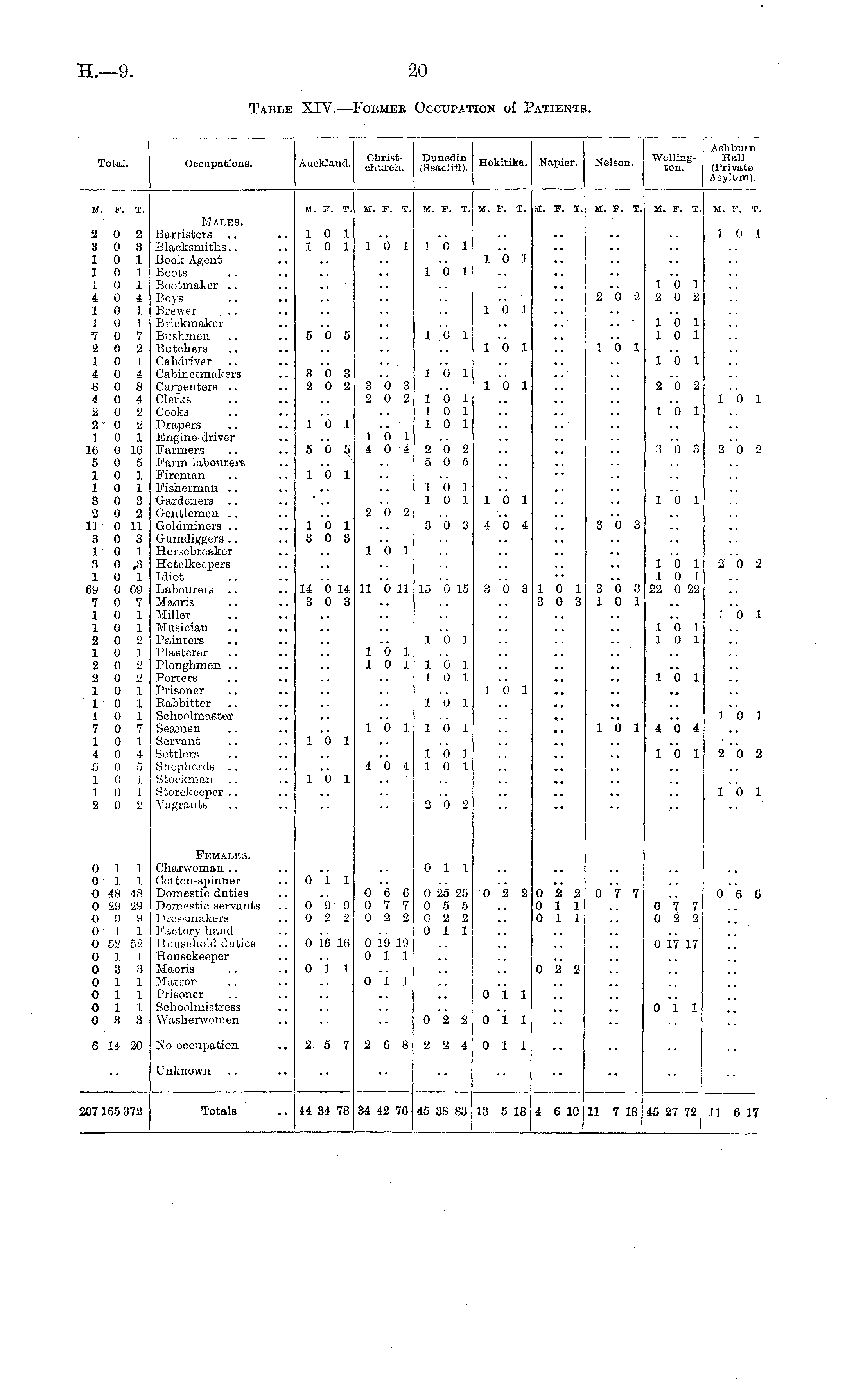 Total. Occupations. Auckland. Christchurch. Dunedin (Seacllff). Hokitika. Napier. Kelson. Wellington. Ashbirrn Hall (Private Asylum). M. F. T. M. F. T. M. P. T. K. P. T. M. F. T. M. P. T. M. P. T. M. F. 1. M. F. T. 2 0 2 3 0 3 10 1 1 0 1 10 1 4 0 4 1 0 1 10 1 7 0 7 2 0 2 10 1 4 0 4 8 0 8 4 0 4 2 0 2 2 0 2 10 1 16 0 16 5 0 5 1 0 1 10 1 3 0 3 2 0 2 11 0 11 3 0 3 10 1 8 0 ,3 10 1 69 0 69 7 0 7 10 1 10 1 2 0 2 10 1 2 0 2 2 0 2 10 1 10 1 10 1 7 0 7 10 1 4 0 4 5 0 5 1 0 1 10 1 2 0 2 Males. 10 1 10 1 10 1 Barristers Blacksmiths.. Book Agent Boots Bootmaker .. Boys Brewer Brickmaker Bushmen Butchers Cabdriver Cabinetmakers Carpenters .. Clerks Cooks Drapers Engine-driver Farmers Farm labourers Fireman Fisherman .. Gardeners Gentlemen .. Goklminers .. Gumdiggers .. Horsebreaker Hotolkeepers Idiot Labourers Maoris Miller Musician Painters Plasterer Ploughmen .. Porters Prisoner Rabbitter Schoolmaster Seamen Servant Settlors Shepherds .. Stockman Storekeeper .. Vagrants 10 1 10 1 1 6 1 10 1 2 "6 2 10 1 2 0 2 1 0 1 5 0 5 1 0 1 10 1 10 1 10 1 10 1 3 0 3 2 0 2 i "6 i 10 1 3 0 3 2 0 2 10 1 10 1 10 1 i '6 i 2 '6 2 1 '6 1 1 0 1 10 1 10 1 4 0 4 5 '6 5 2 'o 2 5 0 6 3 0 3 2 0 2 1 *0 1 1 0 1 1 0 1 2 *0 2 10 1 10 1 10 1 3 0 3 8 0 8 4 0 4 3 '6 3 10 1 14 '6 14 3 0 3 ii '6 ii 15 0 15 8 0 3 3 0 3 10 1 10 1 10 1 22 0 22 2 0 2 10 1 3 0 3 10 1 10 1 1 "o 1 i '6 i 10 1 i 6 i i 6 L 10 1 10 1 1 0 1 1 0 1 i o i 1 0 1 1 "6 1 4 0 4 10 1 1 0 ] 4 0 4 1 0 1 1 0 1 10 1 2**0 2 10 1 2 0 2 10 1 0 1 1 0 1 1 0 48 48 0 29 29 0 9 9 0 1 1 0 52 52 0 11 0 3 3 0 11 Oil Oil 0 3 3 Females. Charwoman .. Cotton-spinner Domestic duties Domestic servants Dressmakers Factory hand 11 ousehold duties Housekeeper Maoris Matron Prisoner Schoolmistress Washerwomen oil Oil 0 *9 9 0 2 2 0 6 0 0 7 7 0 2 2 0 25 25 0 5 5 0 2 2 Oil 0 2 2 0 2 2 Oil Oil 0 *7 7 0 "i 7 0 2 2 0 6 6 0 16 16 0 19 19 0 1 1 0 17 17 Oil 0 1 1 o a 2 oil 0 *2 2 oil 0 1 1 6 14 20 No occupation 2 5 7 2 6 8 2 2 4 Oil Unknown 17 165 372 Totals 44 34 78 34 42 76 45 38 83 13 5 18 4 6 10 11 7 18 45 27 72 11 6 17