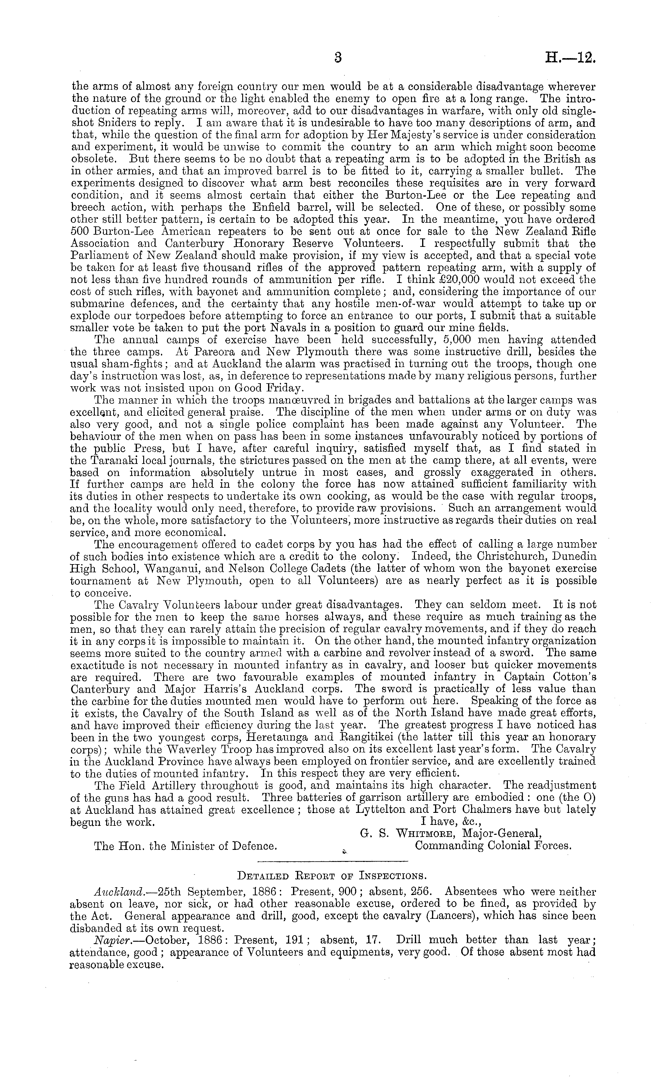 Detailed Eepokt op Inspections. Auckland. —2sth September, 1886: Present, 900 ; absent, 256. Absentees who were neither absent on leave, nor sick, or had other reasonable excuse, ordered to be fined, as provided by the Act. General appearance and drill, good, except the cavalry (Lancers), which has since been disbanded at its own request. Napier. —October, 1886: Present, 191; absent, 17. Drill much better than last year; attendance, good ; appearance of Volunteers and equipments, very good. Of those absent most had reasonable excuse.