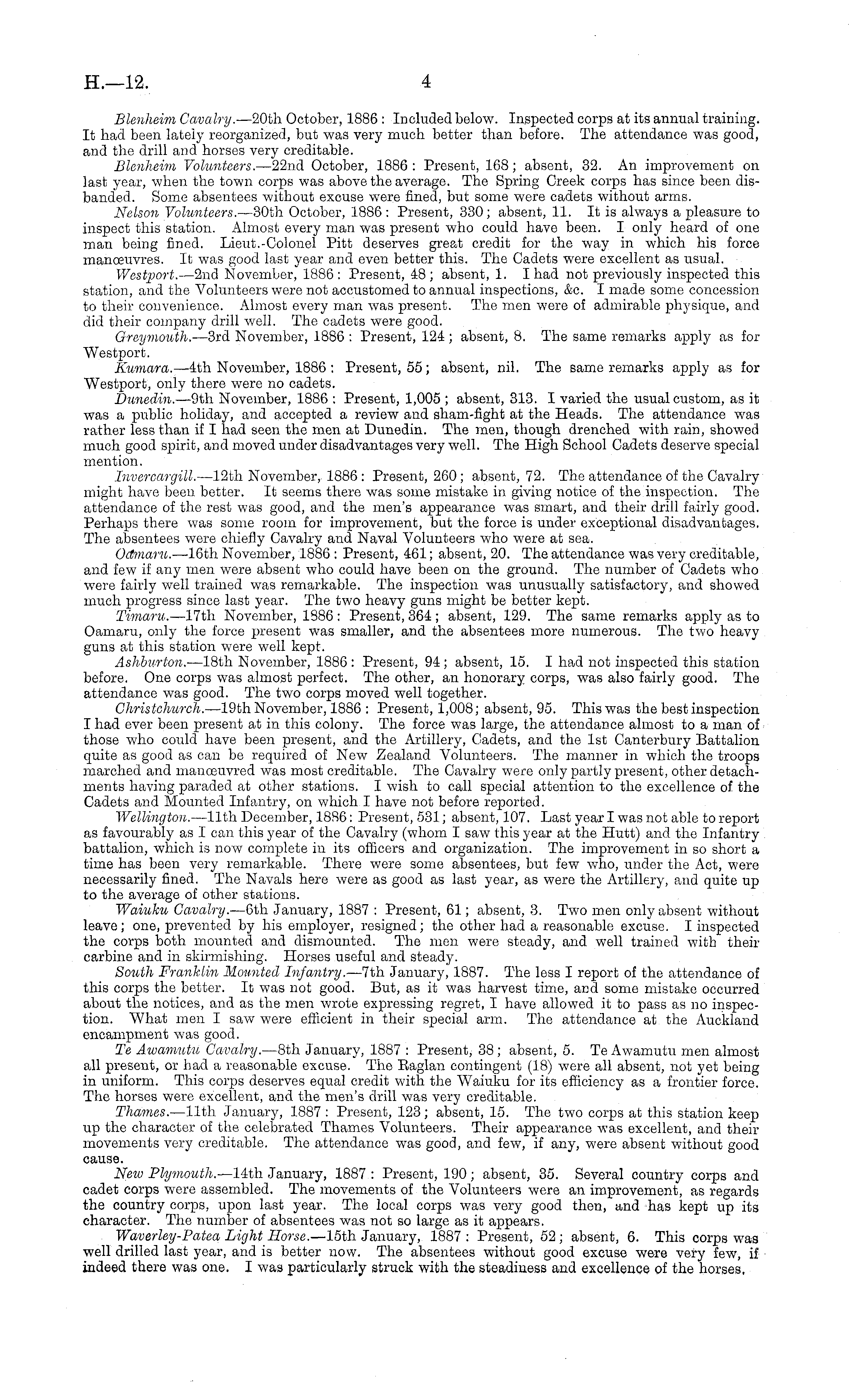 Blenheim Cavalry. —2oth October, 1886 : Included below. Inspected corps at its annual training. It had been lately reorganized, but was very much better than before. The attendance was good, and the drill and horses very creditable. Blenheim Volunteers. —22nd October, 1886 : Present, 168; absent, 32. An improvement on last year, when the town corps was above the average. The Spring Creek corps has since been disbanded. Some absentees without excuse were fined, but some were cadets without arms. Nelson Volunteers. —3oth October, 1886: Present, 330; absent, 11. It is always a pleasure to inspect this station. Almost every man was present who could have been. I only heard of one man being fined. Lieut.-Colonel Pitt deserves great credit for the way in which his force manoeuvres. It was good last year and even better this. The Cadets were excellent as usual. Westporl. —2nd November, 1886 : Present, 48 ; absent, 1. I had not previously inspected this station, and the Volunteers were not accustomed to annual inspections, &c. I made some concession to their convenience. Almost every man was present. The men were of admirable physique, and did their company drill well. The cadets were good. Greymouth. —3rd November, 1886 : Present, 124 ; absent, 8. The same remarks apply as for Westport. Kumara. —4th November, 1886 : Present, 55; absent, nil. The same remarks apply as for Westport, only there were no cadets. Dunedin. —9th November, 1886 : Present, 1,005 ; absent, 313. I varied the usual custom, as it was a public holiday, and accepted a review and sham-fight at the Heads. The attendance was rather less than if I had seen the men at Dunedin. The men, though drenched with rain, showed much good spirit, and moved under disadvantages very well. The High School Cadets deserve special mention. Invercargill. —l2th November, 1886 : Present, 260; absent, 72. The attendance of the Cavalry might have been better. It seems there was some mistake in giving notice of the inspection. The attendance of the rest was good, and the men's appearance was smart, and their drill fairly good. Perhaps there was some room for improvement, but the force is under exceptional disadvantages. The absentees were chiefly Cavalry and Naval Volunteers who were at sea. Odmaru. —16th November, 1886 : Present, 461; absent, 20. The attendance was very creditable, and few if any men were absent who could have been on the ground. The number of Cadets who were fairly well trained was remarkable. The inspection was unusually satisfactory, and showed much progress since last year. The two heavy guns might be better kept. Timaru. —l7th November, 1886: Present, 364 ; absent, 129. The same remarks apply as to Oamaru, only the force present was smaller, and the absentees more numerous. The two heavy guns at this station were well kept. Ashburton. —18th November, 1886 : Present, 94 ; absent, 15. I had not inspected this station before. One corps was almost perfect. The other, an honorary corps, was also fairly good. The attendance was good. The two corps moved well together. Christchurch. —l9th November, 1886 : Present, 1,008; absent, 95. This was the best inspection I had ever been present at in this colony. The force was large, the attendance almost to a man of those who could have been present, and the Artillery, Cadets, and the Ist Canterbury Battalion quite as good as can be required of New Zealand Volunteers. The manner in which the troops marched and manoeuvred was most creditable. The Cavalry were only partly present, other detachments having paraded at other stations. I wish to call special attention to the excellence of the Cadets and Mounted Infantry, on which I have not before reported. Wellington. —llth December, 1886: Present, 531; absent, 107. Last year I was not able to report as favourably as I can this year of the Cavalry (whom I saw this year at the Hutt) and the Infantry battalion, which is now complete in its officers and organization. The improvement in so short a time has been very remarkable. There were some absentees, but few who, under the Act, were necessarily fined. The Navals here were as good as last year, as were the Artillery, and quite up to the average of other stations. Waiuku Cavalry. —6th January, 1887 : Present, 61; absent, 3. Two men only absent without leave; one, prevented by his employer, resigned; the other had a reasonable excuse. I inspected the corps both mounted and dismounted. The men were steady, and well trained with their carbine and in skirmishing. Horses useful and steady. South Franklin Mounted Infantry. —7th January, 1887. The less I report of the attendance of this corps the better. It was not good. But, as it was harvest time, and some mistake occurred about the notices, and as the men wrote expressing regret, I have allowed it to pass as no inspection. What men I saw were efficient in their special arm. The attendance at the Auckland encampment was good. Te Awamutu Cavalry. —Bth January, 1887 : Present, 38 ; absent, 5. Te Awamutu men almost all present, or had a reasonable excuse. The Eaglan contingent (18) were all absent, not yet being in uniform. This corps deserves equal credit with the Waiuku for its efficiency as a frontier force. The horses were excellent, and the men's drill was very creditable. Thames. —llth January, 1887 : Present, 123; absent, 15. The two corps at this station keep up the character of the celebrated Thames Volunteers. Their appearance was excellent, and their movements very creditable. The attendance was good, and few, if any, were absent without good cause. New Plymouth. —l4th January, 1887 : Present, 190; absent, 35. Several country corps and cadet corps were assembled. The movements of the Volunteers were an improvement, as regards the country corps, upon last year. The local corps was very good then, and has kept up its character. The number of absentees was not so large as it appears. Waverley-Patea Light Horse. —lst