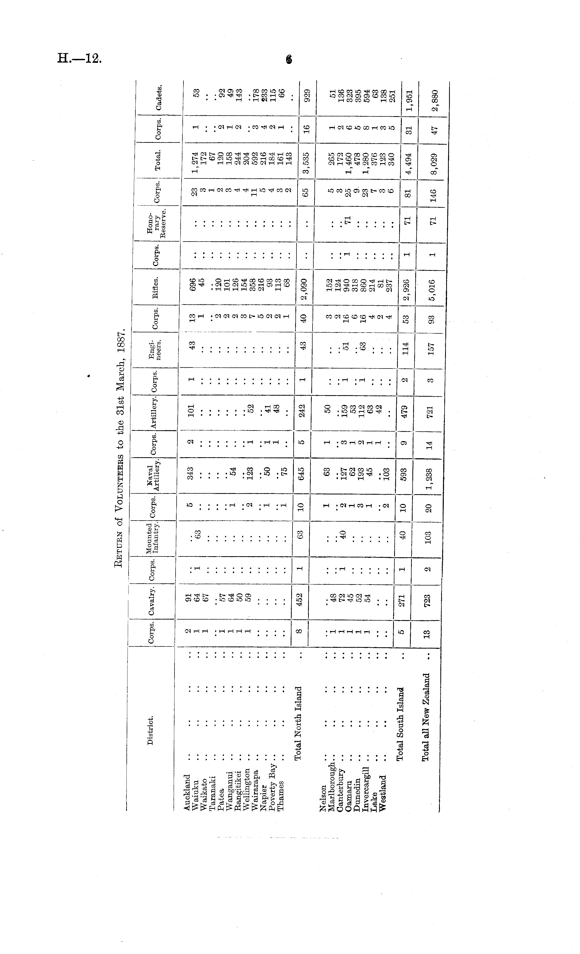 District. Corps. Cavalry. Corps. Mounted Infantry. CorpE. Naval Artillery. Corps. Artillery. Corps. Engineers. Corps. Bines. HonoCorps. rary Reserve. Corps. Total. Corps. Cadeti Auckland Waiuku Waikato Taranaki Patea Wangarmi Eangitikei Wellington .. Wairarapa Napier Poverty Bay Thames 2 1 1 1 1 1 1 91 64 67 57 64 50 59 1 63 J 5 I 1 343 54 2 I 101 1 43 : i •• ! : 13 1 2 2 3 7 5 2 696 45 120 101 126 154 358 216 93 113 68 •• •• 23 3 1 2 3 4 4 11 5 4 3 2 1,274 172 67 120 158 244 204 592 216 184 161 143 1 2 1 2 53 92 49 143 _ 123 1 '52 [ I 3 4 2 1 178 233 115 66 i ■■ I 50 1 1 41 48 - i 75 •• I Total North Island 8 452 i 1 63 10 645 5 1 43 40 I I | 65 3,535 16 242 2,090 929 Nelson Marlborough Canterbury Oamaru Dunedin Invercargill Lake .. Westland -I | . I i i 1 1 1 1 1 l 63 1 I 48 72 45 52 54 1 40 2 1 3 1 127 62 193 45 3 1 2 1 1 I 50 159 53 112 63 42 1 51 3 16 6 i 16 I _ 152 124 940 318 860 214 81 237 1 71 5 3 25 9 23 7 3 6 265 172 1,460 478 1,280 376 123 340 1 2 6 5 8 1 3 5 51 136 323 395 594 63 138 251 1 63 j i - 2 103 •• Total South Island 5 271 I I 1 40 i 10 593 M i_ 479 114 53 1 71 I 2 2,926 81 4,494 31 1,951 _____ I i i I I I Total all New Zealand 13 I' I i i 723 2 103 20 1,238 u 721 3 157 I 5,016 146 8,029 I 47 93 71 2,880