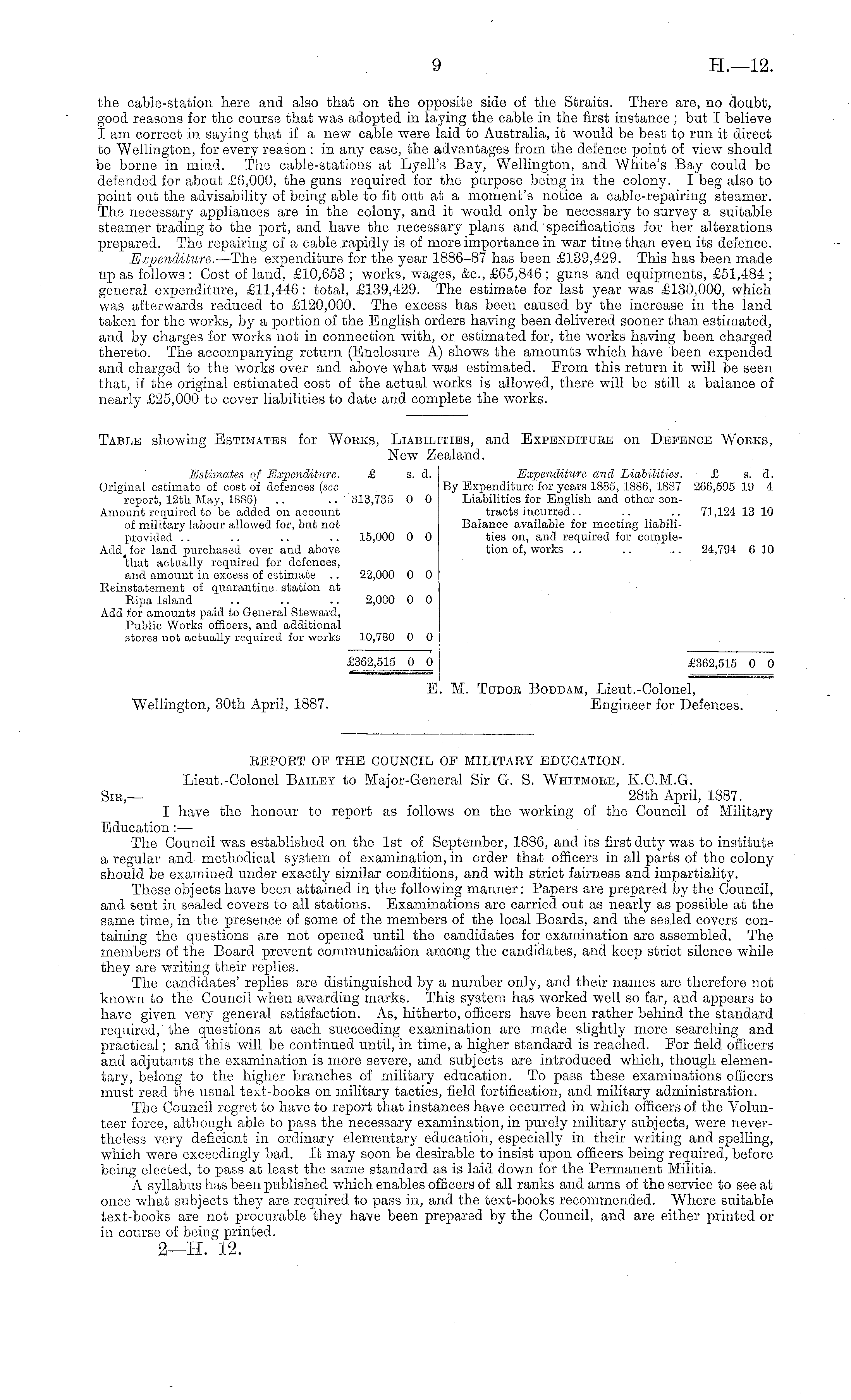 the cable-station here and also that on the opposite side of the Straits. There are, no doubt, good reasons for the course that was adopted in laying the cable in the first instance; but I believe I am correct in saying that if a new cable were laid to Australia, it would be best to run it direct to Wellington, for every reason : in any case, the advantages from the defence point of view should be borne in mind. The cable-stations at Lyell's Bay, Wellington, and White's Bay could be defended for about £6,000, the guns required for the purpose being in the colony. I beg also to point out the advisability of being able to fit out at a moment's notice a cable-repairing steamer. The necessary appliances are in the colony, and it would only be necessary to survey a suitable steamer trading to the port, and have the necessary plans and specifications for her alterations prepared. The repairing of a cable rapidly is of more importance in war time than even its defence. Expenditure. —The expenditure for the year 1886-87 has been £139,429. This has been made up as follows : Cost of land, £10,653 ; works, wages, &c, £65,846 ; guns and equipments, £51,484 ; general expenditure, £11,446: total, £139,429. The estimate for last year was £130,000, which was afterwards reduced to £120,000. The excess has been caused by the increase in the land taken for the works, by a portion of the English orders having been delivered sooner than estimated, and by charges for works not in connection with, or estimated for, the works having been charged thereto. The accompanying return (Enclosure A) shows the amounts which have been expended and charged to the works over and above what was estimated. Erom this return it will be seen that, if the original estimated cost of the actual works is allowed, there will be still a balance of nearly £25,000 to cover liabilities to date and complete the works.