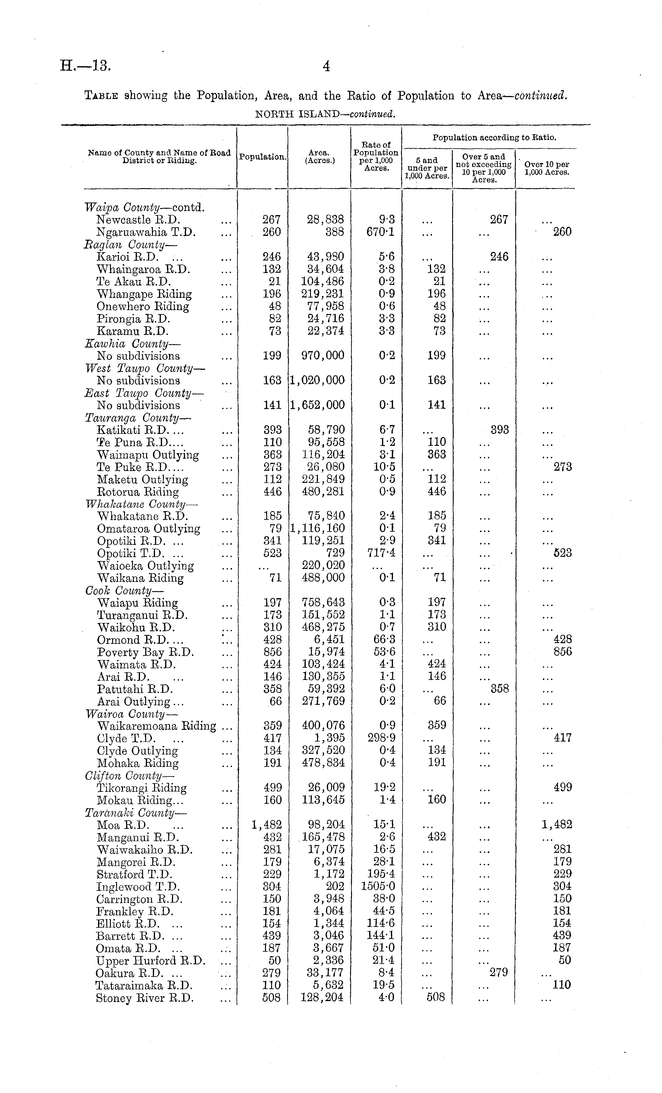 Popilation accordin; to Katio. Name of County and Name of Road District or Hiding. Population. Area. (Acres.) Rate of Population per 1,000 Acres. Over 5 and not exceeding 10 per 1,000 Acres. 5 and under per 1,000 Acres. Over 10 per 1,000 Acros. Waipa County—- contd. Newcastle E.D. Ngaruawahia T.D. Raglan County — Karioi E.D. Whaingaroa E.D. TeAkauB.D. Whangape Eiding Onewhero Eiding Pirongia E.D. Karamu E.D. Kawhia County — No subdivisions West Tawpo County — No subdivisions Bast Taupo County — No subdivisions Tauranga County — KatikatiE.D. ... Te Puna E.D.... Wairnapu Outlying Te Puke E.D.... Maketu Outlying Eotorua Eiding Whahatane County — Whakatane E.D. Omataroa Outlying OpotikiE.D. ... OpotikiT.D. ... Waioeka Outlying Waikana Eiding Cook County — Waiapu Eiding Turanganui E.D. WaikohuE.D. OrmondE.D.... '... Poverty Bay E.D. Waimata E.D. AraiE.D. Patutahi B.D. Arai Outlying... Wairoa County — Waikaremoana Eiding ... Clyde T.D Clyde Outlying Mohaka Eiding Clifton County — Tikorangi Eiding Mokau Eiding... Taranahi County — MoaE.D. Manganui E.D. Waiwakaiho E.D. Mangorei E.D. Stratford T.D. Inglewood T.D. Carrington E.D. FrankleyE.D. Elliott E.D. ... Barrett E.D. ... Omata E.D. ... Upper Hurford E.D. Oakura E.D. ... Tataraimaka E.D. Stoney Eiver E.D. 267 260 246 132 21 196 48 82 73 199 163 141 393 110 363 273 112 446 185 79 341 523 71 197 173 310 428 856 424 146 358 66 28,838 388 43,930 34,604 104,486 219,231 77,958 24,716 22,374 970,000 1,020,000 1,652,000 58,790 95,558 116,204 26,080 221,849 480,281 75,840 1,116,160 119,251 729 220,020 488,000 758,643 151,552 468,275 6,451 15,974 103,424 130,355 59,392 271,769 9-3 670-1 5-6 3-8 0-2 0-9 0-6 3-3 3-3 0-2 0-2 01 6-7 1-2 31 10-5 0-5 0-9 2-4 0-1 2-9 717-4 01 0-3 14 0-7 663 53-6 4-1 1-1 6-0 0-2 132 21 196 48 82 73 199 163 141 "llO 363 "ll2 446 185 79 341 71 197 173 310 267 246 393 "260 '"273 "523 428 856 "424 146 66 '"358 359 417 134 191 400,076 1,395 327,520 478,834 0-9 298-9 0-4 0-4 359 134 191 417 499 160 26,009 113,645 19-2 1-4 "l60 499 1,482 432 281 179 229 304 150 181 154 439 187 50 279 110 508 98,204 165,478 17,075 6,374 1,172 202 3,948 4,064 1,344 3,046 3,667 2,336 33,177 5,632 128,204 15-1 2-6 16-5 28-1 195-4 1505-0 38-0 44-5 114-6 144-1 51-0 21-4 8-4 19-5 4-0 432 1,482 281 179 229 304 150 181 154 439 187 50 279 508 110