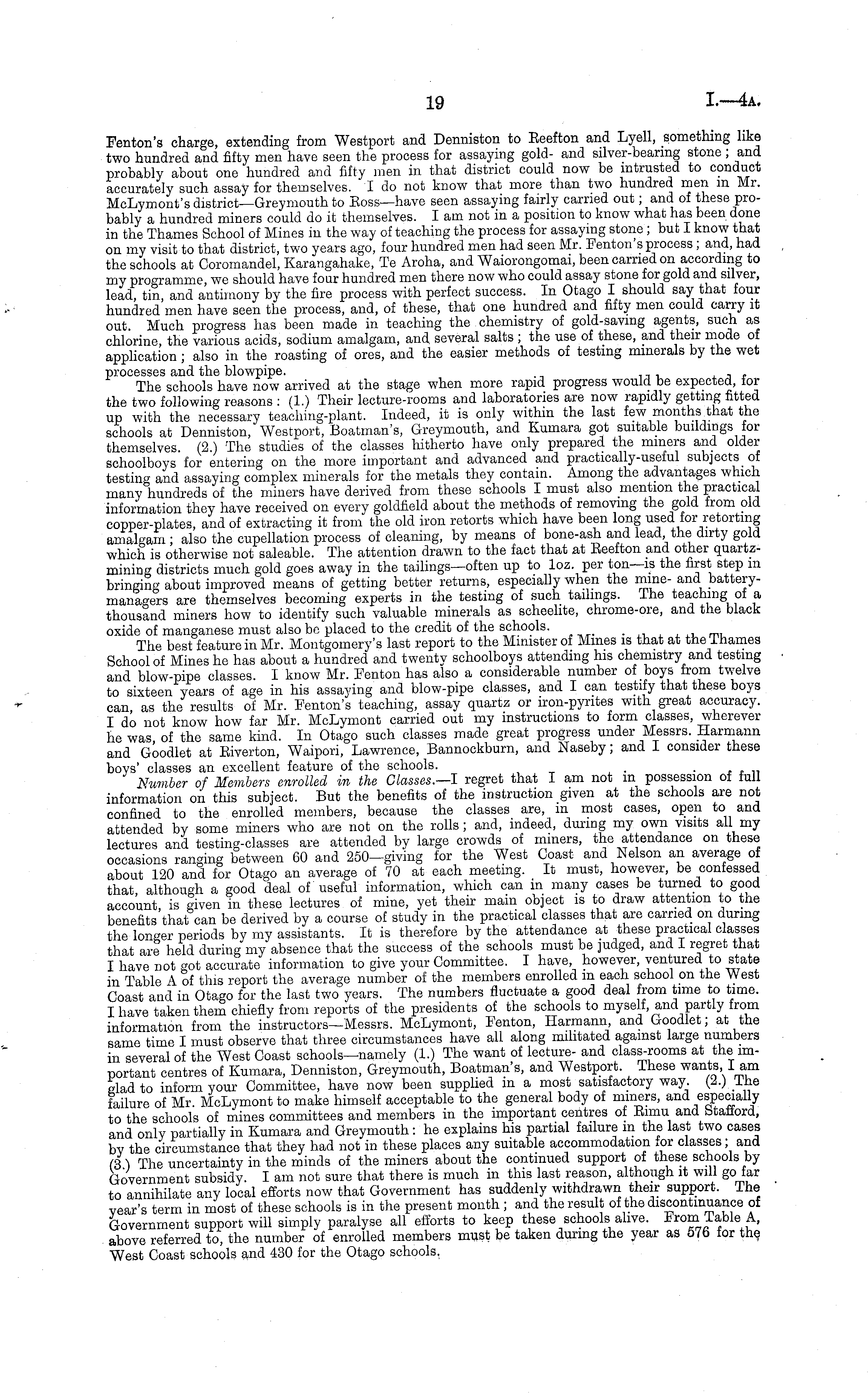 Fenton's charge, extending from Westport and Denniston to Eeefton and Lyell, something like two hundred and fifty men have seen the process for assaying gold- and silver-bearing stone ; and probably about one hundred and fifty men in that district could now be intrusted to conduct accurately such assay for themselves. I do not know that more than two hundred men m Mr. McLymont's district—Greymouth to Eoss—have seen assaying fairly carried out; and of these probably a hundred miners could do it themselves. lam not in a position to know what has been done in the Thames School of Mines in the way of teaching the process for assaying stone; but I know that on my visit to that district, two years ago, four hundred men had seen Mr. Fenton's process; and, had the schools at Coromandel, Karangahake, Te Aroha, and Waiorongomai, been carried on according to my programme, we should have four hundred men there now who could assay stone for gold and silver, lead, tin and antimony by the fire process with perfect success. In Otago I should say that four hundred men have seen the process, and, of these, that one hundred and fifty men could carry it out Much progress has been made in teaching the chemistry of gold-saving agents, such as chlorine, the various acids, sodium amalgam, and several salts ; the use of these, and their mode of application ; also in the roasting of ores, and the easier methods of testing minerals by the wet processes and the blowpipe. , , The schools have now arrived at the stage when more rapid progress would be expected, for the two following reasons : (1.) Their lecture-rooms and laboratories are now rapidly getting fitted up with the necessary teaching-plant. Indeed, it is only within the last few the schools at Denniston, Westport, Boatman's, Greymouth, and Kumara got suitable buildings for themselves. (2.) The studies of the classes hitherto have only prepared the miners and older schoolboys for entering on the more important and advanced and practically-useful subjects of testing and assaying complex minerals for the metals they contain. Among the advantages which many hundreds of the miners have derived from these schools I must also mention the practical information they have received on every goldfield about the methods of removing the gold from old copper-plates, and of extracting it from the old iron retorts which have been long used for retorting amalgam; also the cupellation process of cleaning, by means of bone-ash and lead the dirty gold which is otherwise not saleable. The attention drawn to the fact that at Eeefton and other quartzmining districts much gold goes away in the tailings—often up to loz. per ton—is the first step in bringing about improved means of getting better returns, especially when the mine- and batterymanagers are themselves becoming experts in the testing of such tailings. The teaching of a thousand miners how to identify such valuable minerals as scheehte, chrome-ore, and the black oxide of manganese must also be placed to the credit of the schools. The best feature in Mr. Montgomery's last report to the Minister of Mines is that at the Thames School of Mines he has about a hundred and twenty schoolboys attending his chemistry and testing and blow-pipe classes. I know Mr. Fenton has also a considerable number of boys from twelve to sixteen years of age in his assaying and blow-pipe classes, and I can testify that these boys can as the results of Mr. Fenton's teaching, assay quartz or iron-pyrites with great accuracy. I do not know how far Mr. McLymont carried out my instructions to form classes, wherever he was of the same kind. In Otago such classes made great progress under Messrs. Harmann and Goodlet at Eiverton, Waipori, Lawrence, Bannockburn, and Naseby; and I consider these boys' classes an excellent feature of the schools. _ . Number of Members enrolled in the Classes.—l regret that I am not m possession of full information on this subject. But the benefits of the instruction given at the schools are not confined to the enrolled members, because the classes are, in most cases, open to and attended by some miners who are not on the rolls; and, indeed, during my own visits all my lectures and testing-classes are attended by large crowds of miners, the attendance on these occasions ranging between 60 and 250—giving for the West Coast and Nelson an average of about 120 and for Otago an average of 70 at each meeting. It must, however, be confessed that although a good deal of useful information, which can in many cases be turned to good account is given in these lectures of mine, yet their main object is to draw attention to the benefits'that can be derived by a course of study in the practical classes that are carried on during the longer periods by my assistants. It is therefore by the attendance at these practical classes that are held during my absence that the success of the schools must be judged, and I regret that I have not got accurate information to give your Committee. I have however, ventured to state in Table A of this report the average number of the members enrolled m each school on the West Coast and in Otago for the last two years. The numbers fluctuate a good deal from time to time. I have taken them chiefly from reports of the presidents of the schools to myself, and partly from information from the instructors—Messrs. McLymont, Fenton, Harmann, and Goodlet; at the same time I must observe that three circumstances have all along militated against large numbers in several of the West Coast schools—namely (1.) The want of lecture- and class-rooms at the important centres of Kumara, Denniston, Greymouth, Boatman's, and Westport. These wants lam clad to inform your Committee, have now been supplied in a most satisfactory way {2.) Ihe failure of Mr McLymont to make himself acceptable to the general body of miners, and especially to the schools of mines committees and members in the important centres of Eimu a