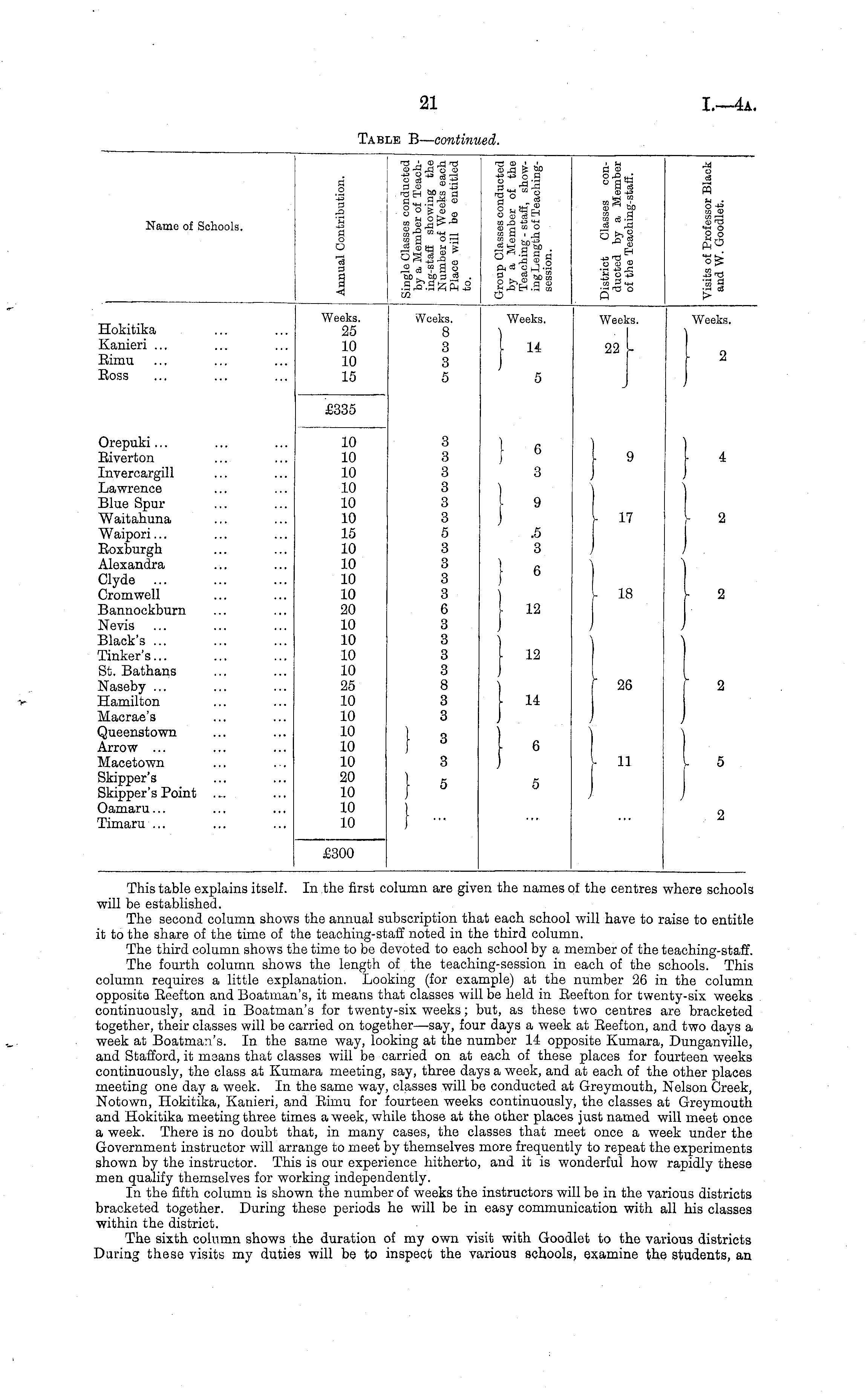 This table explains itself. In the first column are given the names of the centres where schools will be established. The second column shows the annual subscription that each school will have to raise to entitle it to the share of the time of the teaching-staff noted in the third column. The third column shows the time to be devoted to each school by a member of the teaching-staff. The fourth column shows the length of the teaching-session in each of the schools. This column requires a little explanation. Looking (for example) at the number 26 in the column opposite Eeefton and Boatman's, it means that classes will be held in Eeefton for twenty-six weeks continuously, and in Boatman's for twenty-six weeks; but, as these two centres are bracketed together, their classes will be carried on together —-say, four days a week at Eeefton, and two days a week at Boatman's. In the same way, looking at the number 14 opposite Kumara, Dunganville, and Stafford, it means that classes will be carried on at each of these places for fourteen weeks continuously, the class at Kumara meeting, say, three days a week, and at each of the other places meeting one day a week. In the same way, classes will be conducted at Greymouth, Nelson Creek, Notown, Hokitika, Kanieri, and Eimu for fourteen weeks continuously, the classes at Greymouth and Hokitika meeting three times a week, while those at the other places just named will meet once a week. There is no doubt that, in many cases, the classes that meet once a week under the Government instructor will arrange to meet by themselves more frequently to repeat the experiments shown by the instructor. This is our experience hitherto, and it is wonderful how rapidly these men qualify themselves for working independently. In the fifth column is shown the number of weeks the instructors will be in the various districts bracketed together. During these periods he will be in easy communication with all his classes within the district. The sixth column shows the duration of my own visit with Goodlet to the various districts Daring these visits my duties will be to inspect the various schools, examine the students, an