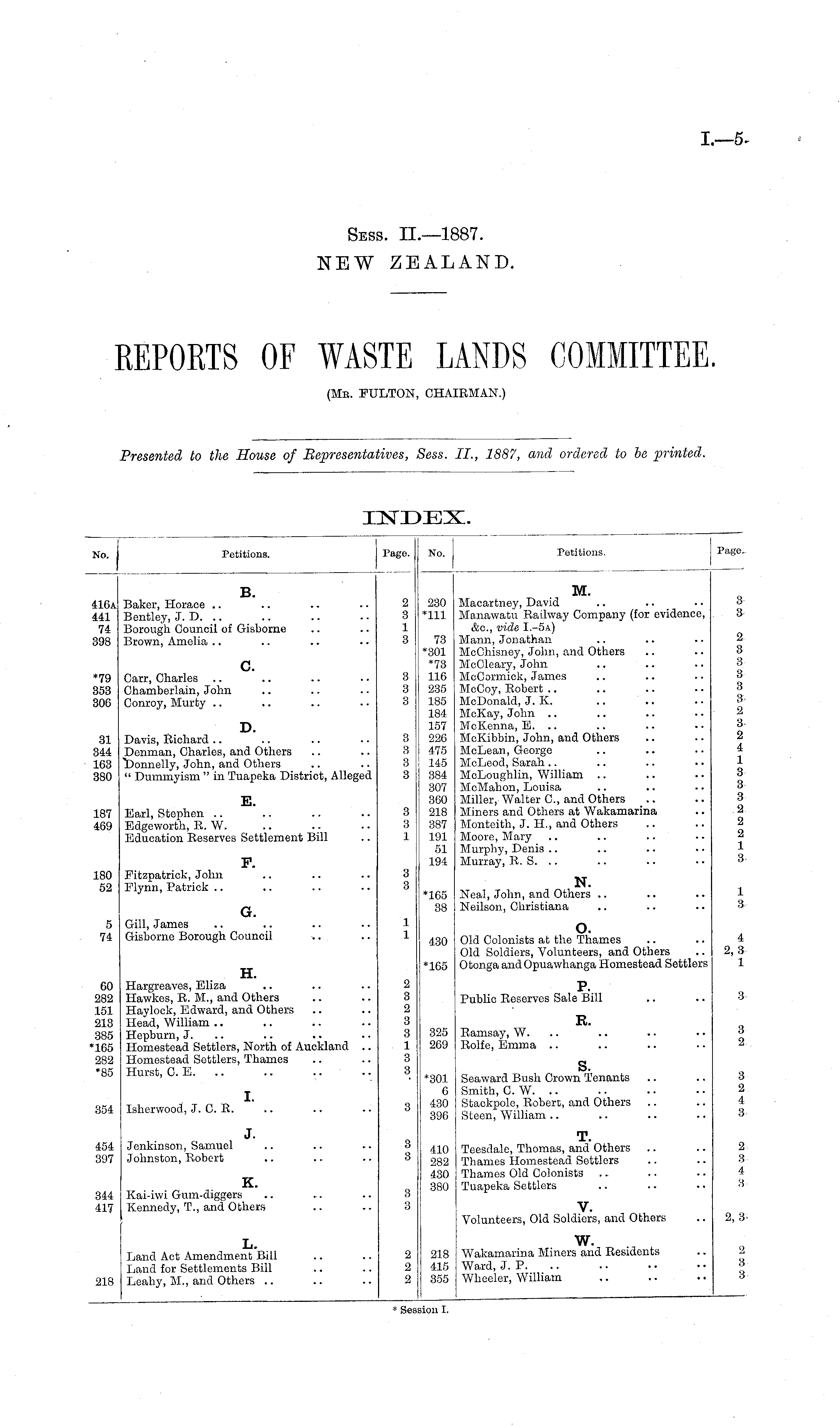 No. Petitions. Page. No. Petitions. Page.. B. M. 416a 441 74 398 *79 353 306 31 344 163 380 Baker, Horace Bentley, J. D. .. Borough Council of Gisborne Brown, Amelia .. c. Carr, Charles Chamberlain, John Conroy, Murty .. D. Davis, Richard Denman, Charles, and Others "Donnelly, John, and Others " Dummyism " in Tuapeka District, Alleged 2 3 1 3 3 3 3 3 3 3 3 230 mi 73 *301 *73 116 235 185 184 157 226 475 145 384 307 360 218 387 191 51 194 Macartney, David Manawatu Railway Company (for evidence, &o., vide I.-5a) Mann, Jonathan McChisney, John, and Others McCleary, John McCormick, James McCoy, Robert McDonald, J. K. McKay, John McKenna, E. .. McKibbin, John, and Others McLean, George McLeod, Sarah McLoughlin, William McMahon, Louisa Miller, Walter C, and Others Miners and Others at Wakamarina Monteith, J. H., and Others Moore, Mary .. .. .. Murphy, Denis Murray, R. S. .. 3 3 2 3 3 3 3 3 2 3 2 4 1 3 3 3 2 2 2 1 3 187 469 E. Earl, Stephen Edgeworth, R. W. Education Reserves Settlement Bill 3 3 1 P. 180 52 Fitzpatrick, John Flynn, Patrick .. 3 3 *165 38 N. Neal, John, and Others Neilson, Christiana 1 3 5 74 G. 1 1 Gill, James Gisborne Borough Council 430 o. Old Colonists at the Thames Old Soldiers, Volunteers, and Others Otonga andOpuawhanga Homestead Settlers 4 2,3 1 H. *165 60 282 151 213 385 *165 282 *85 Hargroaves, Eliza Hawkes, R. M., and Others Haylock, Edward, and Others Head, William Hepburn, J. Homestead Settlers, North of Auckland .. Homestead Settlers, Thames Hurst, C. E. .. 2 3 2 3 3 1 3 3 P. Public Reserves Sale Bill 3 R. 3 2 325 269 Ramsay, W. Rolfe, Emma .. I. *301 6 430 396 s. Seaward Bush Crown Tenants Smith, C. W. .. Stackpolo, Robert, and Others Steen, William .. 3 2 4 3 354 Isherwood, J. C. R. 454 397 J. T. Teesdale, Thomas, and Others Thames Homestead Settlers Thames Old Colonists Tuapeka Settlers 2. 3 4 3Jenkinson, Samuel Johnston, Robert 3 3 410 282 430 380 344 417 K. Kai-iwi Gum-diggers Kennedy, T., and Others 3 3 V. Volunteers, Old Soldiers, and Others 2, 3L. Land Act Amendment Bill Land for Settlements Bill Leahy, M., and Others 2 2 2 218 415 355 w. Wakamarina Miners and Residents Ward, J. P. Wheeler, William 2 3 3 218 * Session I.