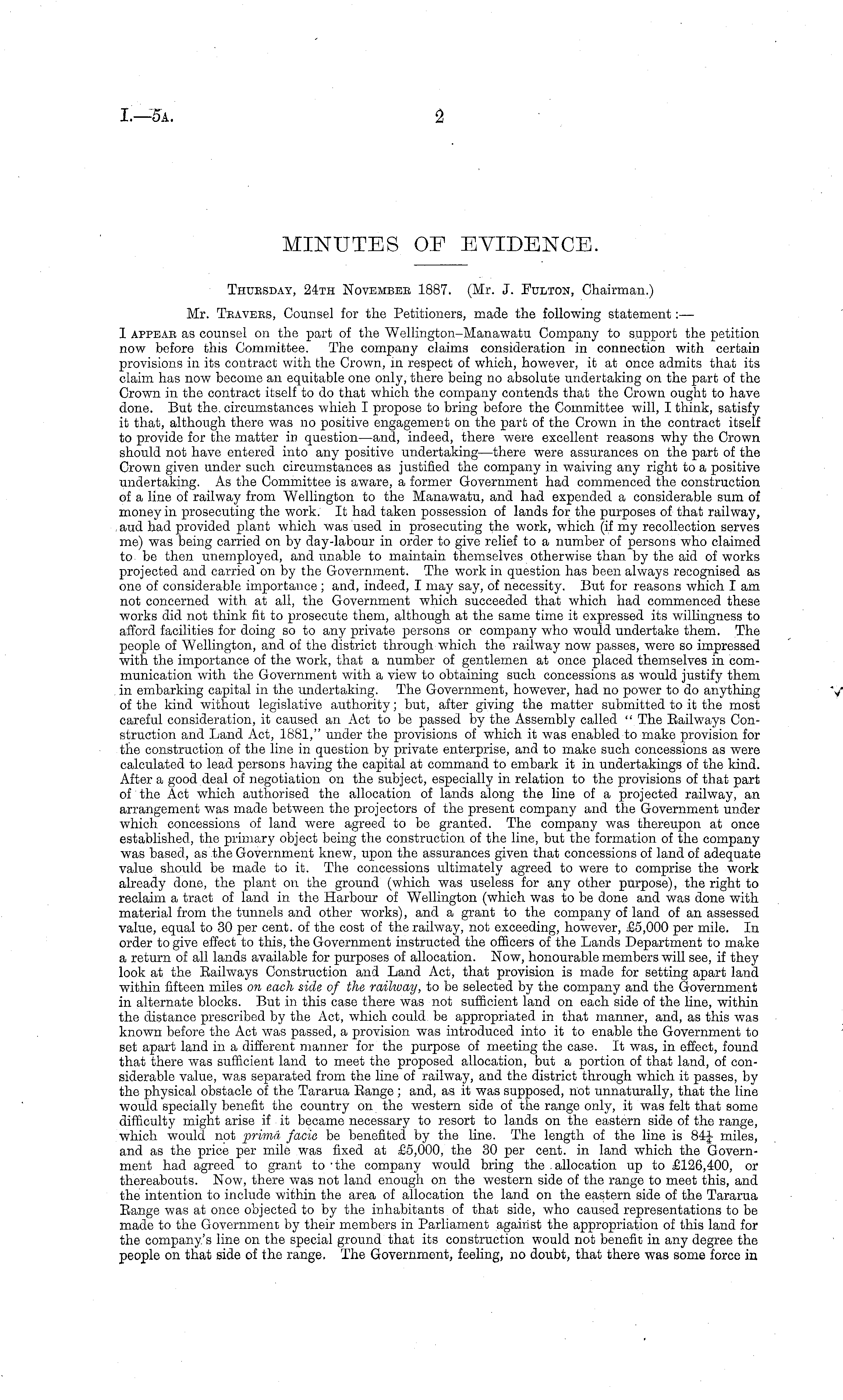 Thursday, 24th Novembee 1887. (Mr. J. Fulton, Chairman.) Mr. Tbavees, Counsel for the Petitioners, made the following statement: — I appeae as counsel on the part of the Wellington-Manawatu Company to support the petition now before this Committee. The company claims consideration in connection with certain provisions in its contract with the Crown, m respect of which, however, it at once admits that its claim has now become an equitable one only, there being no absolute undertaking on the part of the Crown in the contract itself to do that which the company contends that the Crown ought to have done. But the. circumstances which I propose to bring before the Committee will, I think, satisfy it that, although there was no positive engagement on the part of the Crown in the contract itself to provide for the matter in question —and, indeed, there were excellent reasons why the Crown should not have entered into any positive undertaking—there were assurances on the part of the Crown given under such circumstances as justified the company in waiving any right to a positive undertaking. As the Committee is aware, a former Government had commenced the construction of a line of railway from Wellington to the Manawatu, and had expended a considerable sum of money in prosecuting the work. It had taken possession of lands for the purposes of that railway, aud had provided plant which was used in prosecuting the work, which (if my recollection serves me) was being carried on by day-labour in order to give relief to a number of persons who claimed to be then unemployed, and unable to maintain themselves otherwise than by the aid of works projected and carried on by the Government. The work in question has been always recognised as one of considerable importance ; and, indeed, I may say, of necessity. But for reasons which lam not concerned with at all, the Government which succeeded that which had commenced these works did not think fit to prosecute them, although at the same time it expressed its willingness to afford facilities for doing so to any private persons or company who would undertake them. The people of Wellington, and of the district through which the railway now passes, were so impressed with the importance of the work, that a number of gentlemen at once placed themselves in communication with the Government with a view to obtaining such concessions as would justify them in embarking capital in the undertaking. The Government, however, had no power to do anything of the kind without legislative authority; but, after giving the matter submitted to it the most careful consideration, it caused an Act to be passed by the Assembly called " The Railways Construction and Land Act, 1881," under the provisions of which it was enabled to make provision for the construction of the line in question by private enterprise, and to make such concessions as were calculated to lead persons having the capital at command to embark it in undertakings of the kind. After a good deal of negotiation on the subject, especially in relation to the provisions of that part of the Act which authorised the allocation of lands along the line of a projected railway, an arrangement was made between the projectors of the present company and the Government under which concessions of land were agreed to be granted. The company was thereupon at once established, the primary object being the construction of the line, but the formation of the company was based, as the Government knew, upon the assurances given that concessions of land of adequate value should be made to it. The concessions ultimately agreed to were to comprise the work already done, the plant on the ground (which was useless for any other purpose), the right to reclaim a tract of land in the Harbour of Wellington (which was to be done and was done with material from the tunnels and other works), and a grant to the company of land of an assessed value, equal to 30 per cent, of the cost of the railway, not exceeding, however, £5,000 per mile. In order to give effect to this, the Government instructed the officers of the Lands Department to make a return of all lands available for purposes of allocation. Now, honourable members will see, if they look at the Railways Construction and Land Act, that provision is made for setting apart land within fifteen miles on each side of the railway, to be selected by the company and the Government in alternate blocks. But in this case there was not sufficient land on each side of the line, within the distance prescribed by the Act, which could be appropriated in that manner, and, as this was known before the Act was passed, a provision was introduced into it to enable the Government to set apart land in a different manner for the purpose of meeting the case. It was, in effect, found that there was sufficient land to meet the proposed allocation, but a portion of that land, of considerable value, was separated from the line of railway, and the district through which it passes, by the physical obstacle of the Tararua Range ; and, as it was supposed, not unnaturally, that the line would specially benefit the country on the western side of the range only, it was felt that some difficulty might arise if it became necessary to resort to lands on the eastern side of the range, which would not privia facie be benefited by the line. The length of the line is 84J miles, and as the price per mile was fixed at £5,000, the 30 per cent, in land which the Government had agreed to grant to 'the company would bring the allocation up to £126,400, or thereabouts. Now, there was not land enough on the western side of the range to meet this, and the intention to include within the area of allocation the land on the eastern side of the Tararua Range was at once objected to by the inhabitants of that side, who caused representations to be made to the Government by their members in Parliament against the appropriation of this land for the