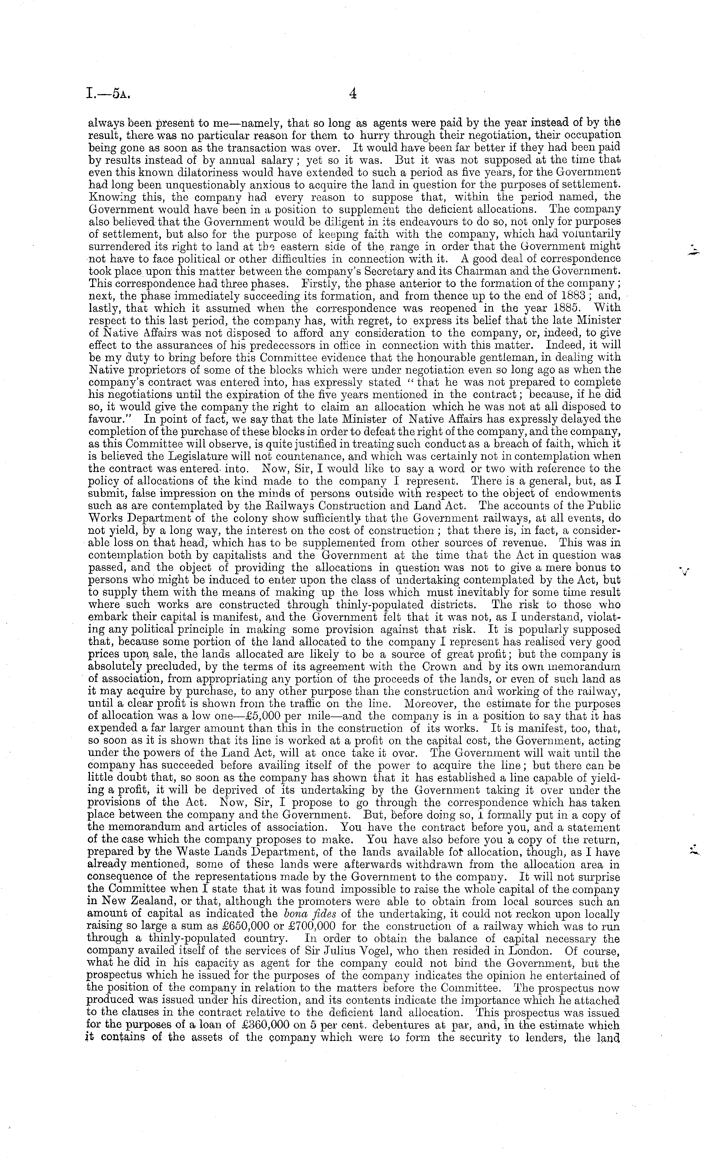 always been present to me—namely, that so long as agents were paid by the year instead of by the result, there was no particular reason for them to hurry through their negotiation, their occupation being gone as soon as the transaction was over. It would have been far better if they had been paid by results instead of by annual salary; yet so it was. But it was not supposed at the time that even this known dilatoriness would have extended to such a period as five years, for the Government had long been unquestionably anxious to acquire the land in question for the purposes of settlement. Knowing this, the company had every reason to suppose that, within the period named, the Government would have been in a position to supplement the deficient allocations. The company also believed that the Government would be diligent in its endeavours to do so, not only for purposes of settlement, but also for the purpose of keeping faith with the company, which had voluntarily surrendered its right to land at the eastern side of the range in order that the Government might not have to face political or other difficulties in connection with it. A good deal of correspondence took place upon this matter between the company's Secretary and its Chairman and the Government. This correspondence had three phases. Firstly, the phase anterior to the formation of the company ; next, the phase immediately succeeding its formation, and from thence up to the end of 1883 ; and, lastly, that which it assumed when the correspondence was reopened in the year 1885. With respect to this last period, the company has, with regret, to express its belief that the late Minister of Native Affairs was not disposed to afford any consideration to the company, or, indeed, to give effect to the assurances of his predecessors in office in connection with this matter. Indeed, it will be my duty to bring before this Committee evidence that the honourable gentleman, in dealing with Native proprietors of some of the blocks which were under negotiation even so long ago as when the company's contract was entered into, has expressly stated " that he was not prepared to complete his negotiations until the expiration of the five years mentioned in the contract; because, if he did so, it would give the company the right to claim an allocation which he was not at all disposed to favour." In point of fact, we say that the late Minister of Native Affairs has expressly delayed the completion of the purchase of these blocks in order to defeat the right of the company, and the company, as this Committee will observe, is quite justified in treating such conduct as a breach of faith, which it is believed the Legislature will not countenance, and which was certainly not in contemplation when the contract was entered into. Now, Sir, I would like to say a word or two with reference to the policy of allocations of the kind made to the company I represent. There is a general, but, as I submit, false impression on the minds of persons outside with respect to the object of endowments such as are contemplated by the Bailways Construction and Land Act. The accounts of the Public Works Department of the colony show sufficiently that the Government railways, at all events, do not yield, by a long way, the interest on the cost of construction ; that there is, in fact, a considerable loss on that head, which has to be supplemented from other sources of revenue. This was in contemplation both by capitalists and the Government at the time that the Act in question was passed, and the object of providing the allocations in question was not to give a mere bonus to persons who might be induced to enter upon the class of undertaking contemplated by the Act, but to supply them with the means of making up the loss which must inevitably for some time result where such works are constructed through thinly-populated districts. The risk to those who embark their capital is manifest, and the Government felt that it was not, as I understand, violating any political principle in making some provision against that risk. It is popularly supposed that, because some portion of the land allocated to the company I represent has realised very good prices upon sale, the lands allocated are likely to be a source of great profit; but the company is absolutely precluded, by the terms of its agreement with the Crown and by its own memorandum of association, from appropriating any portion of the proceeds of the lands, or even of such land as it may acquire by purchase, to any other purpose than the construction and working of the railway, until a clear profit is shown from the traffic on the line. Moreover, the estimate for the purposes of allocation was a low one —£5,000 per mile—and the company is in a position to say that it has expended a far larger amount than this in the construction of its works. It is manifest, too, that, so soon as it is shown that its line is worked at a profit on the capital cost, the Government, acting under the powers of the Land Act, will at once take it over. The Government will wait until the company has succeeded before availing itself of the power to acquire the line; but there can be little doubt that, so soon as the company has shown that it has established a line capable of yielding a profit, it will be deprived of its undertaking by the Government taking it over under the provisions of the Act. Now, Sir, I propose to go through the correspondence which has taken place between the company and the Government. But, before doing so, 1 formally put in a copy of the memorandum and articles of association. You have the contract before you, and a statement of the case which the company proposes to make. You have also before you a copy of the return, prepared by the Waste Lands Department, of the lands available for allocation, though, as I have already mentioned, some of these lands were afterwards withdrawn from the allocation area in consequence of the 