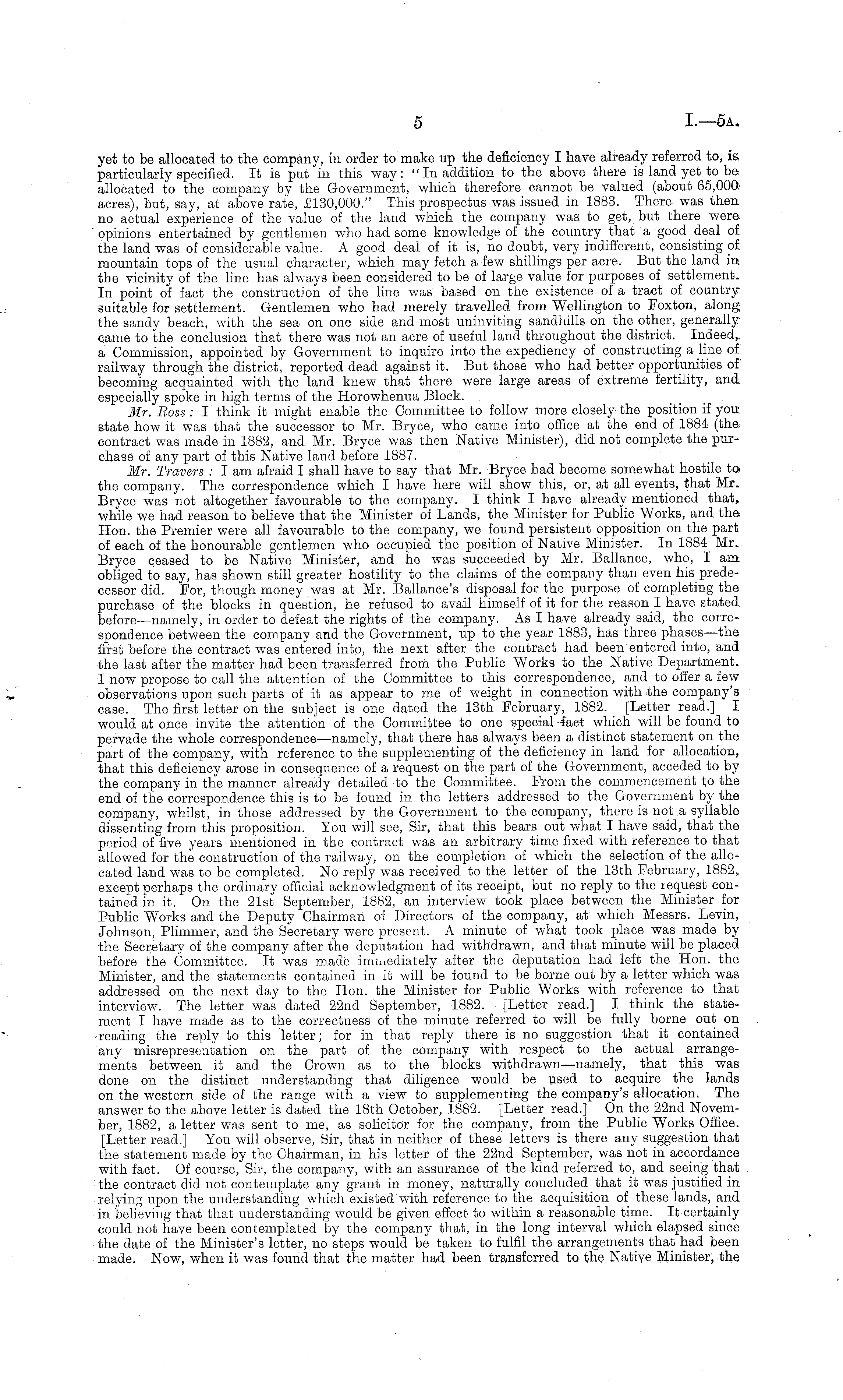 yet to be allocated to the company, in order to make up the deficiency I have already referred to, is particularly specified. It is put in this way: "In addition to the above there is land yet to be. allocated to the company by the Government, which therefore cannot be valued (about 65,000 acres), but, say, at above rate, £130,000." This prospectus was issued in 1883. There was then no actual experience of the value of the land which the company was to get, but there were opinions entertained by gentlemen who had some knowledge of the country that a good deal of the land was of considerable value. A good deal of it is, no doubt, very indifferent, consisting of mountain tops of the usual character, which may fetch a few shillings per acre. But the land in the vicinity of the line has always been considered to be of largo value for purposes of settlement. In point of fact the construction of the line was based on the existence of a tract of country suitable for settlement. Gentlemen who had merely travelled from Wellington to Foxton, along the sandy beach, with the sea on one side and most uninviting sandhills on the other, generally came to the conclusion that there was not an acre of useful land throughout the district. Indeed,, a Commission, appointed by Government to inquire into the expediency of constructing a line of railway through the district, reported dead against it. But those who had better opportunities of becoming acquainted with the land knew that there were large areas of extreme fertility, and especially spoke in high terms of the Horowhenua Block. Mr. Boss : I think it might enable the Committee to follow more closely the position if you state how it was that the successor to Mr. Bryce, who came into office at the end of 1884 (the contract was made in 1882, and Mr. Bryce was then Native Minister), did not complete the purchase of any part of this Native land before 1887. Mr. Travers : I am afraid I shall have to say that Mr. Bryce had become somewhat hostile to the company. The correspondence which I have here will show this, or, at all events, that Mr. Bryce was not altogether favourable to the company. I think I have already mentioned that, while we had reason to believe that the Minister of Lands, the Minister for Public Works, and the Hon. the Premier were all favourable to the company, we found persistent opposition on the part of each of the honourable gentlemen who occupied the position of Native Minister. In 1884 Mr. Bryce ceased to be Native Minister, and he was succeeded by Mr. Ballance, who, I am obliged to say, has shown still greater hostility to the claims of the company than even his predecessor did. For, though money was at Mr. Ballance's disposal for the purpose of completing the purchase of the blocks in question, he refused to avail himself of it for the reason I have stated before —namely, in order to defeat the rights of the company. As I have already said, the correspondence between the company and the Government, up to the year 1883, has three phases—the first before the contract was entered into, the next after the contract had been entered into, and the last after the matter had been transferred from the Public Works to the Native Department. I now propose to call the attention of the Committee to this correspondence, and to offer a few observations upon such parts of it as appear to me of weight in connection with the company's case. The first letter on the subject is one dated the 13th February, 1882. [Letter read.] I would at once invito the attention of the Committee to one special fact which will be found to pervade the whole correspondence—namely, that there has always been a distinct statement on the part of the company, with reference to the supplementing of the deficiency in land for allocation, that this deficiency arose in consequence of a request on the part of the Government, acceded to by the company in the manner already detailed to the Committee. From the commencement to the end of the correspondence this is to be found in the letters addressed to the Government by the company, whilst, in those addressed by the Government to the company, there is not a syllable dissenting from this proposition. You will see, Sir, that this bears out what I have said, that the period of five years mentioned in the contract was an arbitrary time fixed with reference to that allowed for the construction of the railway, on the completion of which the selection of the allocated land was to be completed. No reply was received to the letter of the 13th February, 1882, except perhaps the ordinary official acknowledgment of its receipt, but no reply to the request contained in it. On the 21st September, 1882, an interview took place between the Minister for Public Works and the Deputy Chairman of Directors of the company, at which Messrs. Levin, Johnson, Plimmer, and the Secretary were present. A minute of what took place was made by the Secretary of the company after the deputation had withdrawn, and that minute will be placed before the Committee. It was made immediately after the deputation had left the Hon. the Minister, and the statements contained in it will be found to be borne out by a letter which was addressed on the next day to the Hon. the Minister for Public Works with reference to that interview. The letter was dated 22nd September, 1882. [Letter read.] I think the statement I have made as to the correctness of the minute referred to will be fully borne out on reading the reply to this letter; for in that reply there is no suggestion that it contained any misrepresentation on the part of the company with respect to the actual arrangements between it and the Crown as to the blocks withdrawn —namely, that this was done on the distinct understanding that diligence would be used to acquire the lands on the western side of the range with a view to supplementing the company's allocation. The answer to the above letter is dated the 18th Oct