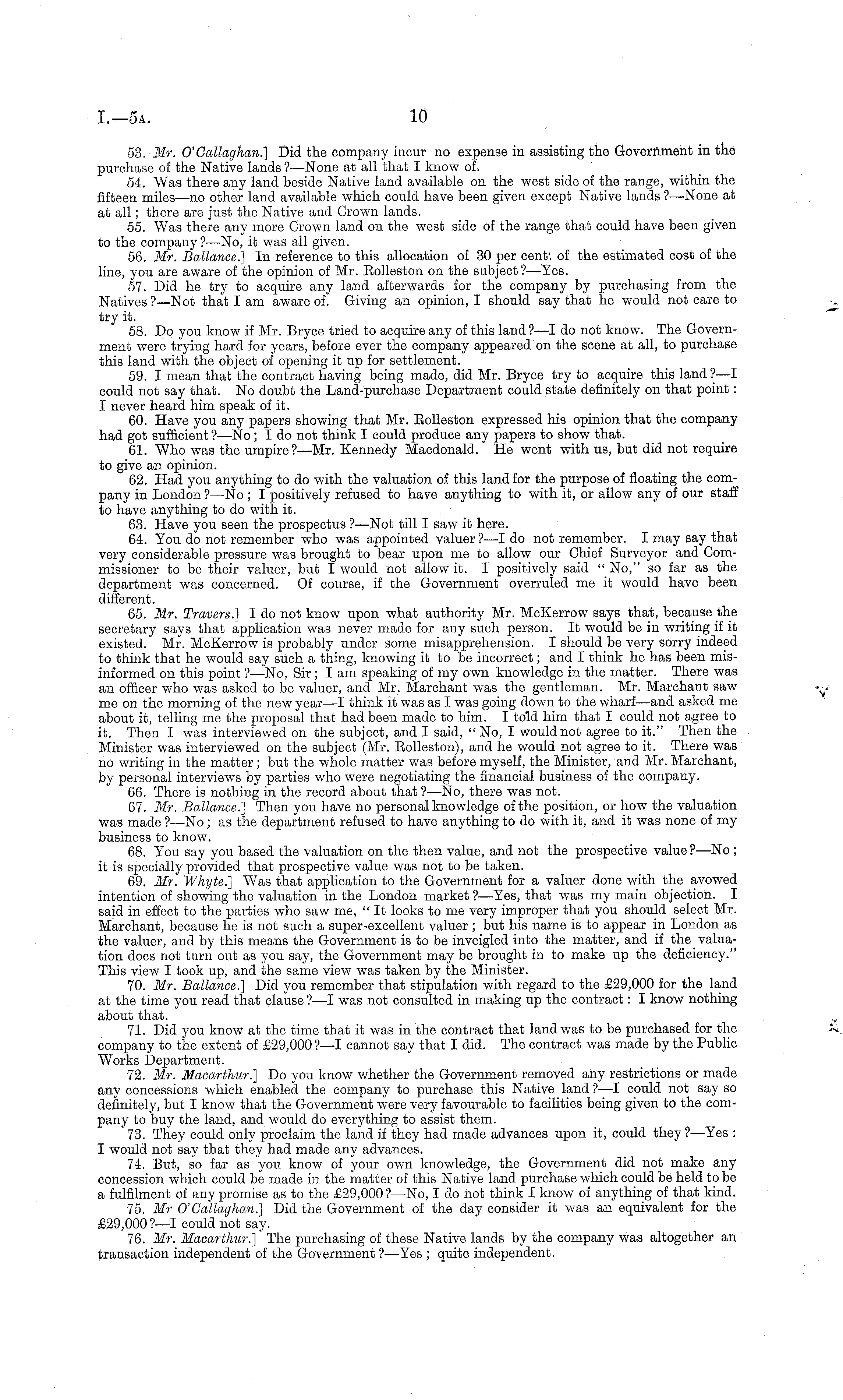 53. Mr. O'Callaghan.] Did the company incur no expense in assisting the Government in the purchase of the Native lands ?—None at all that I know of. 54. Was there any land beside Native land available on the west side of the range, within the fifteen miles—no other land available which could have been given except Native lands ?—-None at at all; there are just the Native and Crown lands. 55. Was there any more Crown land on the west side of the range that could have been given to the company? —No, it was all given. 56. Mr. Ballance.] In reference to this allocation of 30 per cent , , of the estimated cost of the line, you are aware of the opinion of Mr. Eolleston on the subject ?—Yes. 57. Did he try to acquire any land afterwards for the company by purchasing from the Natives ?—Not that lam aware of. Giving an opinion, I should say that he would not care to try it. 58. Do you know if Mr. Bryce tried to acquire any of this land ?—I do not know. The Government were trying hard for years, before ever the company appeared on the scene at all, to purchase this land with the object of opening it up for settlement. 59. I mean that the contract having being made, did Mr. Bryce try to acquire this land ? —I could not say that. No doubt the Land-purchase Department could state definitely on that point: I never heard him speak of it. 60. Have you any papers showing that Mr. Eolleston expressed his opinion that the company had got sufficient ? —No ; I do not think I could produce any papers to show that. 61. Who was the umpire?— Mr. Kennedy Macdonald. He went with us, but did not require to give an opinion. 62. Had you anything to do with the valuation of this land for the purpose of floating the company in London ? —No ; I positively refused to have anything to with it, or allow any of our staff to have anything to do with it. 63. Have you seen the prospectus ?—Not till I saw it here. 64. You do not remember who was appointed valuer ?—I do not remember. I may say that very considerable pressure was brought to bear upon me to allow our Chief Surveyor and Commissioner to be their valuer, but I would not allow it. I positively said " No," so far as the department was concerned. Of course, if the Government overruled me it would have been different. 65. Mr. Travers.] I do not know upon what authority Mr. McKerrow says that, because the secretary says that application was never made for any such person. It would be in writing if it existed. Mr. McKerrow is probably under some misapprehension. I should be very sorry indeed to think that he would say such a thing, knowing it to be incorrect; and I think he has been misinformed on this point ?—No, Sir; lam speaking of my own knowledge in the matter. There was an officer who was asked to be valuer, and Mr. Marchant was the gentleman. Mr. Marchant saw me on the morning of the new year —I think it was as I was going down to the wharf —and asked me about it, telling me the proposal that had been made to him. I told him that I could not agree to it. Then I was interviewed on the subject, and I said, " No, I would not agree to it." Then the Minister was interviewed on the subject (Mr. Eolleston), and he would not agree to it. There was no writing in the matter; but the whole matter was before myself, the Minister, and Mr. Marchant, by personal interviews by parties who were negotiating the financial business of the company. 66. There is nothing in the record about that ?—No, there was not. 67. Mr. Ballance.] Then you have no personal knowledge of the position, or how the valuation was made ?—No; as the department refused to have anything to do with it, and it was none of my business to know. 68. You say you based the valuation on the then value, and not the prospective value ?—No ; it is specially provided that prospective value was not to be taken. 69. Mr. Whyte.] Was that application to the Government for a valuer done with the avowed intention of showing the valuation in the London market ? —Yes, that was my main objection. I said in effect to the parties who saw me, " It looks to me very improper that you should select Mr. Marchant, because he is not such a super-excellent valuer; but his name is to appear in London as the valuer, and by this means the Government is to be inveigled into the matter, and if the valuation does not turn out as you say, the Government may be brought in to make up the deficiency." This view I took up, and the same view was taken by the Minister. 70. Mr. Ballance.] Did you remember that stipulation with regard to the £29,000 for the land at the time you read that clause ?—I was not consulted in making up the contract: I know nothing about that. 71. Did you know at the time that it was in the contract that land was to be purchased for the company to the extent of £29,000 ? —I cannot say that I did. The contract was made by the Public Works Department. 72. Mr. Macarthur.] Do you know whether the Government removed any restrictions or made any concessions which enabled the company to purchase this Native land ?—I could not say so definitely, but I know that the Government were very favourable to facilities being given to the company to buy the land, and would do everything to assist them. 73. They could only proclaim the land if they had made advances upon it, could they ?—Yes ; I would not say that they had made any advances. 74. But, so far as you know of your own knowledge, the Government did not make any concession which could be made in the matter of this Native land purchase which could be held to be a fulfilment of any promise as to the £29,000? —No, I do not think I know of anything of that kind. 75. Mr O'Callaghan.] Did the Government of the day consider it was an equivalent for the £29,000 ?—-I could not say. 76. Mr. Macarthur.] The purchasing of these Native lands by the company was altogether an transaction independent of the Government ?—Yes ; quite independent.