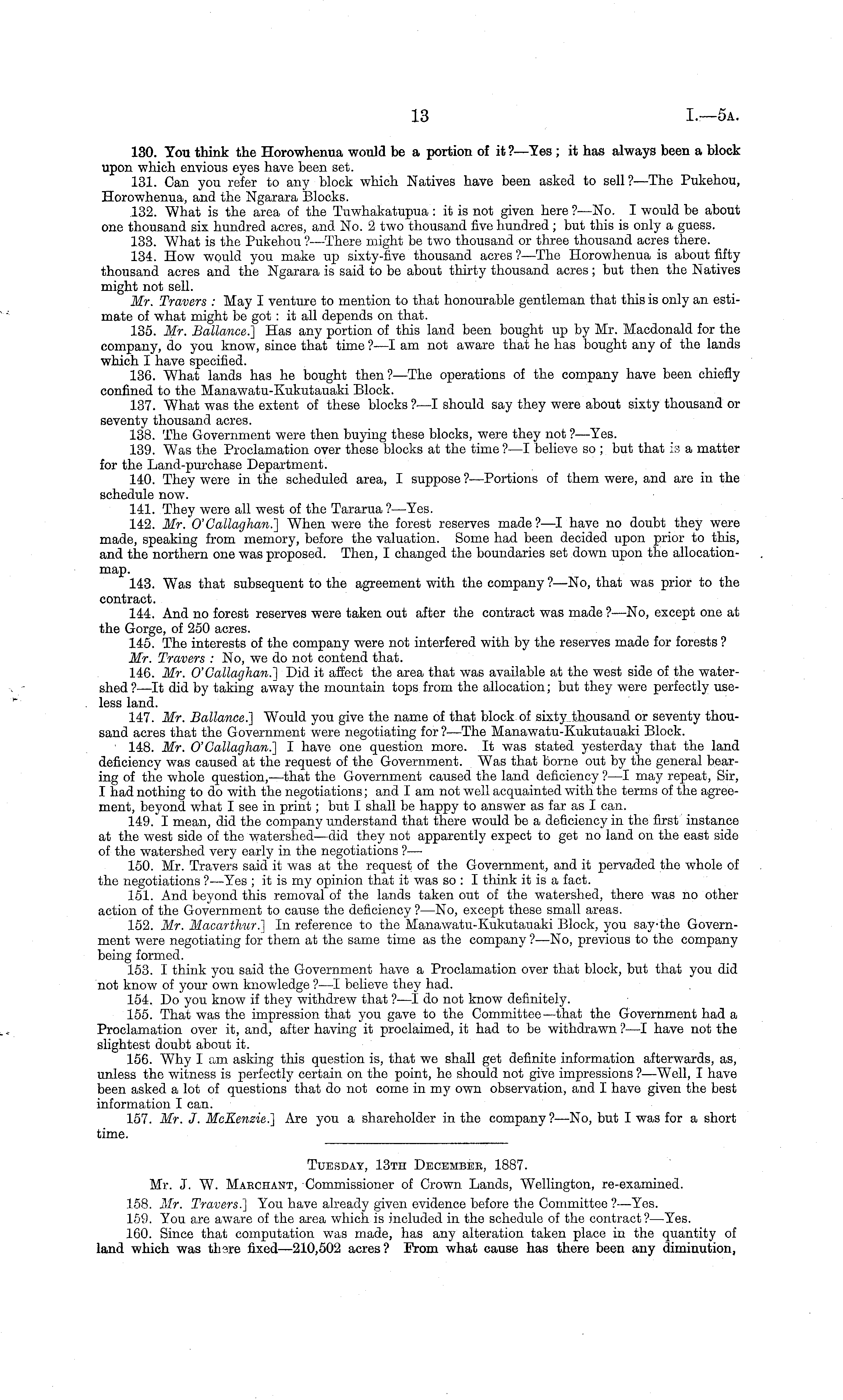 Tuesday, 13th Decembeb, 1887. Mr. J. W. Maechant, Commissioner of Crown Lands, Wellington, re-examined. 158. Mr. Travers.] You have already given evidence before the Committee ?—Yes. 159. You are aware of the area which is included in the schedule of the contract?— Yes. 160. Since that computation was made, has any alteration taken place in the quantity of land which was thsre fixed —210,502 acres ? From what cause has there been any diminution,