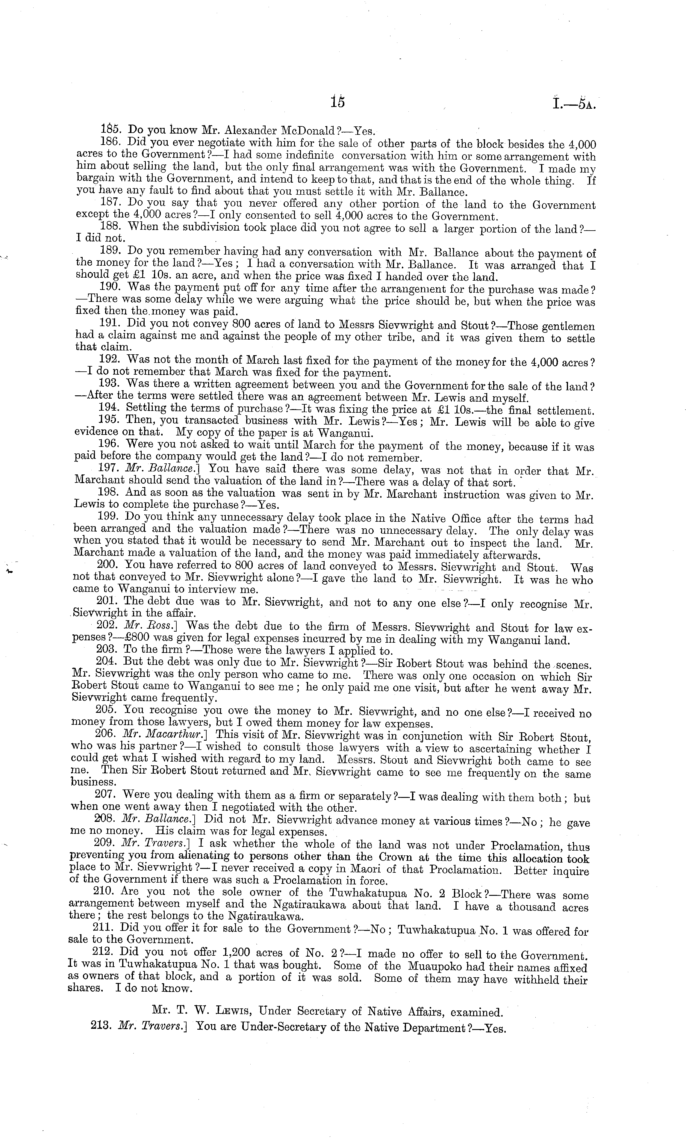185. Do you know Mr. Alexander McDonald?—Yes. 186. Did you ever negotiate with him for the sale of other parts of the block besides the 4,000 acres to the Government ?—I had some indefinite conversation with him or some arrangement with him about selling the land, but the only final arrangement was with the Government. I made my bargain with the Government, and intend to keep to that, and that is the end of the whole thing. If you have any fault to find about that you must settle it with Mr. Ballance. 187. Do you say that you never offered any other portion of the land to the Government except the 4,000 acres?—I only consented to sell 4,000 acres to the Government. 188. When the subdivision took place did you not agree to sell a larger portion of the land ?— I did not. 189. Do you remember having had any conversation with Mr. Ballance about the payment of the money for the land?—Yes ; I had a conversation with Mr. Ballance. It was arranged that I should get £1 10s. an acre, and when the price was fixed I handed over the land. 190. Was the payment put off for any time after the arrangement for the purchase was made ? —There was some delay while we were arguing what the price should be, but when the price was fixed then the.money was paid. 191. Did you not convey 800 acres of land to Messrs Sievwright and Stout?—Those gentlemen had a claim against me and against the people of my other tribe, and it was given them to settle that claim. 192. Was not the month of March last fixed for the payment of the money for the 4,000 acres ? —I do not remember that March was fixed for the payment. 193. Was there a written agreement between you and the Government for the sale of the land? —After the terms were settled there was an agreement between Mr. Lewis and myself. 194. Settling the terms of purchase ?—It was fixing the price at £1 10s.—the final settlement. 195. Then, you transacted business with Mr. Lewis?—Yes; Mr. Lewis will be able to give evidence on that. My copy of the paper is at Wanganui. 196. Were you not asked to wait until March for the payment of the money, because if it was paid before the company would get the land ?—I do not remember. 197. Mr. Ballance.} You have said there was some delay, was not that in order that Mr. Marchant should send the valuation of the land in?—There was a delay of that sort. ' 198. And as soon as the valuation was sent in by Mr. Marchant instruction was given to Mr. Lewis to complete the purchase ?—Yes. 199. Do you think any unnecessary delay took place in the Native Office after the terms had been arranged and the valuation made ?—There was no unnecessary delay. The only delay was when you stated that it would be necessary to send Mr. Marchant out to inspect the land. Mr. Marchant made a valuation of the land, and the money was paid immediately afterwards. 200. You have referred to 800 acres of land conveyed to Messrs. Sievwright and Stout. Was not that conveyed to Mr. Sievwright alone?—I gave the land to Mr. Sievwright. It was he who came to Wanganui to interview me. 201. The debt due was to Mr. Sievwright. and not to any one else?—I only recognise Mr. Sievwright in the affair. 202. Mr. Boss.] Was the debt due to the firm of Messrs. Sievwright and Stout for law expenses ?—£800 was given for legal expenses incurred by me in dealing with my Wanganui land. 203. To the firm ?—Those were the lawyers I applied to. 204. But the debt was only due to Mr. Sievwright ?—Sir Bobert Stout was behind the scenes. Mr. Sievwright was the only person who came to me. There was only one occasion on which Sir Bobert Stout came to Wanganui to see me ; he only paid me one visit, but after he went away Mr. Sievwright came frequently. 205. You recognise you owe the money to Mr. Sievwright, and no one else?—I received no money from those lawyers, but I owed them money for law expenses. 206. Mr. Macarthur.] This visit of Mr. Sievwright was in conjunction with Sir Bobert Stout, who was his partner ?—I wished to consult those lawyers with a view to ascertaining whether I could get what I wished with regard to my land. Messrs. Stout and Sievwright both came to see me. Then Sir Bobert Stout returned and Mr. Sievwright came to see me frequently on the same business. 207. Were you dealing with them as a firm or separately ?—I was dealing with them both; but when one went away then I negotiated with the other. 208. Mr. Ballance.] Did not Mr. Sievwright advance money at various times ?—No ; he gave me no money. His claim was for legal expenses. 209. Mr. Travers.} I ask whether the whole of the land was not under Proclamation, thus preventing you from alienating to persons other than the Crown at the time this allocation took place to Mr. Sievwright ?—I never received a copy in Maori of that Proclamation. Better inquire of the Government if there was such a Proclamation in force. 210. Are you not the sole owner of the Tuwhakatupua No. 2 Block?—There was some arrangement between myself and the Ngatiraukawa about that land. I have a thousand acres there ; the rest belongs to the Ngatiraukawa. 211. Did you offer it for sale to the Government ?—No ; Tuwhakatupua No. 1 was offered for sale to the Government. 212. Did you not offer 1,200 acres of No. 2 ?—I made no offer to sell to the Government It was in Tuwhakatupua No. 1 that was bought. Some of the Muaupoko had their names affixed as owners of that block, and a portion of it was sold. Some of them may have withheld their shares. I do not know. Mr. T. W. Lewis, Under Secretary of Native Affairs, examined. 213. Mr. Travers.] You are Under-Secretary of the Native Department?—Yes.