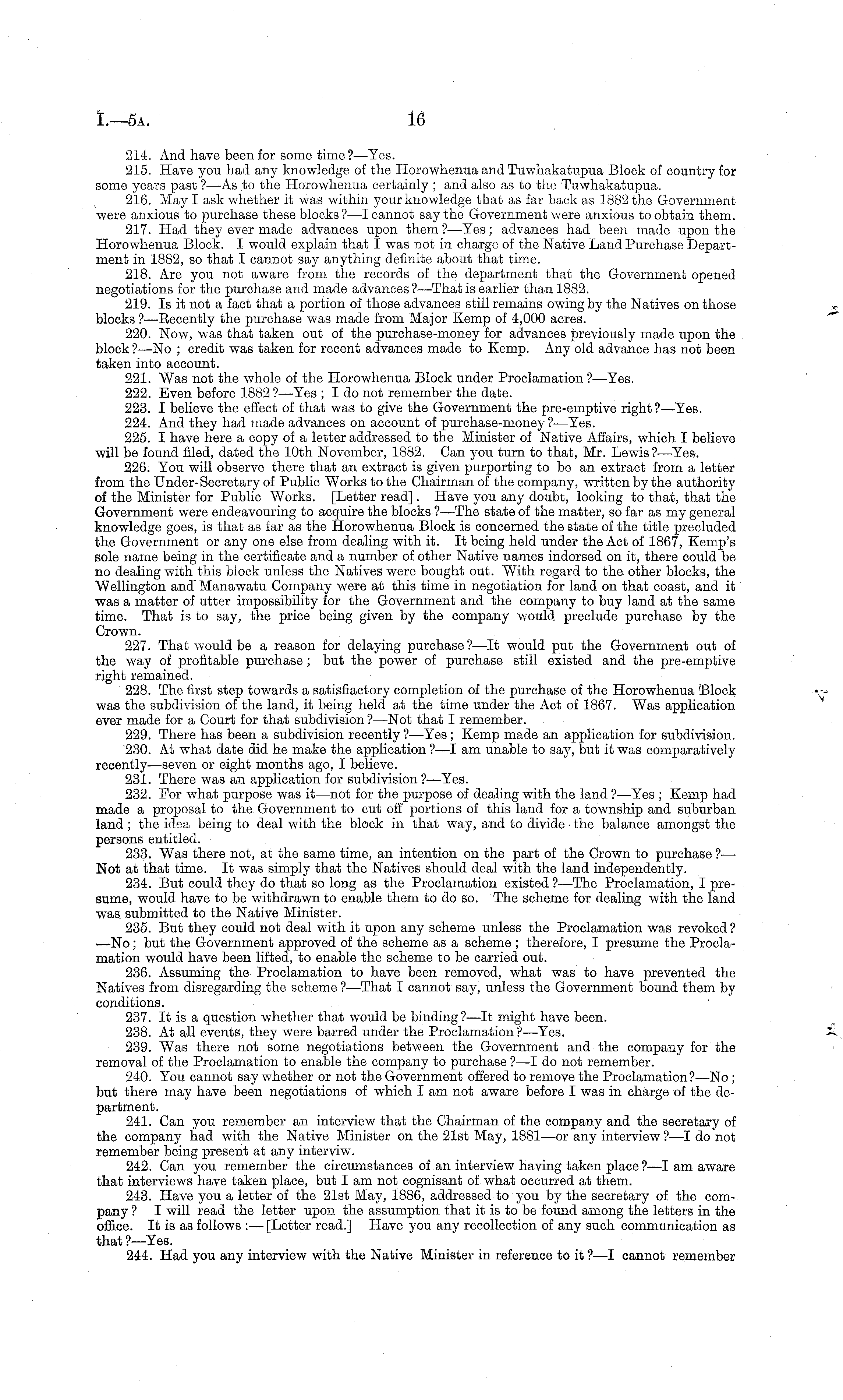 214. And have been for some time? —Yes. 215. Have you had any knowledge of the Horowhenua and Tuwhakatupua Block of country for some years past ? —As to the Horowhenua certainly ; and also as to the Tuwhakatupua. 216. May I ask whether it was within your knowledge that as far back as 1882 the Government were anxious to purchase these blocks?—l cannot say the Government were anxious to obtain them. 217. Had they ever made advances upon them ?—Yes; advances had been made upon the Horowhenua Block. I would explain that I was not in charge of the Native Land Purchase Department in 1882, so that I cannot say anything definite about that time. 218. Are you not aware from the records of the department that the Government opened negotiations for the purchase and made advances?— That is earlier than 1882. 219. Is it not a fact that a portion of those advances still remains owing by the Natives on those blocks ? —Recently the purchase was made from Major Kemp of 4,000 acres. 220. Now, was that taken out of the purchase-money for advances previously made upon the block ?—No ; credit was taken for recent advances made to Kemp. Any old advance has not been taken into account. 221. Was not the whole of the Horowhenua Block under Proclamation ?—Yes. 222. Even before 1882 ?—Yes ; I do not remember the date. 223. I believe the effect of that was to give the Government the pre-emptive right?— Yes. 224. And they had made advances on account of purchase-money ?—Yes. 225. I have here a copy of a letter addressed to the Minister of Native Affairs, which I believe will be found filed, dated the 10th November, 1882. Can you turn to that, Mr. Lewis?— Yes. 226. You will observe there that an extract is given purporting to be an extract from a letter from the Under-Secretary of Public Works to the Chairman of the company, written by the authority of the Minister for Public Works. [Letter read]. Have you any doubt, looking to that, that the Government were endeavouring to acquire the blocks ?—The state of the matter, so far as my general knowledge goes, is that as far as the Horowhenua Block is concerned the state of the title precluded the Government or any one else from dealing with it. It being held under the Act of 1867, Kemp's sole name being in the certificate and a number of other Native names indorsed on it, there could be no dealing with this block unless the Natives were bought out. With regard to the other blocks, the Wellington and" Manawatu Company were at this time in negotiation for land on that coast, and it was a matter of utter impossibility for the Government and the company to buy land at the same time. That is to say, the price being given by the company would, preclude purchase by the Crown. 227. That would be a reason for delaying purchase?—lt would put the Government out of the way of profitable purchase ; but the power of purchase still existed and the pre-emptive right remained. 228. The first step towards a satisfiactory completion of the purchase of the Horowhenua Block was the subdivision of the land, it being held at the time under the Act of 1867. Was application ever made for a Court for that subdivision ? —Not that I remember. 229. There has been a subdivision recently ?—Yes ; Kemp made an application for subdivision. '230. At what date did he make the application ?—I am unable to say, but it was comparatively recently—seven or eight months ago, I believe. 231. There was an application for subdivision? —Yes. 232. For what purpose was it —not for the purpose of dealing with the land ?—Yes ; Kemp had made a proposal to the Government to cut off portions of this land for a township and suburban land; the idea being to deal with the block in that way, and to divide • the balance amongst the persons entitled. 233. Was there not, at the same time, an intention on the part of the Crown to purchase ? — Not at that time. It was simply that the Natives should deal with the land independently. 234. But could they do that so long as the Proclamation existed ?—The Proclamation, I presume, would have to be withdrawn to enable them to do so. The scheme for dealing with the land was submitted to the Native Minister. 235. But they could not deal with it upon any scheme unless the Proclamation was revoked? —No; but the Government approved of the scheme as a scheme ; therefore, I presume the Proclamation would have been lifted, to enable the scheme to be carried out. 236. Assuming the Proclamation to have been removed, what was to have prevented the Natives from disregarding the scheme ?—That I cannot say, unless the Government bound them by conditions. 237. It is a question whether that would be binding? —It might have been. 238. At all events, they were barred under the Proclamation ? —Yes. 239. Was there not some negotiations between the Government and the company for the removal of the Proclamation to enable the company to purchase ?—I do not remember. 240. You cannot say whether or not the Government offered to remove the Proclamation?—No ; but there may have been negotiations of which I am not aware before I was in charge of the department. 241. Can you remember an interview that the Chairman of the company and the secretary of the company had with the Native Minister on the 21st May, 1881—or any interview?—l do not remember being present at any interviw. 242. Can you remember the circumstances of an interview having taken place ?—I am aware that interviews have taken place, but I am not cognisant of what occurred at them. 243. Have you a letter of the 21st May, 1886, addressed to you by the secretary of the company ? I will read the letter upon the assumption that it is to be found among the letters in the office. It is as follows : — [Letter read.] Have you any recollection of any such communication as that ?—Yes. 244. Had you any interview with the Native Minister in reference to it ?—I cannot remember