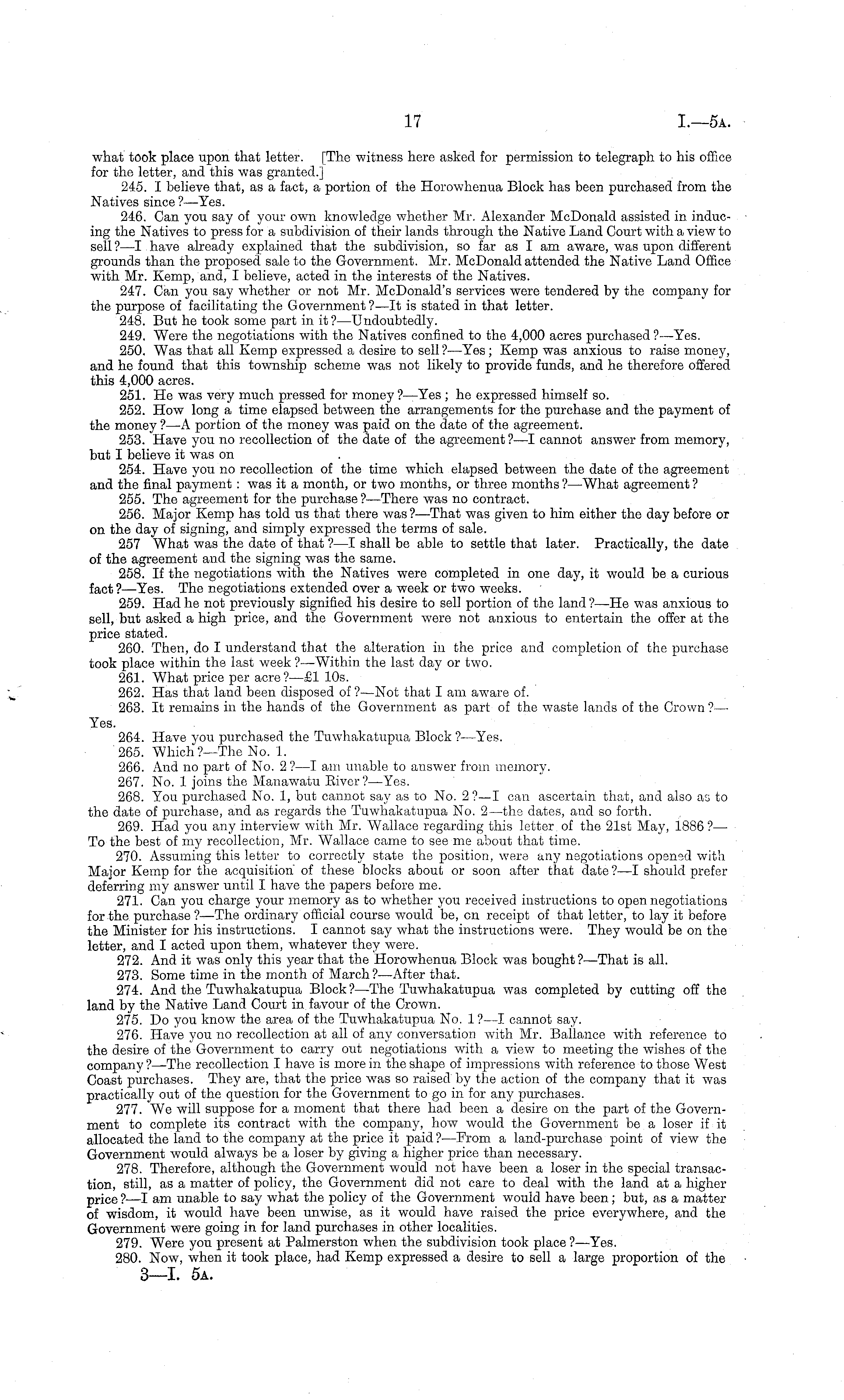 what took place upon that letter. [The witness here asked for permission to telegraph to his office for the letter, and this was granted.] 245. I believe that, as a fact, a portion of the Horowhenua Block has been purchased from the Natives since? —Yes. 246. Can you say of your own knowledge whether Mr. Alexander McDonald assisted in inducing the Natives to press for a subdivision of their lands through the Native Land Court with a view to sell ?—I have already explained that the subdivision, so far as I am aware, was upon different grounds than the proposed sale to the Government. Mr. McDonald attended the Native Land Office with Mr. Kemp, and, I believe, acted in the interests of the Natives. 247. Can you say whether or not Mr. McDonald's services were tendered by the company for the purpose of facilitating the Government ?—lt is stated in that letter. 248. But he took some part in it ?—Undoubtedly. 249. Were the negotiations with the Natives confined to the 4,000 acres purchased ?—Yes. 250. Was that all Kemp expressed a desire to sell ?—Yes ; Kemp was anxious to raise money, and he found that this township scheme was not likely to provide funds, and he therefore offered this 4,000 acres. 251. He was very much pressed for money ? —Yes ; he expressed himself so. 252. How long a time elapsed between the arrangements for the purchase and the payment of the money ? —A portion of the money was paid on the date of the agreement. 253. Have you no recollection of the date of the agreement?—l cannot answer from memory, but I believe it was on 254. Have you no recollection of the time which elapsed between the date of the agreement and the final payment : was it a month, or two months, or three months ?—What agreement ? 255. The agreement for the purchase ?—There was no contract. 256. Major Kemp has told us that there was? —That was given to him either the day before or on the day of signing, and simply expressed the terms of sale. 257 What was the date of that ?—I shall be able to settle that later. Practically, the date of the agreement and the signing was the same. 258. If the negotiations with the Natives were completed in one day, it would be a curious fact ? —Yes. The negotiations extended over a week or two weeks. 259. Had he not previously signified his desire to sell portion of the land?—He was anxious to sell, but asked a high price, and the Government were not anxious to entertain the offer at the price stated. 260. Then, do I understand that the alteration in the price and completion of the purchase took place within the last week ?—Within the last day or two. 261. What price per acre? —£1 10s. 262. Has that land been disposed of?— Not that lam aware of. 263. It remains in the hands of the Government as part of the waste lands of the Crown ?— Yes. 264. Have you purchased the Tuwhakatupua Block ?—Yes. 265. Which?— The No. 1. 266. And no part of No. 2 ?—I am unable to answer from memory. 267. No. 1 joins the Manawatu River?— Yes. 268. You purchased No. 1, but cannot say as to No. 2 ?—I can ascertain that, and also as to the date of purchase, and as regards the Tuwhakatupua No. 2—the dates, and so forth. 269. Had you any interview with Mr. Wallace regarding this letter of the 21st May, 1886 ?— To the best of my recollection, Mr; Wallace came to see me about that time. 270. Assuming this letter to correctly state the position, were any negotiations opened with Major Kemp for the acquisition of these blocks about or soon after that date ?—I should prefer deferring my answer until I have the papers before me. 271. Can you charge your memory as to whether you received instructions to open negotiations for the purchase ? —The ordinary official course would be, on receipt of that letter, to lay it before the Minister for his instructions. I cannot say what the instructions were. They would be on the letter, and I acted upon them, whatever they wore. 272. And it was only this year that the Horowhenua Block was bought?— That is all. 273. Some time in the month of March?— After that. 274. And the Tuwhakatupua Block?— The Tuwhakatupua was completed by cutting off the land by the Native Land Court in favour of the Crown. 275. Do you know the area of the Tuwhakatupua No. 1 ? —I cannot say. 276. Have you no recollection at all of any conversation with Mr. Ballance with reference to the desire of the Government to carry out negotiations with a view to meeting the wishes of the company ?—The recollection I have is more in the shape of impressions with reference to those West Coast purchases. They are, that the price was so raised by the action of the company that it was practically out of the question for the Government to go in for any purchases. 277. We will suppose for a moment that there had been a desire on the part of the Government to complete its contract with the company, how would the Government be a loser if it allocated the land to the company at the price it paid ? —From a land-purchase point of view the Government would always be a loser by giving a higher price than necessary. 278. Therefore, although the Government would not have been a loser in the special transaction, still, as a matter of policy, the Government did not care to deal with the land at a higher price ? —I am unable to say what the policy of the Government would have been ; but, as a matter of wisdom, it would have been unwise, as it would have raised the price everywhere, and the Government were going in for land purchases in other localities. 279. Were you present at Palmerston when the subdivision took place ?—Yes. 280. Now, when it took place, had Kemp expressed a desire to sell a large proportion of the