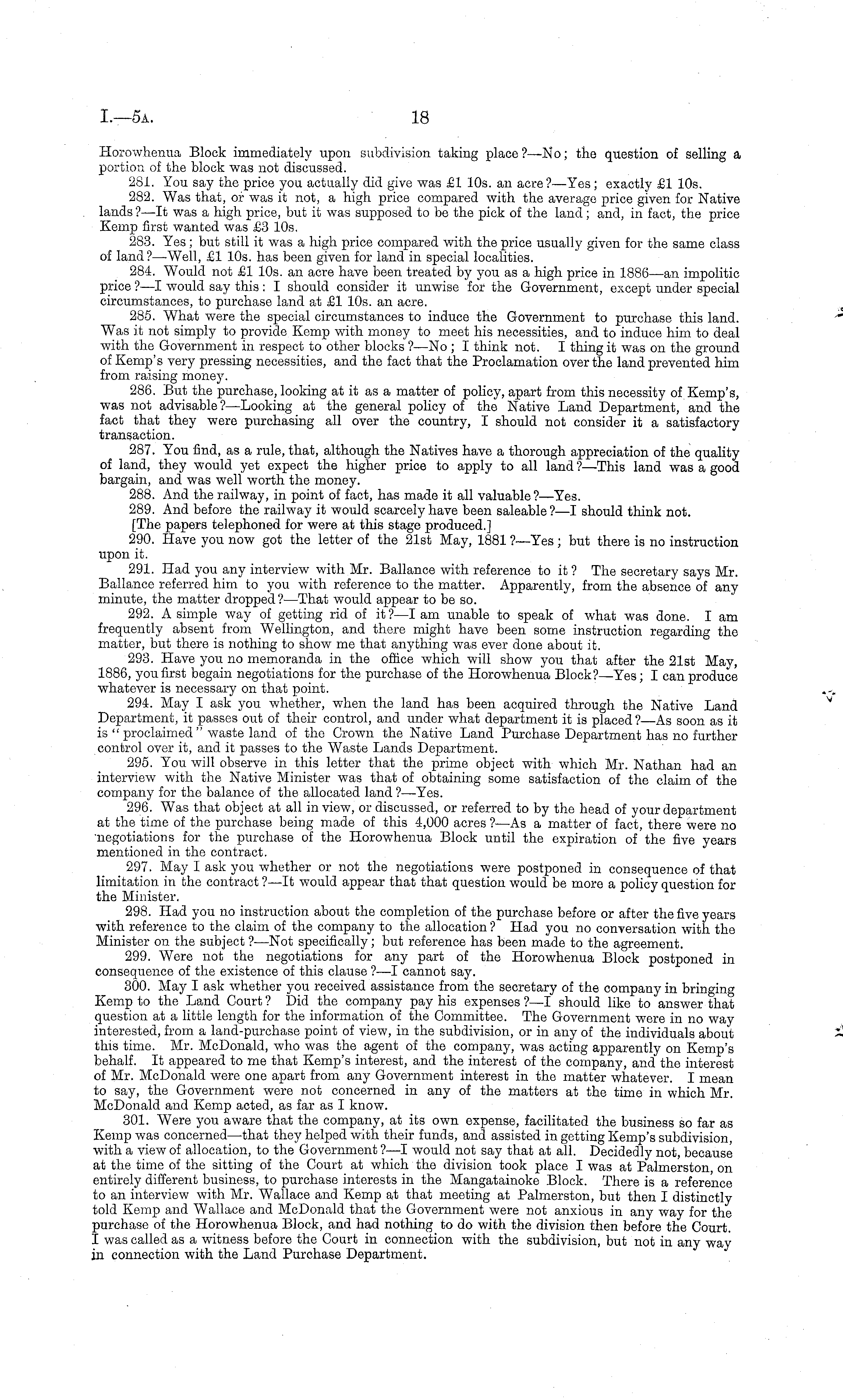 Horowhenua Block immediately upon subdivision taking place ?—No; the question of selling a portion of the block was not discussed. 281. You say the price you actually did give was £1 10s. an acre?— Yes; exactly £1 10s. 282. Was that, or was it not, a high price compared with the average price given for Native lands ?—lt was a high price, but it was supposed to be the pick of the land; and, in fact, the price Kemp first wanted was £3 10s. 283. Yes; but still it was a high price compared with the price usually given for the same class of land?— Well, £1 10s. has been given for land in special localities. 284. Would not £1 10s. an acre have been treated by you as a high price in 1886—an impolitic price ?—I would say this: I should consider it unwise for the Government, except under special circumstances, to purchase land at £1 10s. an acre. 285. What were the special circumstances to induce the Government to purchase this land. Was it not simply to provide Kemp with money to meet his necessities, and to induce him to deal with the Government in respect to other blocks ?—No ; I think not. I thing it was on the ground of Kemp's very pressing necessities, and the fact that the Proclamation over the land prevented him from raising money. 286. But the purchase, looking at it as a matter of policy, apart from this necessity of Kemp's, was not advisable?— Looking at the general policy of the Native Land Department, and the fact that they were purchasing all over the country, I should not consider it a satisfactory transaction. 287. You find, as a rule, that, although the Natives have a thorough appreciation of the quality of land, they would yet expect the higher price to apply to all land ?■ —This land was a good bargain, and was well worth the money. 288. And the railway, in point of fact, has made it all valuable ?—Yes. 289. And before the railway it would scarcely have been saleable?—l should think not. [The papers telephoned for were at this stage produced.] 290. Have you now got the letter of the 21st May, 1881 ?—Yes ; but there is no instruction upon it. 291. Had you any interview with Mr. Ballance with reference to it ? The secretary says Mr. Ballance referred him to you with reference to the matter. Apparently, from the absence of any minute, the matter dropped? —That would appear to be so. 292. A simple way of getting rid of it?—l am unable to speak of what was done. lam frequently absent from Wellington, and there might have been some instruction regarding the matter, but there is nothing to show me that anything was ever done about it. 293. Have you no memoranda in the office which will show you that after the 21st May, 1886, you first begain negotiations for the purchase of the Horowhenua Block?— Yes; I can produce whatever is necessary on that point. 294. May I ask you whether, when the land has been acquired through the Native Land Department, it passes out of their control, and under what department it is placed?—As soon as it is " proclaimed " waste land of the Crown the Native Land Purchase Department has no further control over it, and it passes to the Waste Lands Department. 295. You will observe in this letter that the prime object with which Mr. Nathan had an interview with the Native Minister was that of obtaining some satisfaction of the claim of the company for the balance of the allocated land ?—Yes. 296. Was that object at all in view, or discussed, or referred to by the head of your department at the time of the purchase being made of this 4,000 acres ?—As a matter of fact, there were no negotiations for the purchase of the Horowhenua Block until the expiration of the five years mentioned in the contract. 297. May I ask you whether or not the negotiations were postponed in consequence of that limitation in the contract ?—lt would appear that that question would be more a policy question for the Minister. 298. Had you no instruction about the completion of the purchase before or after the five years with reference to the claim of the company to the allocation ? Had you no conversation with the Minister on the subject ? —Not specifically; but reference has been made to the agreement. 299. Were not the negotiations for any part of the Horowhenua Block postponed in consequence of the existence of this clause ?—I cannot say. 300. May I ask whether you received assistance from the secretary of the company in bringing Kemp to the Land Court ? Did the company pay his expenses ?—I should like to answer that question at a little length for the information of the Committee. The Government were in no way interested, from a land-purchase point of view, in the subdivision, or in any of the individuals about this time. Mr. McDonald, who was the agent of the company, was acting apparently on Kemp's behalf. It appeared to me that Kemp's interest, and the interest of the company, and' the interest of Mr. McDonald were one apart from any Government interest in the matter whatever. I mean to say, the Government were not concerned in any of the matters at the time in which Mr. McDonald and Kemp acted, as far as I know. 301. Were you aware that the company, at its own expense, facilitated the business so far as Kemp was concerned—that they helped with their funds, and assisted in getting Kemp's subdivision, with a view of allocation, to the Government ?—I would not say that at all. Decidedly not, because at the time of the sitting of the Court at which the division took place I was at Palmerston, on entirely different business, to purchase interests in the Mangatainoke Block. There is a reference to an interview with Mr. Wallace and Kemp at that meeting at Palmerston, but then I distinctly told Kemp and Wallace and McDonald that the Government were not anxious in any way for the purchase of the Horowhenua Block, and had nothing to do with the division then before the Court. I was called as a witness before the Court in connection with t