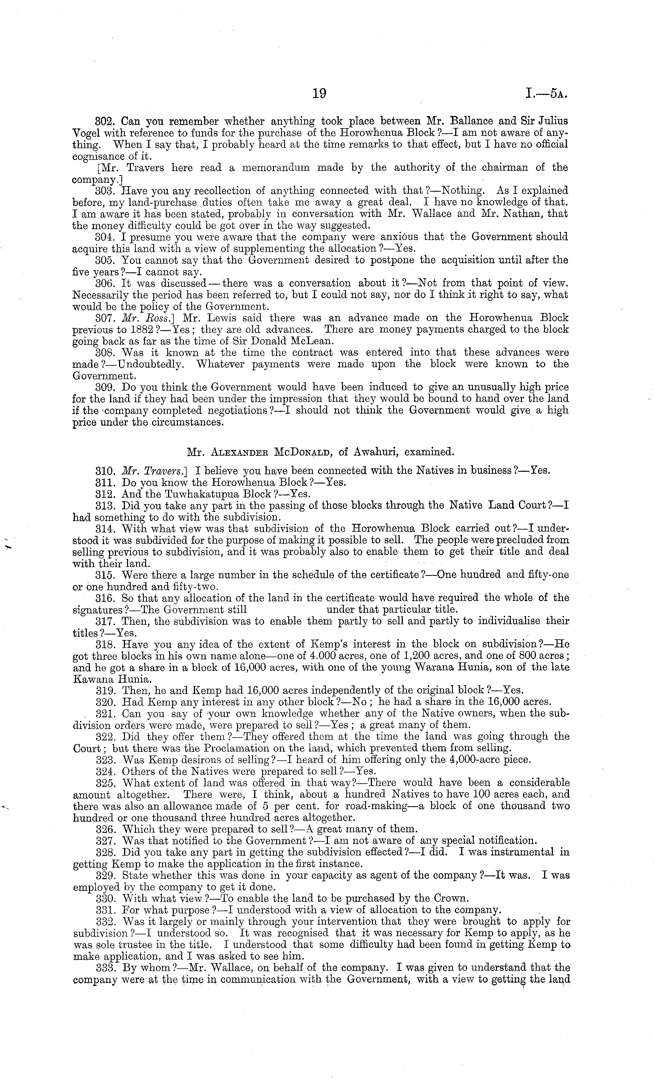 302. Can yon remember whether anything took place between Mr. Ballance and Sir Julius Vogel with reference to funds for the purchase of the Horowhenua Block ?—I am not aware of anything. When I say that, I probably heard at the time remarks to that effect, but I have no official cognisance of it. [Mr. Travers here read a memorandum made by the authority of the chairman of the company.] 303. Have you any recollection of anything connected with that ?—Nothing. As I explained before, my land-purchase duties often take me away a great deal. I have no knowledge of that. I am aware it has been stated, probably in conversation with Mr. Wallace and Mr. Nathan, that the money difficulty could be got over in the way suggested. 304. I presume you were aware that the company were anxious that the Government should acquire this land with a view of supplementing the allocation ?—Yes. 305. You cannot say that the Government desired to postpone the acquisition until after the five years'?—l cannot say. 306. It was discussed — there was a conversation about it ?—Not from that point of view. Necessarily the period has been referred to, but I could not say, nor do I think it right to say, what would be the policy of the Government. 307. Mr. Boss.] Mr. Lewis said there was an advance made on the Horowhenua Block previous to 1882?— Yes; they are old advances. There are money payments charged to the block going back as far as the time of Sir Donald McLean. 308. Was it known at the time the contract was entered into that these advances were made ?—Undoubtedly. Whatever payments were made upon the block were known to the Government. 309. Do you think the Government would have been induced to give an unusually high price for the land if they had been under the impression that they would be bound to hand over the land if the company completed negotiations ?—I should not think the Government would give a high price under the circumstances. Mr. Alexandee McDonald, of Awahuri, examined. 310. Mr. Travers.] I believe you have been connected with the Natives in business?— Yes. 311. Do you know the Horowhenua Block? —Yes. 312. And the Tuwhakatupua Block ?—Yes. 313. Did you take any part in the passing of those blocks through the Native Land Court ? —I had something to do with the subdivision. 314. With what view was that subdivision of the Horowhenua Block carried out ?—I understood it was subdivided for the purpose of making it possible to sell. The people were precluded from selling previous to subdivision, and it was probably also to enable them to get their title and deal with their land. 315. Were there a large number in the schedule of the certificate?— One hundred and fifty-one or one hundred and fifty-two. 316. So that any allocation of the land in the certificate would have required the whole of the signatures?— The Government still under that particular title. 317. Then, the subdivision was to enable them partly to sell and partly to individualise their titles ?—Yes. 318. Have you any idea of the extent of Kemp's interest in the block on subdivision?—He got three blocks in his own name alone —one of 4.000 acres, one of 1,200 acres, and one of 800 acres; and he got a share in a block of 16,000 acres, with one of the young Warana Hunia, son of the late Kawana Hunia. 319. Then, he and Kemp had 16,000 acres independently of the original block ?—Yes. 320. Had Kemp any interest in any other block ?■—No ; he had a share in the 16,000 acres. 321. Can you say of your own knowledge whether any of the Native owners, when the subdivision orders were made, were prepared to sell? —Yes ; a great many of them. 322. Did they offer them ? —They offered them at the time the land was going through the Court; but there was the Proclamation on the land, which prevented them from selling. 323. Was Kemp desirous of selling?—l heard of him offering only the 4,000-acre piece. 324. Others of the Natives were prepared to sell? —Yes. 325. What extent of land was offered in that way? —There would have been a considerable amount altogether. There were, I think, about a hundred Natives to have 100 acres each, and there was also an allowance made of 5 per cent, for road-making—a block of one thousand two hundred or one thousand three hundred acres altogether. 326. Which they were prepared to sell? —A great many of them. 327. Was that notified to the Government ? —I am not aware of any special notification. 328. Did you take any part in getting the subdivision effected ? —I did. I was instrumental in getting Kemp to make the application in the first instance. 329. State whether this was done in your capacity as agent of the company ? —lt was. I was employed by the company to get it done. 330. With what view ? —To enable the land to be purchased by the Crown. 331. For what purpose ? —I understood with a view of allocation to the company. 332. Was it largely or mainly through your intervention that they were brought to apply for subdivision ?—I understood so. It was recognised that it was necessary for Kemp to apply, as he was sole trustee in the title. I understood that some difficulty had been found in getting Kemp to make application, and I was asked to see him. 333. By whom ?—Mr. Wallace, on behalf of the company. I was given to understand that the company were at the time in communication with the Government, with a view to getting the land