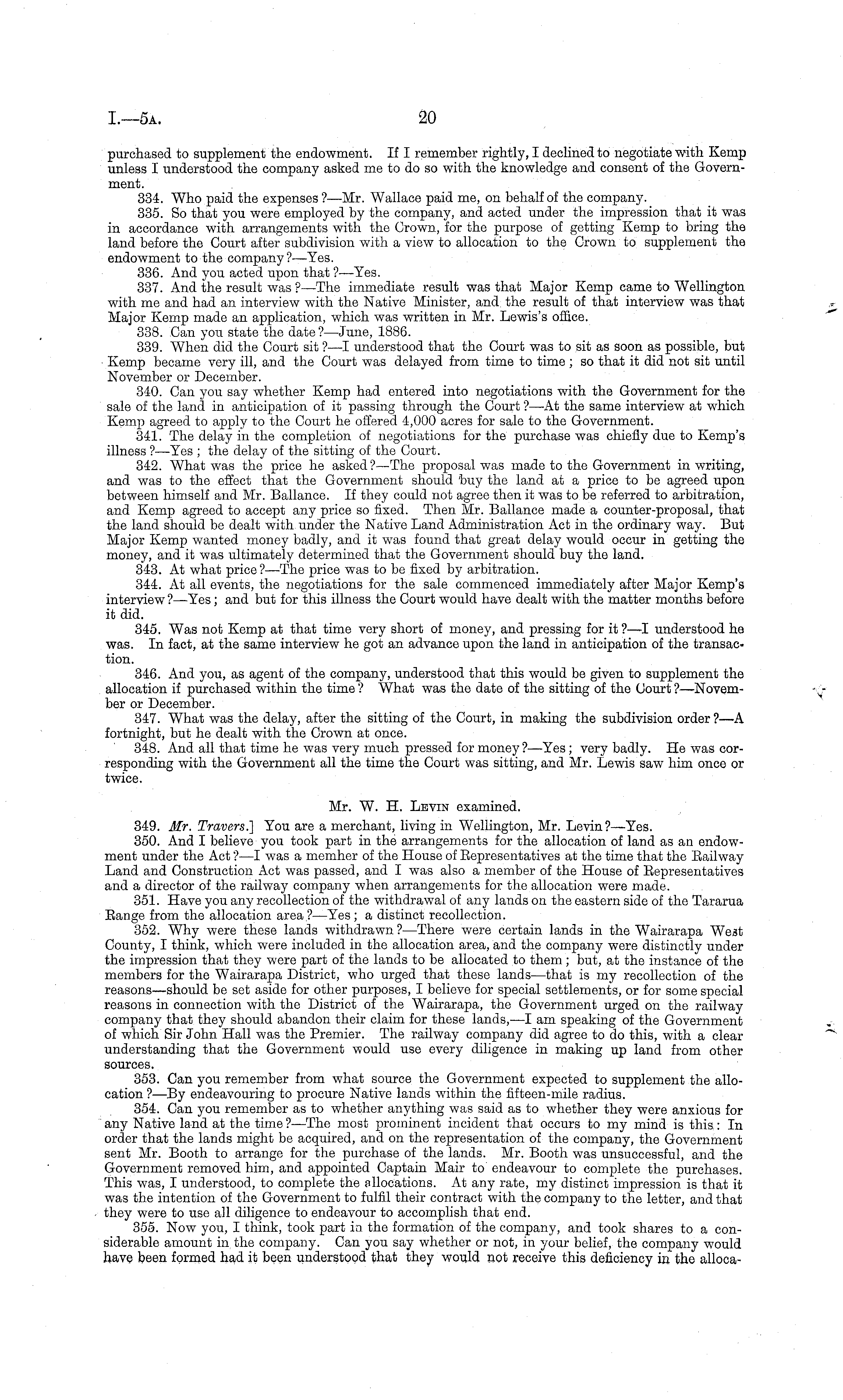 purchased to supplement the endowment. If I remember rightly, I declined to negotiate with Kemp unless I understood the company asked me to do so with the knowledge and consent of the Government. 334. Who paid the expenses ?—Mr. Wallace paid me, on behalf of the company. 335. So that you were employed by the company, and acted under the impression that it was in accordance with arrangements with the Grown, for the purpose of getting Kemp to bring the land before the Court after subdivision with a view to allocation to the Crown to supplement the endowment to the company? —Yes. 336. And you acted upon that ? —Yes. 337. And the result was ? —The immediate result was that Major Kemp came to Wellington with me and had an interview with the Native Minister, and the result of that interview was that Major Kemp made an application, which was written in Mr. Lewis's office. 338. Can you state the date?—June, 1886. 339. When did the Court sit ? —I understood that the Court was to sit as soon as possible, but Kemp became very ill, and the Court was delayed from time to time ; so that it did not sit until November or December. 340. Can you say whether Kemp had entered into negotiations with the Government for the sale of the land in anticipation of it passing through the Court ?—At the same interview at which Kemp agreed to apply to the Court he offered 4,000 acres for sale to the Government. 341. The delay in the completion of negotiations for the purchase was chiefly due to Kemp's illness ?—Yes ; the delay of the sitting of the Court. 342. What was the price he asked?—The proposal was made to the Government in writing, and was to the effect that the Government should buy the land at a price to be agreed upon between himself and Mr. Ballance. If they could not agree then it was to be referred to arbitration, and Kemp agreed to accept any price so fixed. Then Mr. Ballance made a counter-proposal, that the land should be dealt with under the Native Land Administration Act in the ordinary way. But Major Kemp wanted money badly, and it was found that great delay would occur in getting the money, and it was ultimately determined that the Government should buy the land. 343. At what price?—The price was to be fixed by arbitration. 344. At all events, the negotiations for the sale commenced immediately after Major Kemp's interview ? —Yes; and but for this illness the Court would have dealt with the matter months before it did. 345. Was not Kemp at that time very short of money, and pressing for it?—I understood he was. In fact, at the same interview he got an advance upon the land in anticipation of the transaction. 346. And you, as agent of the company, understood that this would be given to supplement the allocation if purchased within the time ? What was the date of the sitting of the Court ?—November or December. 347. What was the delay, after the sitting of the Court, in making the subdivision order ?—A fortnight, but he dealt with the Crown at once. 348. And all that time he was very much pressed for money?—Yes; very badly. He was corresponding with the Government all the time the Court was sitting, and Mr. Lewis saw him once or twice. Mr. W. H. Levin examined. 349. Mr. Travers.] You are a merchant, living in Wellington, Mr. Levin?—Yes. 350. And I believe you took part in the arrangements for the allocation of land as an endowment under the Act ? —I was a memher of the House of Bepresentatives at the time that the Bailway Land and Construction Act was passed, and I was also a member of the House of Bepresentatives and a director of the railway company when arrangements for the allocation were made. 351. Have you any recollection of the withdrawal of any lands on the eastern side of the Tararua Bange from the allocation area ? —Yes ; a distinct recollection. 352. Why were these lands withdrawn ?—There were certain lands in the Wairarapa West County, I think, which were included in the allocation area, and the company were distinctly under the impression that they were part of the lands to be allocated to them; but, at the instance of the members for the Wairarapa District, who urged that these lands—that is my recollection of the reasons—should be set aside for other purposes, I believe for special settlements, or for some special reasons in connection with the District of the Wairarapa, the Government urged on the railway company that they should abandon their claim for these lands, —I am speaking of the Government of which Sir John Hall was the Premier. The railway company did agree to do this, with a clear understanding that the Government would use every diligence in making up land from other sources. 353. Can you remember from what source the Government expected to supplement the allocation ?—By endeavouring to procure Native lands within the fifteen-mile radius. 354. Can you remember as to whether anything was said as to whether they were anxious for any Native land at the time ? —The most prominent incident that occurs to my mind is this : In order that the lands might be acquired, and on the representation of the company, the Government sent Mr. Booth to arrange for the purchase of the lands. Mr. Booth was unsuccessful, and the Government removed him, and appointed Captain Mair to endeavour to complete the purchases. This was, I understood, to complete the allocations. At any rate, my distinct impression is that it was the intention of the Government to fulfil their contract with the company to the letter, and that . they were to use all diligence to endeavour to accomplish that end. 355. Now you, I think, took part in the formation of the company, and took shares to a considerable amount in, the company. Can you say whether or not, in your belief, the company would have been formed had it been understood that they would not receive this deficiency in the alloca-