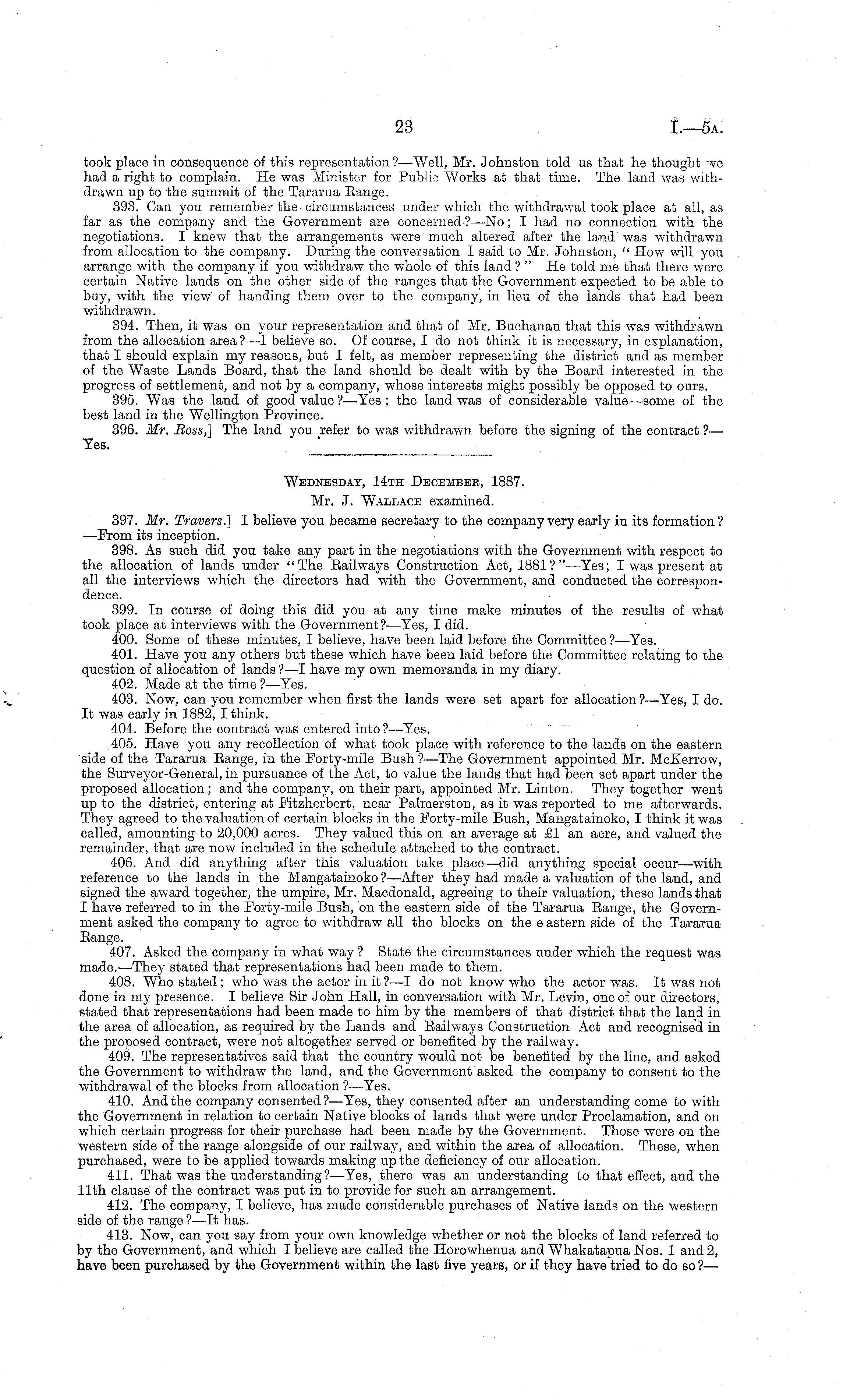 Wednesday, 14th Deoembee, 1887. Mr. J. Wallace examined. 397. Mr. Travers.] I believe you became secretary to the company very early in its formation? ■ —Prom its inception. 398. As such did you take any part in the negotiations with the Government with respect to the allocation of lands under "The Eailways Construction Act, 1881?"— Yes; I was present at all the interviews which the directors had with the Government, and conducted the correspondence. 399. In course of doing this did you at any time make minutes of the results of what took place at interviews with the Government? —Yes, I did. 400. Some of these minutes, I believe, have been laid before the Committee ?—Yes. 401. Have you any others but these which have been laid before the Committee relating to the question of allocation of lands ? —I have my own memoranda in my diary. 402. Made at the time ?—Yes. 403. Now, can you remember when first the lands were set apart for allocation ?—Yes, I do. It was early in 1882, I think. 404. Before the contract was entered into?— Yes. .405. Have you any recollection of what took place with reference to the lands on the eastern side of the Tararua Eange, in the Forty-mile Bush ?—The Government appointed Mr. McKerrow, the Surveyor-General, in pursuance of the Act, to value the lands that had been set apart under the proposed allocation ; and the company, on their part, appointed Mr. Linton. They together went up to the district, entering at Fitzherbert, near Palmerston, as it was reported to me afterwards. They agreed to the valuation of certain blocks in the Forty-mile Bush, Mangatainoko, I think it was called, amounting to 20,000 acres. They valued this on an average at £1 an acre, and valued the remainder, that are now included in the schedule attached to the contract. 406. And did anything after this valuation take place—did anything special occur —with reference to the lands in the Mangatainoko ? —After they had made a valuation of the land, and signed the award together, the umpire, Mr. Macdonald, agreeing to their valuation, these lands that I have referred to in the Forty-mile Bush, on the eastern side of the Tararua Eange, the Government asked the company to agree to withdraw all the blocks on the c astern side of the Tararua Eange. 407. Asked the company in what way ? State the circumstances under which the request was made.—They stated that representations had been made to them. 408. Who stated; who was the actor in it ? —I do not know who the actor was. It was not done in my presence. I believe Sir John Hall, in conversation with Mr. Levin, one of our directors, stated that representations had been made to him by the members of that district that the land in the area of allocation, as required by the Lands and Eailways Construction Act and recognised in the proposed contract, were not altogether served or benefited by the railway. 409. The representatives said that the country would not be benefited by the line, and asked the Government to withdraw the land, and the Government asked the company to consent to the withdrawal of the blocks from allocation ?—Yes. 410. And the company consented ?—Yes, they consented after an understanding come to with the Government in relation to certain Native blocks of lands that were under Proclamation, and on which certain progress for their purchase had been made by the Government. Those were on the western side of the range alongside of our railway, and within the area of allocation. These, when purchased, were to be applied towards making up the deficiency of our allocation. 411. That was the understanding?— Yes, there was an understanding to that effect, and the 11th clause of the contract was put in to provide for such an arrangement. 412. The company, I believe, has made considerable purchases of Native lands on the western side of the range ?—lt has. 413. Now, can you say from your own knowledge whether or not the blocks of land referred to by the Government, and which I believe are called the Horowhenua and Whakatapua Nos. 1 and 2, have been purchased by the Government within the last five years, or if they have tried to do so ? —