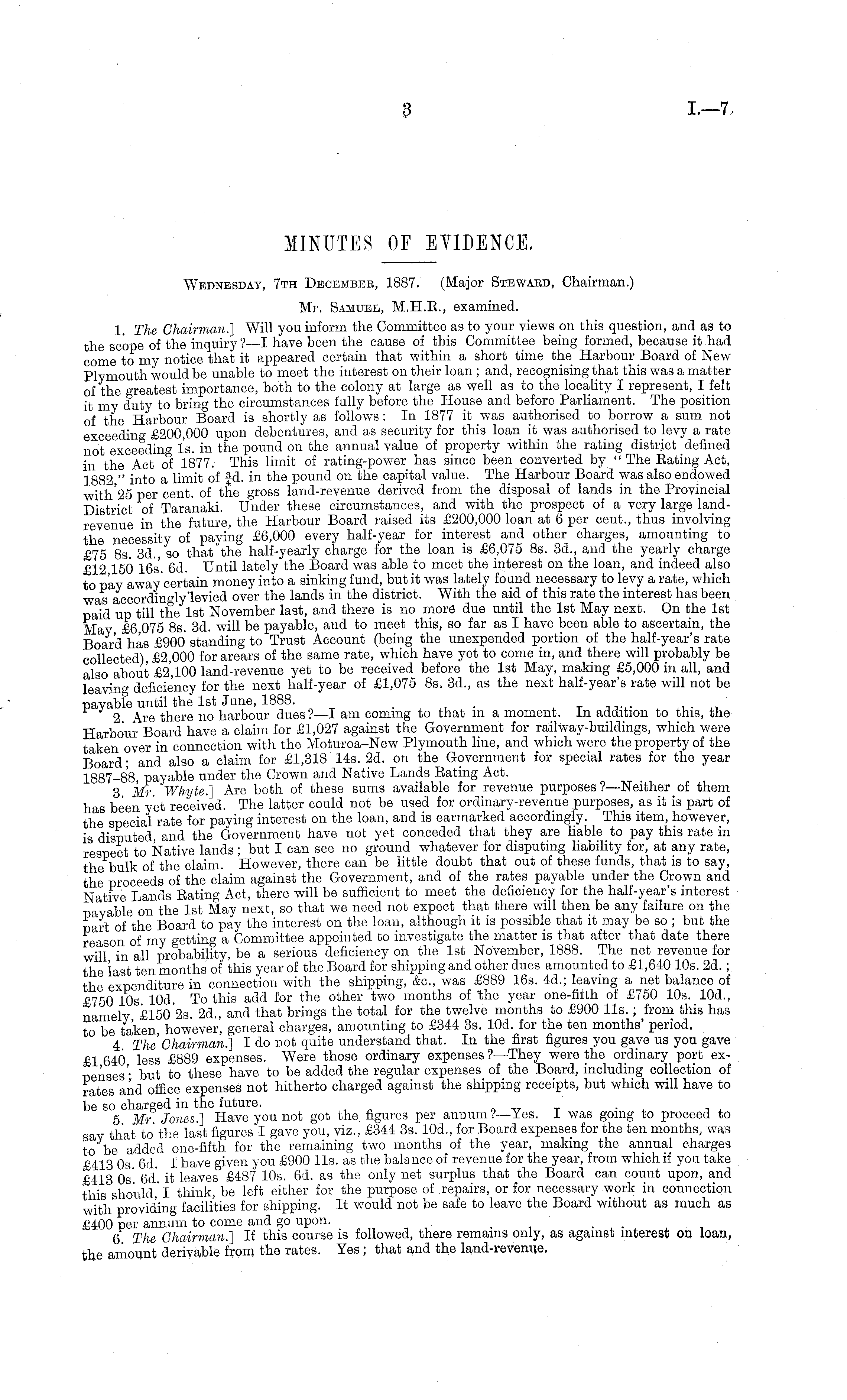 Wednesdat, 7th Decembee, 1887. (Major Steward, Chairman.) Mr. Samuel, M.H.E., examined. 1. The Chairman.] Will you inform the Committee as to your views on this question, and as to the scope of the inquiry ?—I have been the cause of this Committee being formed, because it had come to my notice that it appeared certain that within a short time the Harbour Board of New Plymouth would be unable to meet the interest on their loan ; and, recognising that this was a matter of the greatest importance, both to the colony at large as well as to the locality I represent, I felt it my duty to bring the circumstances fully before the House and before Parliament. The position of the Harbour Board is shortly as follows : In 1877 it was authorised to borrow a sum not exceeding £200,000 upon debentures, and as security for this loan it was authorised to levy a rate not exceeding Is. in the pound on the annual value of property within the rating district defined in the Act of 1877. This limit of rating-power has since been converted by " The Eating Act, 1882 " into a limit of fd. in the pound on the capital value. The Harbour Board was also endowed with'2s per cent, of the gross land-revenue derived from the disposal of lands in the Frovincial District of Taranaki. Under these circumstances, and with the prospect of a very large landrevenue in the future, the Harbour Board raised its £200,000 loan at 6 per cent., thus involving the necessity of paying £6,000 every half-year for interest and other charges, amounting to £75 8s 3d., so that the half-yearly charge for the loan is £6,075 Bs. 3d., and the yearly charge £12 150 16s. 6d. Until lately the Board was able to meet the interest on the loan, and indeed also to pay away certain money into a sinking fund, but it was lately found necessary to levy a rate, which was accordingly'levied over the lands in the district. With the aid of this rate the interest has been paid up till the Ist November last, and there is no more due until the Ist May next. On the Ist May £6 075 Bs. 3d. will be payable, and to meet this, so far as I have been able to ascertain, the Board has £900 standing to Trust Account (being the unexpended portion of the half-year's rate collected), £2,000 forarears of the same rate, which have yet to come in, and there will probably be also about £2,100 land-revenue yet to be received before the Ist May, making £5,000 in all, and leaving deficiency for the next half-year of £1,075 Bs. 3d., as the next half-year's rate will not be payabfe until the Ist June, 1888. _ , 2 Are there no harbour dues?—l am coming to that in a moment. In addition to this, the Harbour Board have a claim for £1,027 against the Government for railway-buildings, which were taken over in connection with the Moturoa-New Plymouth line, and which were the property of the Board; and also a claim for £1,318 14s. 2d. on the Government for special rates for the year 1887-88 payable under the Crown and Native Lands Eating Act. 3 Mr. Whyte.] Are both of these sums available for revenue purposes?— Neither of them has been yet received. The latter could not be used for ordinary-revenue purposes, as it is part of the special rate for paying interest on the loan, and is earmarked accordingly. This item, however, is disputed and the Government have not yet conceded that they are liable to pay this rate in respect to Native lands ; but I can see no ground whatever for disputing liability for, at any rate, the bulk of the claim. However, there can be little doubt that out of these funds, that is to say, the proceeds of the claim against the Government, and of the rates payable under the Crown and Native Lands Eating Act, there will be sufficient to meet the deficiency for the half-year's interest payable on the Ist May next, so that we need not expect that there will then be any failure on the part of the Board to pay the interest on the loan, although it is possible that it may be so ; but the reason of my getting a Committee appointed to investigate the matter is that after that date there will in all probability, be a serious deficiency on the Ist November, 1888. The net revenue for the last ten months of this year of the Board for shipping and other dues amounted to £ L,640 10s. 2d.; the expenditure in connection with the shipping, &c, was £889 16s. 4d.; leaving a net balance of £750 10s lOd. To this add for the other two months of 'the year one-fifth of £750 10s. 10d., namely £150 2s. 2d., and that brings the total for the twelve months to £900 lis.; from this has to be taken however, general charges, amounting to £344 3s. lOd. for the ten months' period. 4 The Chairman.] Ido not quite understand that. In the first figures you gave us you gave £1 640 less £889 expenses. Were those ordinary expenses ?—They were the ordinary port expenses'- but to these have to be added the regular expenses of the Board, including collection of rates and office expenses not hitherto charged against the shipping receipts, but which will have to be so charged in the future. . 5 Mr Jones.] Have you not got the figures per annum?— Yes. I was going to proceed to say that to the last figures I gave you, viz., £344 3s. 10d., for Board expenses for the ten months, was to be added one-fifth for the remaining two months of the year, making the annual charges £413 0s 6d. I have given you £900 lis. as the balance of revenue for the year, from which if you take £413 0s 6d. it leaves £487 10s. 61. as the only net surplus that the Board can count upon, and this should ' I think, be loft either for the purpose of repairs, or for necessary work in connection with providing facilities for shipping. It would not be safe to leave the Board without as much as £400 per annum to come and go upon. _ ...... 6 The Chairman.] If this course is followed, there remains only, as against interest on loan, the amount derivable from the rates. Yes; that and the land-revenue.