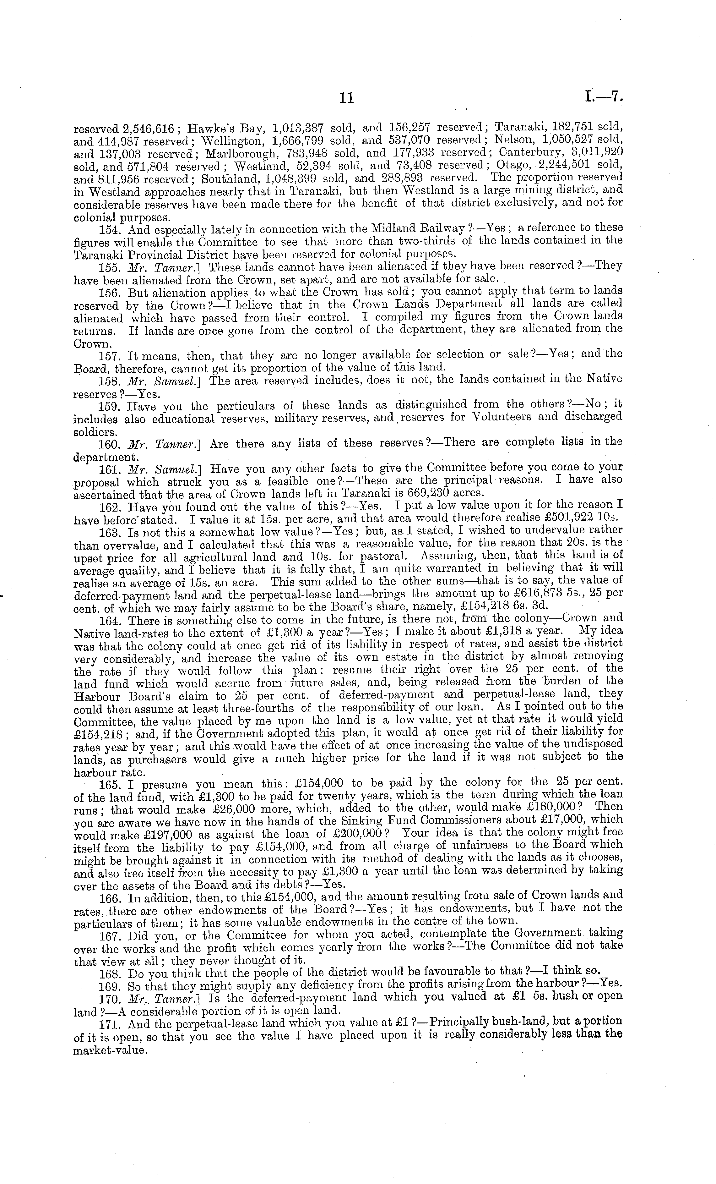 reserved 2,546,616 ; Hawke's Bay, 1,013,387 sold, and 156,257 reserved; Taranaki, 182,751 sold, and 414,987 reserved; Wellington, 1,666,799 sold, and 537,070 reserved; Nelson, 1,050,527 sold, and 137,003 reserved; Marlborough, 783,948 sold, and 177,933 reserved; Canterbury, 3,011,920 sold, and 571,804 reserved ; Westland, 52,394 sold, and 73,408 reserved; Otago, 2,244,501 sold, and 811,956 reserved; Southland, 1,048,399 sold, and 288,893 reserved. The proportion reserved in Westland approaches nearly that in Taranaki, but then Westland is a large mining district, and considerable reserves have been made there for the benefit of that district exclusively, and not for colonial purposes. 154. And especially lately in connection with the Midland Eailway ?—Yes ; a reference to_ these figures will enable the Committee to see that more than two-thirds of the lands contained in the Taranaki Provincial District have been reserved for colonial purposes. 155. Mr. Tanner.] These lands cannot have been alienated if they have been reserved ?—They have been alienated from the Crown, set apart, and are not available for sale. 156. But alienation applies to what the Crown has sold; you cannot apply that term to lands reserved by the Crown ? —I believe that in the Crown Lands Department all lands are called alienated which have passed from their control. I compiled my figures from the Crown lands returns. If lands are once gone from the control of the department, they are alienated from the Crown. 157. It means, then, that they are no longer available for selection or sale? —Yes; and the Board, therefore, cannot get its proportion of the value of this land. 158. Mr. Samuel.] The area reserved includes, does it not, the lands contained in the Native reserves ?■ —Yes. 159. Have you the particulars of these lands as distinguished from the others ?—No ; it includes also educational reserves, military reserves, and reserves for Volunteers and discharged soldiers. 160. Mr. Tanner.] Are there any lists of these reserves ? —There are complete lists in the department. 161. Mr. Samuel.] Have you any other facts to give the Committee before you come to your proposal which struck you as a feasible one?— These are the principal reasons. I have also ascertained that the area of Crown lands left in Taranaki is 669,230 acres. 162. Have you found out the value of this ?—Yes. I put a low value upon it for the reason I have before" stated. I value it at 15s. per acre, and that area would therefore realise £501,922 10s. 163. Is not this a somewhat low value?— Yes; but, as I stated, I wished to undervalue rather than overvalue, and I calculated that this was a reasonable value, for the reason that 20s. is the upset price for all agricultural land and 10s. for pastoral. Assuming, then, that this land is of average quality, and I believe that it is fully that, I am quite warranted in believing that it will realise an average of 15s. an acre. This sum added to the other sums—that is to say, the value of deferred-payment land and the perpetual-lease land—brings the amount up to £616,873 55., 25 per cent, of which we may fairly assume to be the Board's share, namely, £154,218 6s. 3d. 164. There is something else to come in the future, is there not, from the colony—Crown and Native land-rates to the extent of £1,300 a year?— Yes; I make it about £1,318 a year. My idea was that the colony could at once get rid of its liability in respect of rates, and assist the district very considerably, and increase the value of its own estate in the district by almost removing the rate if they would follow this plan: resume their right over the 25 per cent, of the land fund which would accrue from future sales, and, being released from the burden of the Harbour Board's claim to 25 per cent, of deferred-payment and perpetual-lease land, they could then assume at least three-fourths of the responsibility of our loan. As I pointed out to the Committee, the value placed by me upon the land is a low value, yet at that rate it would yield £154,218 ; and, if the Government adopted this plan, it would at once get rid of their liability for rates year by year; and this would have the effect of at once increasing the value of the undisposed lands, as purchasers would give a much higher price for the land if it was not subject to the harbour rate. 165. I presume you mean this: £154,000 to be paid by the colony for the 25 per cent, of the land fund, with £1,300 to be paid for twenty years, which is the term during which the loan runs; that would make £26,000 more, which, added to the other, would make £180,000 ? Then you are aware we have now in the hands of the. Sinking Fund Commissioners about £17,000, which would make £197,000 as against the loan of £200,000 ? Your idea is that the colony might free itself from the liability to pay £154,000, and from all charge of unfairness to the Board which might be brought against it in connection with its method of dealing with the lands as it chooses, and also free itself from the necessity to pay £1,300 a year until the loan was determined by taking over the assets of the Board and its debts ? —Yes. 166. In addition, then, to this £154,000, and the amount resulting from sale of Crown lands and rates, there are other endowments of the Board ?—Yes; it has endowments, but I have not the particulars of them; it has some valuable endowments in the centre of the town. 167. Did you, or the Committee for whom you acted, contemplate the Government taking over the works and the profit which comes yearly from the works ?—The Committee did not take that view at all; they never thought of it. 168. Do you think that the people of the district would be favourable to that ?—I think so. 169. So that they might supply any deficiency from the profits arising from the harbour?— Yes. 170. Mr.. Tanner.] Is the deferred-payment land which you valued at £1 ss. bush or open land ? 