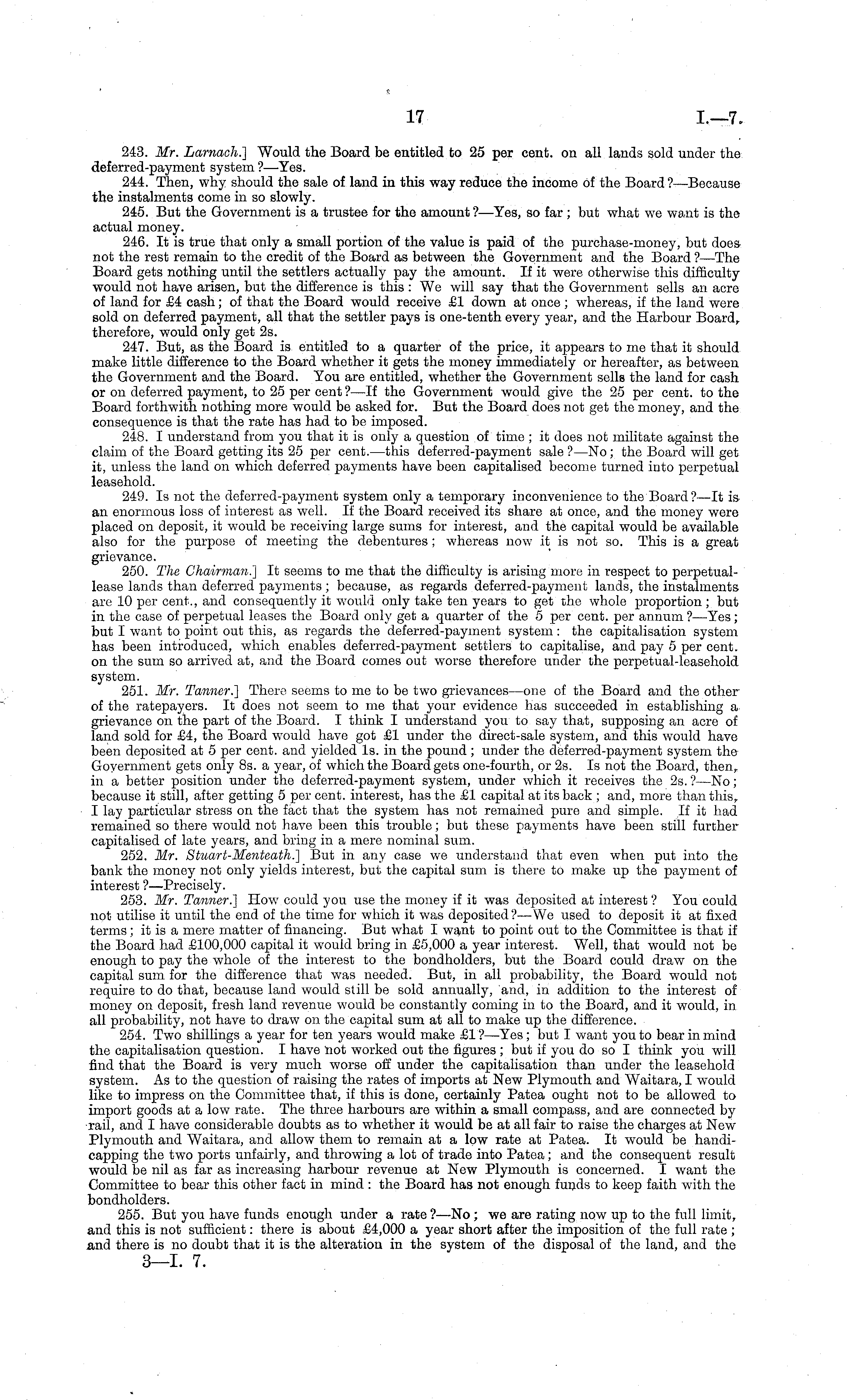 243. Mr. Larnach.] Would the Board be entitled to 25 per cent, on all lands sold under the deferred-payment system ?—Yes. 244. Then, why should the sale of land in this way reduce the income of the Board ?—Because the instalments come in so slowly. 245. But the Government is a trustee for the amount ?—Yes, so far ; but what we want is the actual money. 246. It is true that only a small portion of the value is paid of the purchase-money, but does not the rest remain to the credit of the Board as between the Government and the Board ?—The Board gets nothing until the settlers actually pay the amount. If it were otherwise this difficulty would not have arisen, but the difference is this : We will say that the Government sells an acre of land for £4 cash; of that the Board would receive £1 down at once ; whereas, if the land were sold on deferred payment, all that the settler pays is one-tenth every year, and the Harbour Board, therefore, would only get 2s. 247. But, as the Board is entitled to a quarter of the price, it appears to me that it should make little difference to the Board whether it gets the money immediately or hereafter, as between the Government and the Board. You are entitled, whether the Government sells the land for cash or on deferred payment, to 25 per cent ?—lf the Government would give the 25 per cent, to the Board forthwith nothing more would be asked for. But the Board does not get the money, and the consequence is that the rate has had to be imposed. 248. I understand from you that it is only a question of time ; it does not militate against the claim of the Board getting its 25 per cent. —this deferred-payment sale ?—No ; the Board will get it, unless the land on which deferred payments have been capitalised become turned into perpetual leasehold. 249. Is not the deferred-payment system only a temporary inconvenience to the Board?—lt is an enormous loss of interest as well. If the Board received its share at once, and the money were placed on deposit, it would be receiving large sums for interest, and the capital would be available also for the purpose of meeting the debentures ; whereas now it is not so. This is a great grievance. 250. The Chairman.] It seems to me that the difficulty is arising more in respect to perpetuallease lands than deferred payments ; because, as regards deferred-payment lands, the instalments are 10 per cent., and consequently it would only take ten years to get tho whole proportion; but in the case of perpetual leases the Board only get a quarter of the 5 per cent, per annum ? —Yes ; but I want to point out this, as regards the deferred-payment system: the capitalisation system has been introduced, which enables deferred-payment settlers to capitalise, and pay 5 per cent. on the sum so arrived at, and the Board comes out worse therefore under the perpetual-leasehold system. 251. Mr. Tanner.] There seems to me to be two grievances—one of the Board and the other of the ratepayers. It does not seem to me that your evidence has succeeded in establishing a grievance on the part of the Board. I think I understand you to say that, supposing an acre of land sold for £4, the Board would have got £1 under the direct-sale system, and this would have been deposited at 5 per cent, and yielded Is. in the pound; under the deferred-payment system the Government gets only Bs. a year, of which the Board gets one-fourth, or 2s. Is not the Board, then, in a better position under the deferred-payment system, under which it receives the 2s. ?—No; because it still, after getting 5 per cent, interest, has the £1 capital at its back ; and, more than this, I lay particular stress on the fact that the system has not remained pure and simple. If it had remained so there would not have been this trouble; but these payments have been still further capitalised of late years, and bring in a mere nominal sum. 252. Mr. Stuart-Menteath.] But in any case we understand that even when put into the bank the money not only yields interest, but the capital sum is there to make up the payment of interest ?—Precisely. 253. Mr. Tanner.] How could you use the money if it was deposited at interest ? You could not utilise it until the end of the time for which it was deposited ?—We used to deposit it at fixed terms; it is a mere matter of financing. But what I want to point out to the Committee is that if the Board had £100,000 capital it would bring in £5,000 a year interest. Well, that would not be enough to pay the whole of the interest to the bondholders, but the Board could draw on the capital sum for the difference that was needed. But, in all probability, the Board would not require to do that, because land would still be sold annually, and, in addition to the interest of money on deposit, fresh land revenue would be constantly coming in to the Board, and it would, in all probability, not have to draw on the capital sum at all to make up the difference. 254. Two shillings a year for ten years would make £1 ? —Yes; but I want you to bear in mind the capitalisation question. I have not worked out the figures ; but if you do so I think you will find that the Board is very much worse off under the capitalisation than under the leasehold system. As to the question of raising the rates of imports at New Plymouth and Waitara, I would like to impress on the Committee that, if this is done, certainly Patea ought not to be allowed to import goods at a low rate. The three harbours are within a small compass, and are connected by ■rail, and I have considerable doubts as to whether it would be at all fair to raise the charges at New Plymouth and Waitara, and allow them to remain at a low rate at Patea. It would be handicapping the two ports unfairly, and throwing a lot of trade into Patea; and the consequent result would be nil as far as increasing harbour revenue at New Plymouth is concerned. I want the Committee to bear this other fact in mind : the 