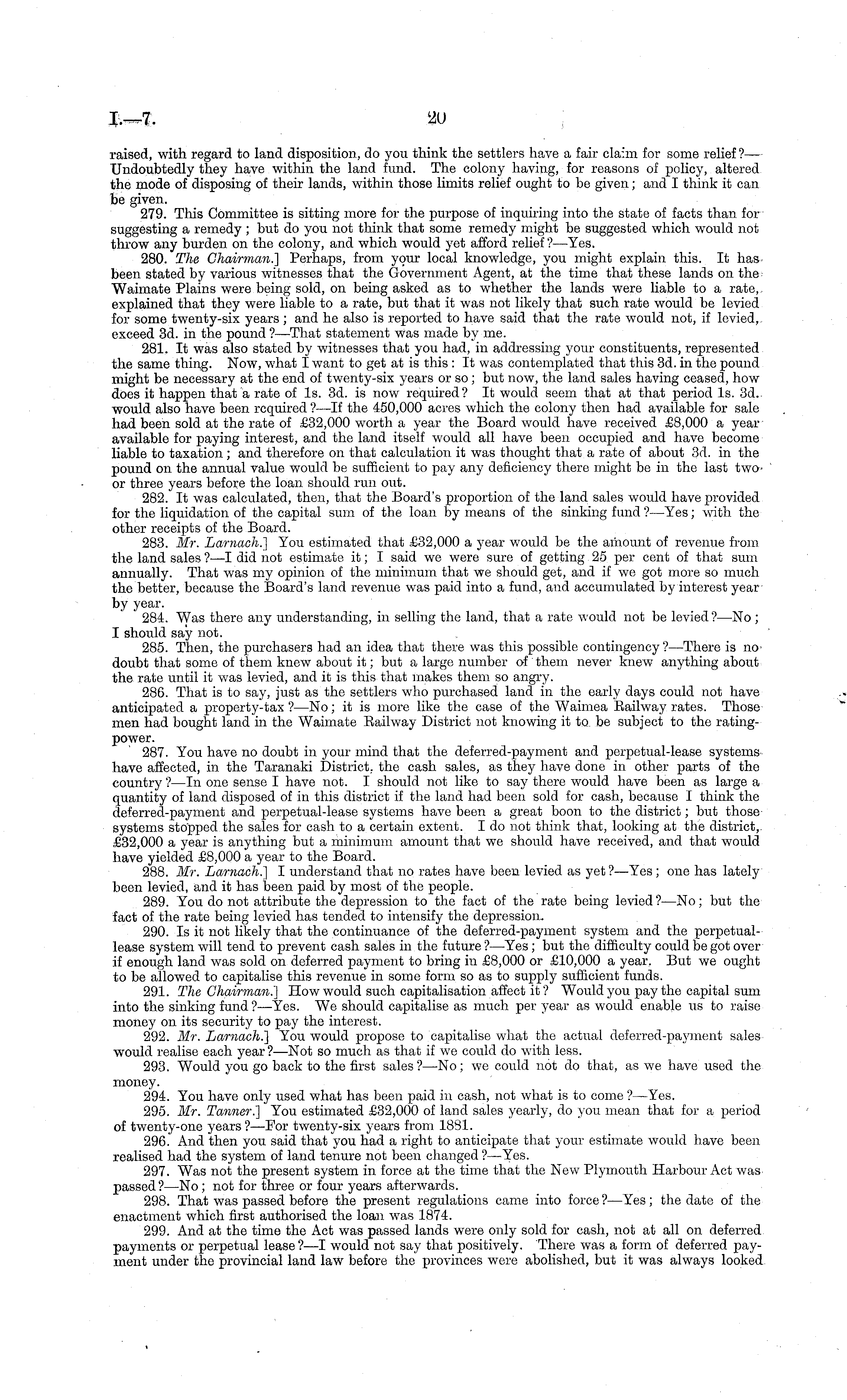 raised, with regard to land disposition, do you think the settlers have a fair claim for some relief ?— Undoubtedly they have within the land fund. The colony having, for reasons of policy, altered the mode of disposing of their lands, within those limits relief ought to be given; and I think it can be given. 279. This Committee is sitting more for the purpose of inquiring into the state of facts than for suggesting a remedy ; but do you not think that some remedy might be suggested which would not throw any burden on the colony, and which would yet afford relief ?—Yes. 280. The Chairman.] Perhaps, from your local knowledge, you might explain this. It hasbeen stated by various witnesses that the Government Agent, at the time that these lands on the Waimate Plains were being sold, on being asked as to whether the lands were liable to a rate,, explained that they were liable to a rate, but that it was not likely that such rate would be levied for some twenty-six years ; and he also is reported to have said that the rate would not, if levied, exceed 3d. in the pound ?—That statement was made by me. 281. It was also stated by witnesses that you had, in addressing your constituents, represented the same thing. Now, what I want to get at is this : It was contemplated that this 3d. in the pound might be necessary at the end of twenty-six years or so; but now, the land sales having ceased, how does it happen that a rate of Is. 3d. is now required? It would seem that at that period Is. 3d. would also have been required ?—lf the 450,000 acres which the colony then had available for sale had been sold at the rate of £32,000 worth a year the Board would have received £8,000 a year available for paying interest, and the land itself would all have been occupied and have become liable to taxation ; and therefore on that calculation it was thought that a rate of about 3d. in the pound on the annual value would be sufficient to pay any deficiency there might be in the last twoor three years before the loan should run out. 282. It was calculated, then, that the Board's proportion of the land sales would have provided for the liquidation of the capital sum of the loan by means of the sinking fund ?—Yes; with the other receipts of the Board. 283. Mr. Larnach.] You estimated that £32,000 a year would be the amount of revenue from the land sales ?—I did not estimate it; I said we were sure of getting 25 per cent of that sum annually. That was my opinion of the minimum that we should get, and if we got more so much the better, because the Board's land revenue was paid into a fund, and accumulated by interest year by year. 284. Was there any understanding, in selling the land, that a rate would not be levied?—No ; I should say not. 285. Then, the purchasers had an idea that there was this possible contingency ?—There is nodoubt that some of them knew about it; but a large number of them never knew anything about the rate until it was levied, and it is this that makes them so angry. 286. That is to say, just as the settlers who purchased land in the early days could not have anticipated a property-tax ?—No; it is more like the case of the Waimea Eailway rates. Those men had bought land in the Waimate Eailway District not knowing it to be subject to the ratingpower. 287. You have no doubt in your mind that the deferred-payment and perpetual-lease systems have affected, in the Taranaki District, the cash sales, as they have done in other parts of the country ?—ln one sense I have not. I should not like to say there would have been as large a quantity of land disposed of in this district if the land had been sold for cash, because I think the deferred-payment and perpetual-lease systems have been a great boon to the district; but those systems stopped the sales for cash to a certain extent. Ido not think that, looking at the district,. £32,000 a year is anything but a minimum amount that we should have received, and that would have yielded £8,000 a year to the Board. 288. Mr. Larnach.] I understand that no rates have been levied as yet ?—Yes ; one has lately been levied, and it has been paid by most of the people. 289. You do not attribute the depression to the fact of the rate being levied?—No; but the fact of the rate being levied has tended to intensify the depression. 290. Is it not likely that the continuance of the deferred-payment system and the perpetuallease system will tend to prevent cash sales in the future ?—Yes; but the difficulty could be got over if enough land was sold on deferred payment to bring in £8,000 or £10,000 a year. But we ought to be allowed to capitalise this revenue in some form so as to supply sufficient funds. 291. The Chairman.] How would such capitalisation affect it ? Would you pay the capital sum into the sinking fund ? —Yes. We should capitalise as much per year as would enable us to raise money on its security to pay the interest. 292. Mr. Larnach.] You would propose to capitalise what the actual deferred-payment sales would realise each year?— Not so much as that if we could do with less. 293. Would you go back to the first sales?—No; we could not do that, as we have used the money. 294. You have only used what has been paid in cash, not what is to come ? —Yes. 295. Mr. Tanner.] You estimated £32,000 of land sales yearly, do you mean that for a period of twenty-one years ? —For twenty-six years from 1881. 296. And then you said that you had a right to anticipate that your estimate would have been realised had the system of land tenure not been changed ?—Yes. 297. Was not the present system in force at the time that the New Plymouth Harbour Act was passed?—No; not for three or four years afterwards. 298. That was passed before the present regulations came into force ? —Yes ; the date of the enactment which first authorised the loan w r as 1874. 299. And at the time the Act was passed lands were only sold for cash, not at all on 