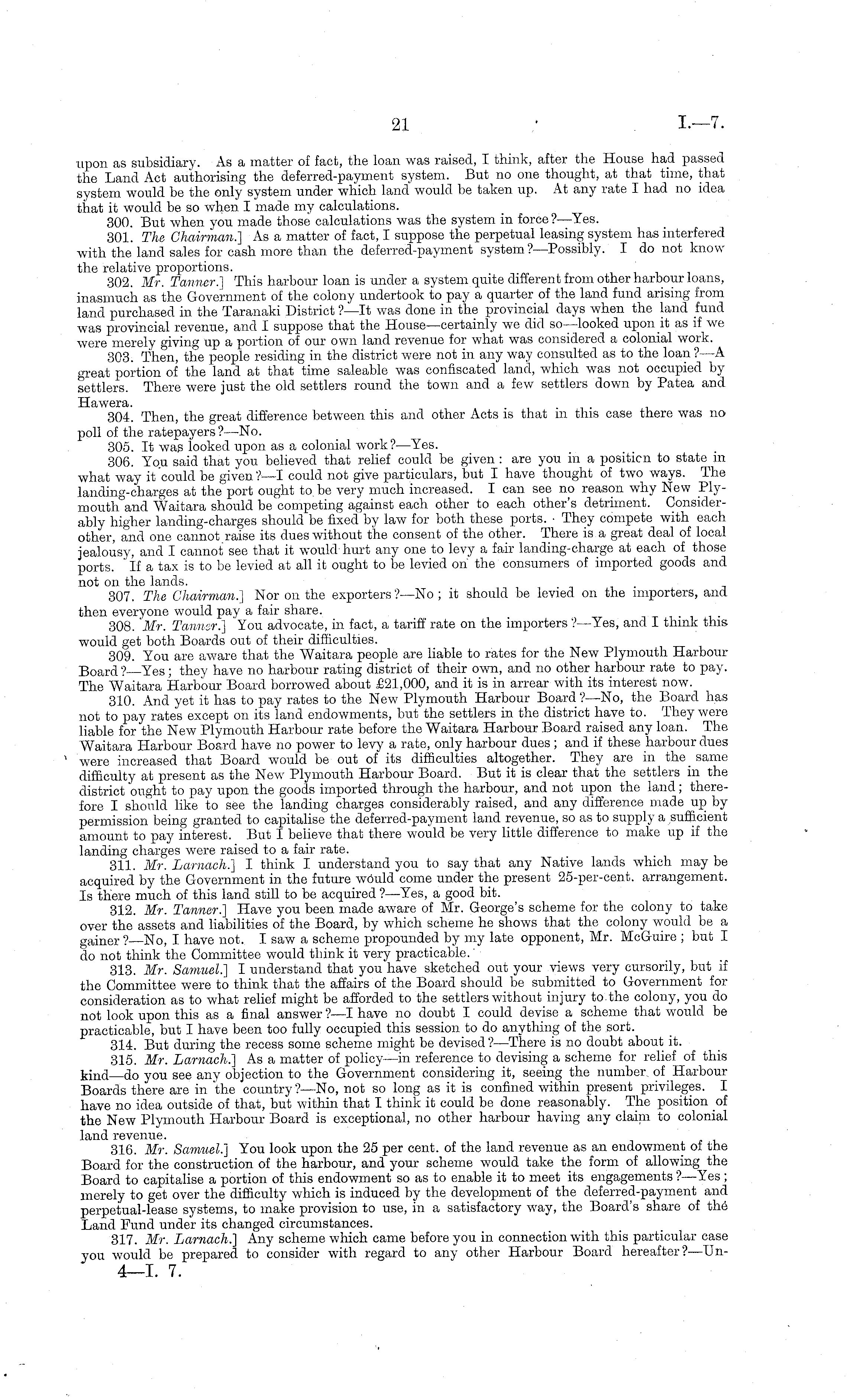 upon as subsidiary. As a matter of fact, the loan was raised, I think, after the House had passed the Land Act authorising the deferred-payment system. But no one thought, at that time, that system would be the only system under which land would be taken up. At any rate I had no idea that it would be so when I made my calculations. 300. But when you made those calculations was the system in force? —Yes. 301. The Chairman.] As a matter of fact, I suppose the perpetual leasing system has interfered with the land sales for cash more than the deferred-payment system ?—Possibly. I do not know the relative proportions. 302. Mr. Tanner.] This harbour loan is under a system quite different from other harbour loans, inasmuch as the Government of the colony undertook to pay a quarter of the land fund arising from land purchased in the Taranaki District ?—lt was done in the provincial days when the land fund was provincial revenue, and I suppose that the House—certainly we did so—looked upon it as if we were merely giving up a portion of our own land revenue for what was considered a colonial work. 303. Then, the people residing in the district were not in any way consulted as to the loan ?—A great portion of the land at that time saleable was confiscated land, which was not occupied bysettlers. There were just the old settlers round the town and a few settlers down by Patea and Hawera. 304. Then, the great difference between this and other Acts is that in this case there was no poll of the ratepayers?— No. 305. It was looked upon as a colonial work? —Yes. 306. You said that you believed that relief could be given : are you in a position to state in what way it could be given ?•—I could not give particulars, but I have thought of two ways. The landing-charges at the port ought to be very much increased. I can see no reason why New Plymouth D and Waitara should be competing against each other to each other's detriment. Considerably higher landing-charges should be fixed by law for both these ports. ■ They compete with each other, and one cannot raise its dues without the consent of the other. There is a great deal of local jealousy, and I cannot see that it would hurt any one to levy a fair landing-charge at each of those ports, "if a tax is to be levied at all it ought to be levied on the consumers of imported goods and not on the lands. 307. The Chairman.] Nor on the exporters ?—No ;it should be levied on the importers, and then everyone would pay a fair share. 308. Mr. Tanner.] 'You advocate, in fact, a tariff rate on the importers ?—Yes, and I think this would get both Boards out of their difficulties. 309. You are aware that the Waitara people are liable to rates for the New Plymouth Harbour Board?— Yes; they have no harbour rating district of their own, and no other harbour rate to pay. The Waitara Harbour Board borrowed about £21,000, and it is in arrear with its interest now. 310. And yet it has to pay rates to the New Plymouth Harbour Board ?—No, the Board has not to pay rates except on its land endowments, but the settlers in the district have to. They were liable for the New Plymouth Harbour rate before the Waitara Harbour Board raised any loan. The Waitara Harbour Board have no power to levy a rate, only harbour dues ; and if these harbour dues were increased that Board would be out of its difficulties altogether. They are in the same difficulty at present as the New Plymouth Harbour Board. But it is clear that the settlers in the district ought to pay upon the goods imported through the harbour, and not upon the land; therefore I should like to see the landing charges considerably raised, and any difference made up by permission being granted to capitalise the deferred-payment land revenue, so as to supply a sufficient amount to pay interest. But I believe that there would be very little difference to make up if the landing charges were raised to a fair rate. 311. Mr. Larnach.] I think I understand you to say that any Native lands which may be acquired by the Government in the future would come under the present 25-per-cent. arrangement. Is there much of this land still to be acquired ? —Yes, a good bit. 312. Mr. Tanner.] Have you been made aware of Mr. George's scheme for the colony to take over the assets and liabilities of the Board, by which scheme he shows that the colony would be a gainer ? No, I have not. I saw a scheme propounded by my late opponent, Mr. McGuire ; but I do not think the Committee would think it very practicable. 313. Mr. Samuel.] I understand that you have sketched out your views very cursorily, but if the Committee were to think that the affairs of the Board should be submitted to Government for consideration as to what relief might be afforded to the settlers without injury to. the colony, you do not look upon this as a final answer ?—I have no doubt I could devise a scheme that would be practicable, but I have been too fully occupied this session to do anything of the sort. 314. But during the recess some scheme might be devised ?—There is no doubt about it. 315. Mr. Larnach.] As a matter of policy—in reference to devising a scheme for relief of this kind do you see any objection to the Government considering it, seeing the number of Harbour Boards there are in the country?—No, not so long as it is confined within present privileges. I have no idea outside of that, but within that I think it could be done reasonably. The position of the New Plymouth Harbour Board is exceptional, no other harbour having any claim to colonial land revenue. 316. Mr. Samuel.] You look upon the 25 per cent, of the land revenue as an endowment of the Board for the construction of the harbour, and your scheme would take the form of allowing the Board to capitalise a portion of this endowment so as to enable it to meet its engagements ? —Yes ; merely to get over the difficulty which is induced by the development of the deferred-payment and p