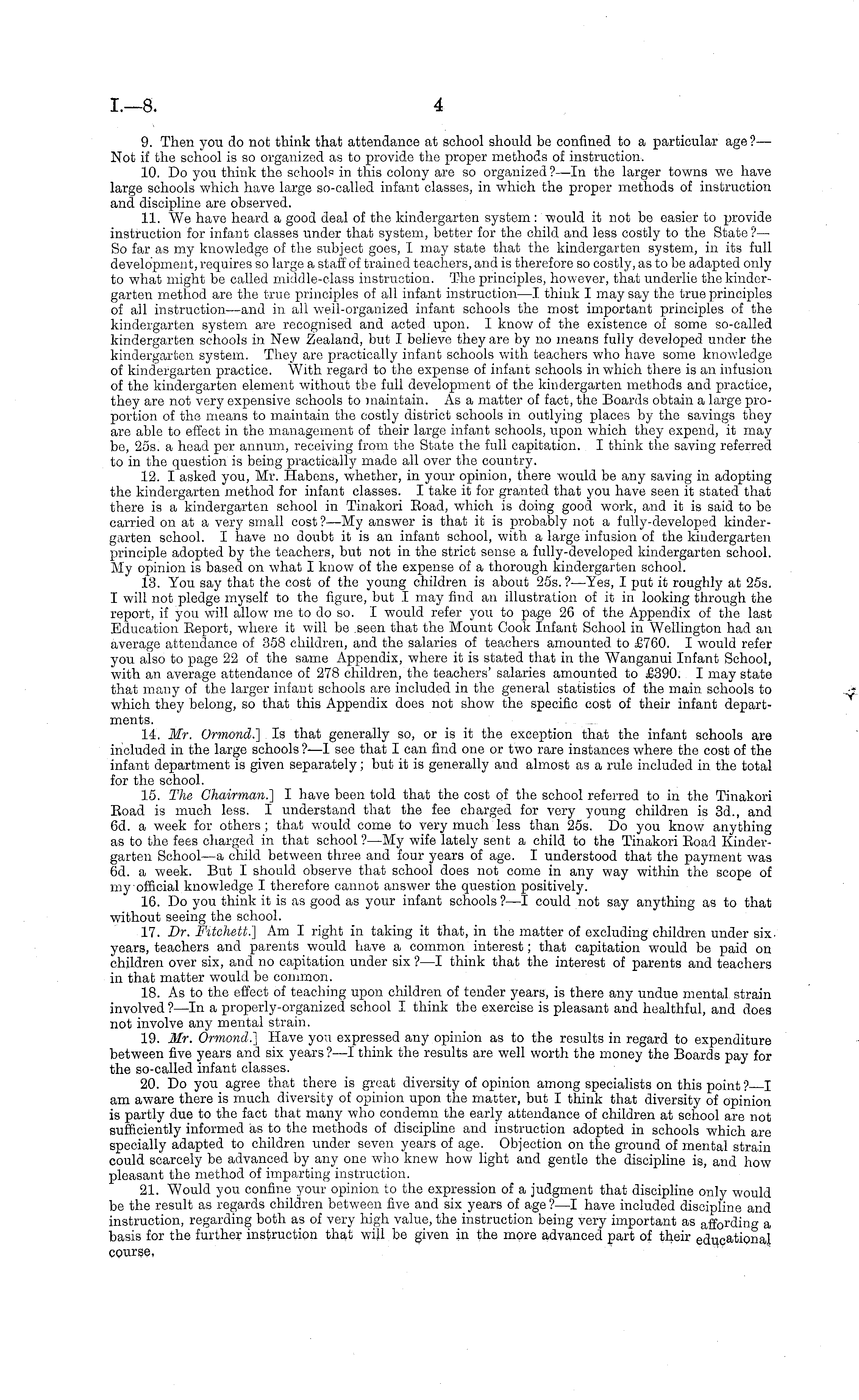 9. Then you do not think that attendance at school should be confined to a particular age?— Not if the school is so organized as to provide the proper methods of instruction. 10. Do you think the schools in this colony are so organized ? —ln the larger towns we have large schools which have large so-called infant classes, in which the proper methods of instruction and discipline are observed. 11. We have heard a good deal of the kindergarten system: would it not be easier to provide instruction for infant classes under that system, better for the child and less costly to the State ?— So far as my knowledge of the subject goes, I may state that the kindergarten system, in its full development, requires so large a staff of trained teachers, and is therefore so costly, as to be adapted only to what might be called middle-class instruction. The principles, however, that underlie the kindergarten method are the true principles of all infant instruction—l think I may say the true principles of all instruction—and in all well-organized infant schools the most important principles of the kindergarten system are recognised and acted upon. I know of the existence of some so-called kindergarten schools in New Zealand, but I believe they are by no means fully developed under the kindergarten system. They are practically infant schools with teachers who have some knowledge of kindergarten practice. With regard to the expense of infant schools in which there is an infusion of the kindergarten element without the full development of the kindergarten methods and practice, they are not very expensive schools to maintain. As a matter of fact, the Boards obtain a large proportion of the means to maintain the costly district schools in outlying places by the savings they are able to effect in the management of their large infant schools, upon which they expend, it may be, 255. a head per annum, receiving from the State the full capitation. I think the saving referred to in the question is being practically made all over the country. 12. I asked you, Mr. Habens, whether, in your opinion, there would be any saving in adopting the kindergarten method for infant classes. I take it for granted that you have seen it stated that there is a kindergarten school in Tinakori Road, which is doing good work, and it is said to be carried on at a very small cost? —My answer is that it is probably not a fully-developed kindergarten school. I have no doubt it is an infant school, with a largo infusion of the kindergarten principle adopted by the teachers, but not in the strict sense a fully-developed kindergarten school. My opinion is based on what I know of the expense of a thorough kindergarten school. 13. You say that the cost of the young children is about 255. ?—Yes, I put it roughly at 255. I will not pledge myself to the figure, but I may find an illustration of it in looking through the report, if you will allow me to do so. I would refer you to page 26 of the Appendix of the last Education Report, where it will be seen that the Mount Cook Infant School in Wellington had an average attendance of 358 children, and the salaries of teachers amounted to £760. I would refer you also to page 22 of the same Appendix, where it is stated that in the Wanganui Infant School, with an average attendance of 278 children, the teachers' salaries amounted to £390. I may state that many of the larger infant schools are included in the general statistics of the main schools to which they belong, so that this Appendix does not show the specific cost of their infant departments. 14. Mr. Ormond.] Is that generally so, or is it the exception that the infant schools are included in the large schools ? —I see that I can find one or two rare instances where the cost of the infant department is given separately; but it is generally and almost as a rule included in the total for the school. 15. The Chairman.] I have been told that the cost of the school referred to in the Tinakori Road is much less. I understand that the fee charged for very young children is 3d., and 6d. a week for others ; that would come to very much less than 255. Do you know anything as to the fees charged in that school ?—My wife lately sent a child to the Tinakori Road Kindergarten School —a child between three and four years of age. I understood that the payment was 6d. a week. But I should observe that school does not come in any way within the scope of my official knowledge I therefore cannot answer the question positively. 16. Do you think it is as good as your infant schools ? —I could not say anything as to that without seeing the school. 17. Dr. Fitchett.] Am I right in taking it that, in the matter of excluding children under six years, teachers and parents would have a common interest; that capitation would be paid on children over six, and no capitation under six ?—I think that the interest of parents and teachers in that matter would be common. 18. As to the effect of teaching upon children of tender years, is there any undue mental strain involved ?—ln a properly-organized school I think the exercise is pleasant and healthful, and does not involve any mental strain. 19. Mr. Ormond.] Have you expressed any opinion as to the results in regard to expenditure between five years and six years ? —I think the results are well worth the money the Boards pay for the so-called infant classes. 20. Do you agree that there is great diversity of opinion among specialists on this point ? I am aware there is much diversity of opinion upon the matter, but I think that diversity of opinion is partly due to the fact that many who condemn the early attendance of children at school are not sufficiently informed as to the methods of discipline and instruction adopted in schools which are specially adapted to children under seven years of age. Objection on the ground of mental strain could scarcely be advanced by any one who knew how light and gentle 