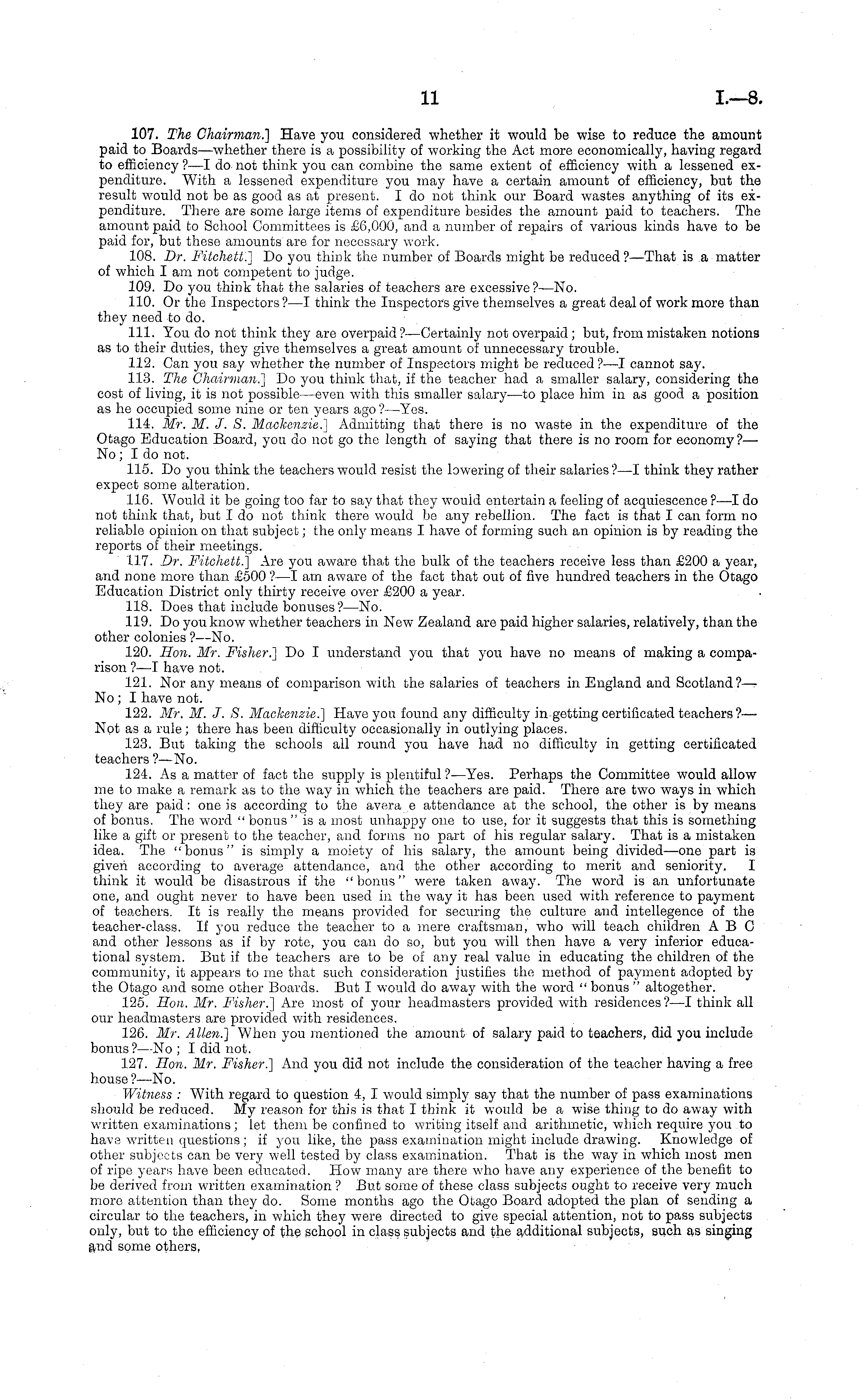 107. The Chairman.] Have you considered whether it would be wise to reduce the amount paid to Boards—whether there is a possibility of working the Act more economically, having regard to efficiency ?—I do not think you can combine the same extent of efficiency with a lessened expenditure. With a lessened expenditure you may have a certain amount of efficiency, but the result would not be as good as at present. I do not think our Board wastes anything of its expenditure. There are some large items of expenditure besides the amount paid to teachers. The amount paid to School Committees is £6,000, and a number of repairs of various kinds have to be paid for, but these amounts are for necessary work. 108. Dr. Fitchett.] Do you think the number of Boards might be reduced?— That is a matter of which I am not competent to judge. 109. Do you think that the salaries of teachers are excessive?— No. 110. Or the Inspectors ?—I think the Inspectors give themselves a great deal of work more than they need to do. 111. You do not think they are overpaid?— Certainly not overpaid; but, from mistaken notions as to their duties, they give themselves a great amount of unnecessary trouble. 112. Can you say whether the number of Inspectors might be reduced? —I cannot say. 113. The Chairman] Do you think that, if the teacher had a smaller salary, considering the cost of living, it is not possible—even with this smaller salary—to place him in as good a position as he occupied some nine or ten years ago?— Yes. 114. Mr. M. J. S. Mackenzie.] Admitting that there is no waste in the expenditure of the Otago Education Board, you do not go the length of saying that there is no room for economy ? — No; Ido not. 115. Do you think the teachers would resist the lowering of their salaries?—l think they rather expect some alteration. 116. Would it be going too far to say that they would entertain a feeling of acquiescence ?—I do not think that, but Ido not think there would be any rebellion. The fact is that I can form no reliable opinion on that subject; the only means I have of forming such an opinion is by reading the reports of their meetings. 117. Dr. Fitchett.] Are you aware that the bulk of the teachers receive less than £200 a year, and none more than £500 ?—I am aware of the fact that out of five hundred teachers in the Otago Education District only thirty receive over £200 a year. 118. Does that include bonuses ?—No. 119. Do you know whether teachers in New Zealand are paid higher salaries, relatively, than the other colonies ? —No. 120. Hon. Mr. Fisher.] Do I understand you that you have no means of making a comparison ? —I have not. 121. Nor any means of comparison with the salaries of teachers in England and Scotland?—No ; I have not. 122. Mr. M. J. S. Mackenzie.] Have you found any difficulty in getting certificated teachers ?— Not as a rule; there has been difficulty occasionally in outlying places. 123. But taking the schools all round you have had no difficulty in getting certificated teachers ?—No. 124. As a matter of fact the supply is plentiful ?—Yes. Perhaps the Committee would allow me to make a remark as to the way in which the teachers are paid. There are two ways in which they are paid: one is according to the avera c attendance at the school, the other is by means of bonus. The word " bonus "is a most unhappy one to use, for it suggests that this is something like a gift or present to the teacher, and forms no part of his regular salary. That is a mistaken idea. The "bonus" is simply a moiety of his salary, the amount being divided —one part is given according to average attendance, and the other according to merit and seniority. I think it would be disastrous if the "bonus" were taken away. The word is an unfortunate one, and ought never to have been used in the way it has been used with reference to payment of teachers. It is really the means provided for securing the culture and intellegence of the teacher-class. If you reduce the teacher to a mere craftsman, who will teach children ABC and other lessons as if by rote, you can do so, but you will then have a very inferior educational system. But if the teachers are to be of any real value in educating the children of the community, it appears to me that such consideration justifies the method of payment adopted by the Otago and some other Boards. But I would do away with the word " bonus " altogether. 125. Hon. Mr. Fisher.] Are most of your headmasters provided with residences? —I think all our headmasters are provided with residences. 126. Mr. Allen.] When you mentioned the amount of salary paid to teachers, did you include bonus ?—No ; I did not. 127. Hon. Mr. Fisher] And you did not include the consideration of the teacher having a free house ?—No. Witness : With regard to question 4, I would simply say that the number of pass examinations should be reduced. My reason for this is that I think it would be a wise thing to do away with written examinations ; let them be confined to writing itself and arithmetic, which require you to have written questions ;if you like, the piass examination might include drawing. Knowledge of other subjects can be very well tested by class examination. That is the way in which most men of ripe years have been educated. How many are there who have any experience of the benefit to be derived from written examination ? But some of these class subjects ought to receive very much more attention than they do. Some months ago the Otago Board adopted the plan of sending a circular to the teachers, in which they were directed to give special attention, not to pass subjects only, but to the efficiency of the school in class subjects and the additional subjects, such as singing and some others,