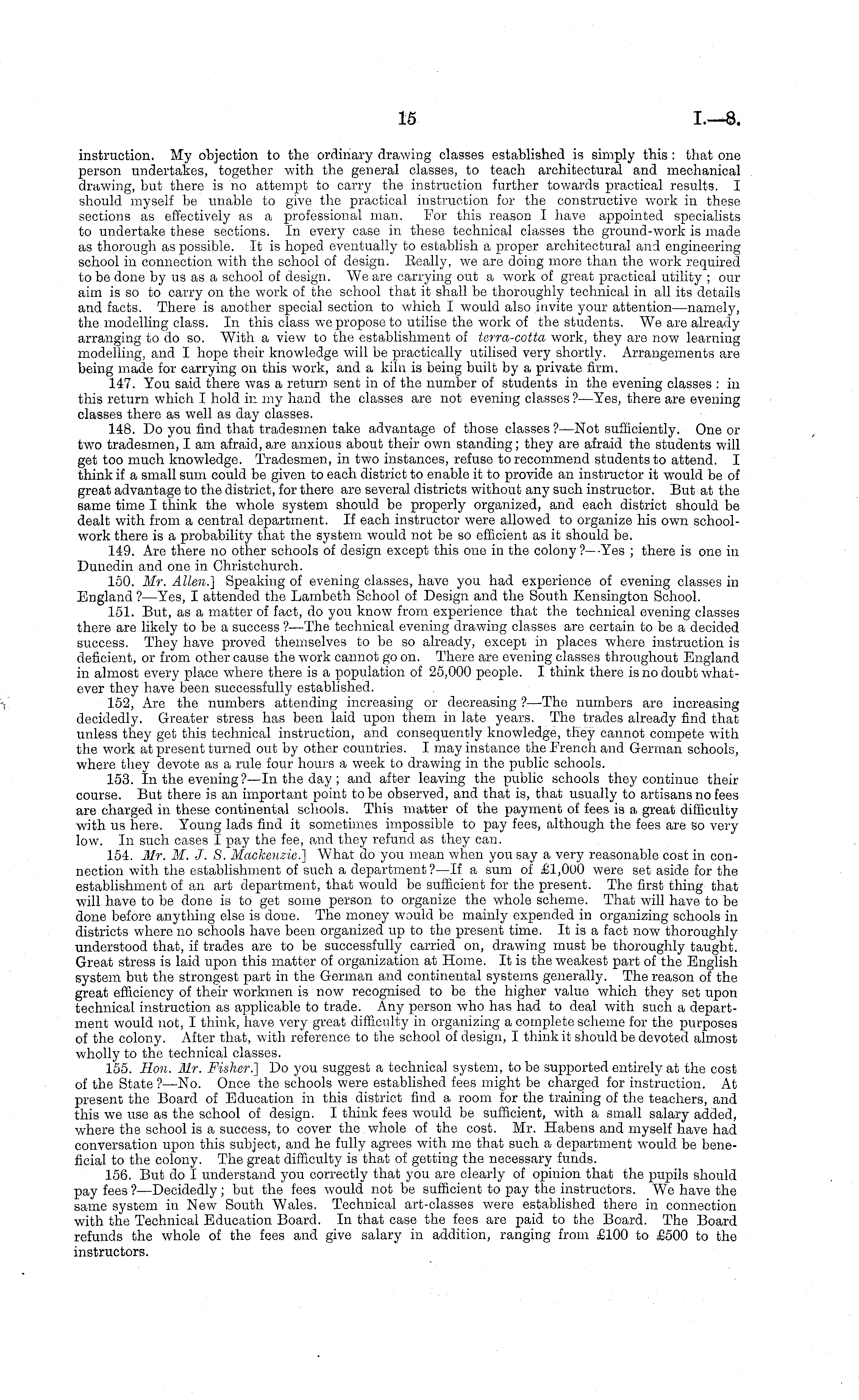 instruction. My objection to the ordinary drawing classes established is simply this : that one person undertakes, together with the general classes, to teach architectural and mechanical drawing, but there is no attempt to carry the instruction further towards practical results. I should myself be unable to give the practical instruction for the constructive work in these sections as effectively as a professional man. For this reason I have appointed specialists to undertake these sections. In every case in these technical classes the ground-work is made as thorough as possible. It is hoped eventually to establish a proper architectural and engineering school in connection with the school of design. Really, we are doing more than the work required to be done by us as a school of design. We are carrying out a work of great practical utility ; our aim is so to carry on the work of the school that it shall be thoroughly technical in all its details and facts. There is another special section to which I would also invite your attention—namely, the modelling class. In this class we propose to utilise the work of the students. We are already arranging to do so. With a view to the establishment of terra-cotta work, they are now learning modelling, and I hope their knowledge will be practically utilised very shortly. Arrangements are being made for carrying on this work, and a kiln is being built by a private firm. 147. You said there was a return sent in of the number of students in the evening classes : in this return which I hold in my hand the classes are not evening classes?— Yes, there are evening classes there as well as day classes. 148. Do you find that tradesmen take advantage of those classes ?—Not sufficiently. One or two tradesmen, lam afraid, are anxious about their own standing; they are afraid the students will get too much knowledge. Tradesmen, in two instances, refuse to recommend students to attend. I think if a small sum could be given to each district to enable it to provide an instructor it would be of great advantage to the district, for there are several districts without any such instructor. But at the same time I think the whole system should be properly organized, and each district should be dealt with from a central department. If each instructor were allowed to organize his own schoolwork there is a probability that the system would not be so efficient as it should be. 149. Are there no other schools of design except this one in the colony ?— Yes ; there is one in Dunedin and one in Christchurch. 150. Mr. Allen] Speaking of evening classes, have you had experience of evening classes in England ?—Yes, I attended the Lambeth School of Design and the South Kensington School. 151. But, as a matter of fact, do you know from experience that the technical evening classes there are likely to be a success ?—The technical evening drawing classes are certain to be a decided success. They have proved themselves to be so already, except in places where instruction is deficient, or from other cause the work cannot go on. There are evening classes throughout England in almost every place where there is a population of 25,000 people. I think there is no doubt whatever they have been successfully established. 152. Are the numbers attending increasing or decreasing ?—The numbers are increasing decidedly. Greater stress has been laid upon them in late years. The trades already find that unless they get this technical instruction, and consequently knowledge, they cannot compete with the work at present turned out by other countries. I may instance the French and German schools, where they devote as a rule four hours a week to drawing in the public schools. 153. In the evening ? —ln the day ; and after leaving the public schools they continue their course. But there is an important point to be observed, and that is, that usually to artisans no fees are charged in these continental schools. This matter of the payment of fees is a great difficulty with us here. Young lads find it sometimes impossible to pay fees, although the fees are so very low. In such cases I pay the fee, and they refund as they can. 154. Mr. M. J. S. Mackenzie] What do you mean when you say a very reasonable cost in connection with the establishment of such a department ?—lf a sum of £1,000 were set aside for the establishment of an art department, that would be sufficient for the present. The first thing that will have to be done is to get some person to organize the whole scheme. That will have to be done before anything else is done. The money would be mainly expended in organizing schools in districts where no schools have been organized up to the present time. It is a fact now thoroughly understood that, if trades are to be successfully carried on, drawing must be thoroughly taught. Great stress is laid upon this matter of organization at Home. It is the weakest part of the English system but the strongest part in the German and continental systems generally. The reason of the great efficiency of their workmen is now recognised to be the higher value which they set upon technical instruction as applicable to trade. Any person who has had to deal with such a department would not, I think, have very great difficulty in organizing a complete scheme for the purposes of the colony. After that, with reference to the school of design, I think it should be devoted almost wholly to the technical classes. 155. Hon. Mr. Fisher] Do you suggest a technical system, to be supported entirely at the cost of the State? —No. Once the schools were established fees might be charged for instruction. At present the Board of Education in this district find a room for the training of the teachers, and this we use as the school of design. I think fees would be sufficient, with a small salary added, where the school is a success, to cover the whole of the cost. Mr. Habens and myself have had conversation upon this sub