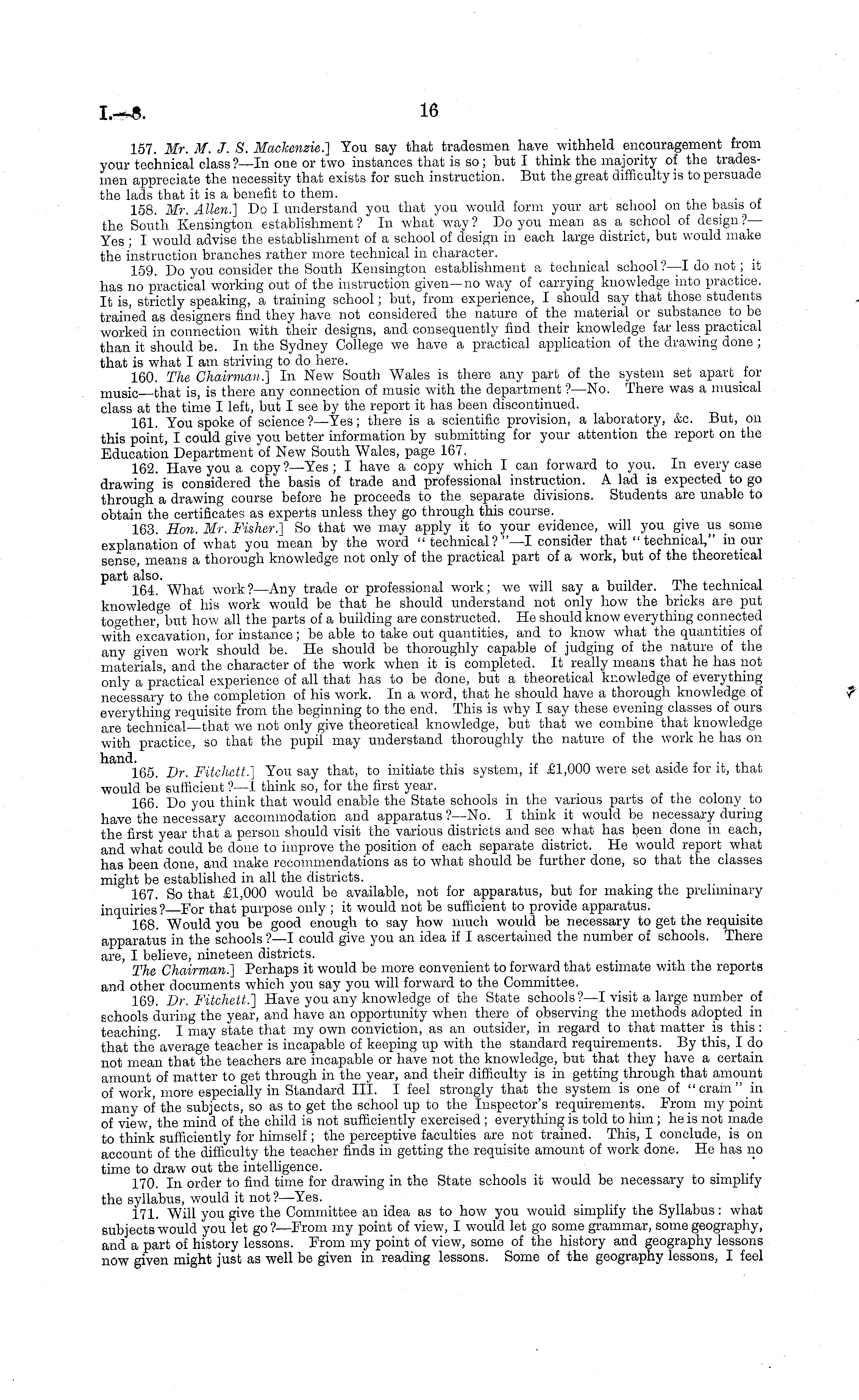 157. Mr. M. J. S. Mackenzie.] You say that tradesmen have withheld encouragement from your technical class? —In one or two instances that is so; but I think the majority of the tradesmen appreciate the necessity that exists for such instruction. But the great difficulty is to persuade the lads that it is a benefit to them. . 158. Mr. Allen.] Do I understand you that you would form your art school on the basis ot the South Kensington establishment ? In what way ? Do you mean as a school of design ?— Yes ; I would advise the establishment of a school of design in each large district, but would make the instruction branches rather more technical in character. 159. Do you consider the South Kensington establishment a technical school?-—! do not ; it has no practical working out of the instruction given—no way of carrying knowledge into practice. It is, strictly speaking, a training school; but, from experience, I should say that those students trained as designers find they have not considered the nature of the material or substance to be worked in connection with their designs, and consequently find their knowledge far less practical than it should be. In the Sydney College we have a practical application of the drawing done ; that is what I am striving to do here. 160. The Chairman.] In New South Wales is there any part of the system set apart for mus i c that is, is there any connection of music with the department ?—No. There was a musical class at the time I left, but I see by the report it has been discontinued. 161. You spoke of science? —Yes; there is a scientific provision, a laboratory, &c. But, on this point, I could give you better information by submitting for your attention the report on the Education Department of New South Wales, page 167. 162. Have you a copy? —Yes; I have a copy which I can forward to you. In every case drawing is considered the basis of trade and professional instruction. A lad is expected to go through a drawing course before he proceeds to the separate divisions. Students are unable to obtain the certificates as experts unless they go through this course. 163. Hon. Mr. Fisher.] So that we may apply it to your evidence, will you give us some explanation of what you mean by the word " technical? "—I consider that "technical," in our sense, means a thorough knowledge not only of the practical part of a work, but of the theoretical 164. What work?— Any trade or professional work; we will say a builder. The technical knowledge of his work would be that he should understand not only how the bricks are put together, but how all the parts of a building are constructed. He should know everything connected with excavation, for instance; be able to take out quantities, and to know what the quantities of any given work should be. He should be thoroughly capable of judging of the nature of the materials, and the character of the work when it is completed. It really means that he has not only a practical experience of all that has to be done, but a theoretical knowledge of everything necessary to the completion of his work. In a word, that he should have a thorough knowledge of everything requisite from the beginning to the end. This is why I say these evening classes of ours are technical that we not only give theoretical knowledge, but that we combine that knowledge with practice, so that the pupil may understand thoroughly the nature of the work he has on 165. Dr. Fitchett.] You say that, to initiate this system, if £1,000 were set aside for it, that would be sufficient ?—1 think so, for the first year. 166. Do you think that would enable the State schools in the various parts of the colony to have the necessary accommodation and apparatus? —No. I think it would be necessary during the first year that a person should visit the various districts and see what has been done in each, and what could be done to improve the position of each separate district. He would report what has been done, and make recommendations as to what should be further done, so that the classes might be established in all the districts. 167. So that £1,000 would be available, not for apparatus, but for making the preliminary inquiries ? For that purpose only ; it would not be sufficient to provide apparatus. 168. Would you be good enough to say how much would be necessary to get the requisite apparatus in the schools ? —I could give you an idea if I ascertained the number of schools. There are, I believe, nineteen districts. The Chairman.] Perhaps it would be more convenient to forward that estimate with the reports and other documents which you say you will forward to the Committee. 169. Dr. Fitchett.] Have you any knowledge of the State schools ?—I visit a large number of schools during the year, and have an opportunity when there of observing the methods adopted in teaching. I may state that my own conviction, as an outsider, in regard to that matter is this : that the average teacher is incapable of keeping up with the standard requirements. By this, Ido not mean that the teachers are incapable or have not the knowledge, but that they have a certain amount of matter to get through in the year, and their difficulty is in getting through that amount of work, more especially in Standard 111. I feel strongly that the system is one of "cram" in many of the subjects, so as to get the school up to the Inspector's requirements. From my point of view, the mind of the child is not sufficiently exercised; everything is told to him ; he is not made to think sufficiently for himself; the perceptive faculties are not trained. This, I conclude, is on account of the difficulty the teacher finds in getting the requisite amount of work done. He has no time to draw out the intelligence. 170. In order to find time for drawing in the State schools it would be necessary to simplify the syllabus, would it not ?—Yes. 171. Will you give the Committee an idea as to how you would simpli