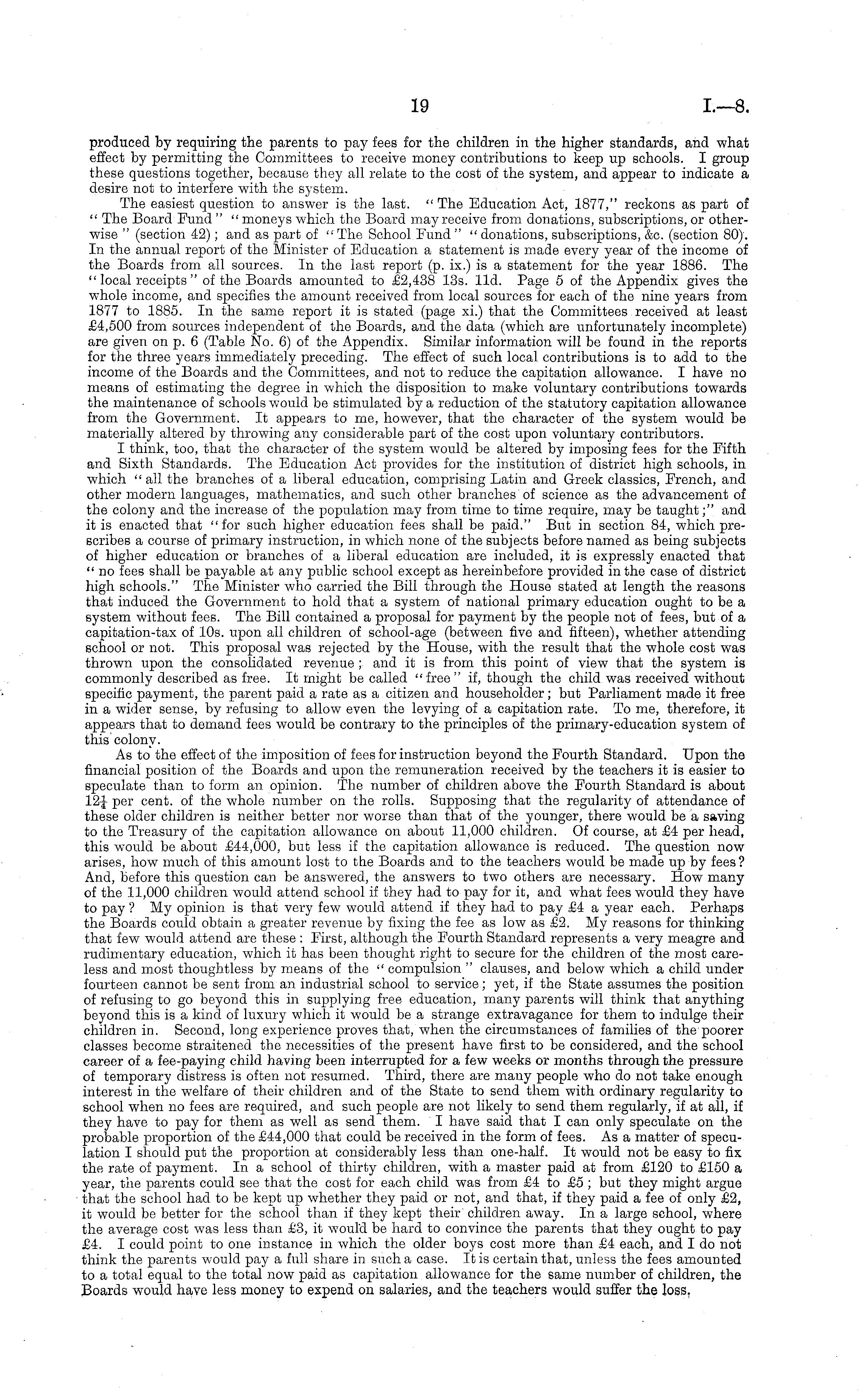 produced by requiring the parents to pay fees for the children in the higher standards, and what effect by permitting the Committees to receive money contributions to keep up schools. I group these questions together, because they all relate to the cost of the system, and appear to indicate a desire not to interfere with the system. The easiest question to answer is the last. " The Education Act, 1877," reckons as part of " The Board Fund " " moneys which the Board may receive from donations, subscriptions, or otherwise " (section 42); and as part of " The School Fund " " donations, subscriptions, &c. (section 80). In the annual report of the Minister of Education a statement is made every year of the income of the Boards from all sources. In the last report (p. ix.) is a statement for the year 1886. The " local receipts "of the Boards amounted to £2,438 13s. lid. Page 5 of the Appendix gives the whole income, and specifies the amount received from local sources for each of the nine years from 1877 to 1885. In the same report it is stated (page xi.) that the Committees received at least £4,500 from sources independent of the Boards, and the data (which are unfortunately incomplete) are given on p. 6 (Table No. 6) of the Appendix. Similar information will be found in the reports for the three years immediately preceding. The effect of such local contributions is to add to the income of the Boards and the Committees, and not to reduce the capitation allowance. I have no means of estimating the degree in which the disposition to make voluntary contributions towards the maintenance of schools would be stimulated by a reduction of the statutory capitation allowance from the Government. It appears to me, however, that the character of the system would be materially altered by throwing any considerable part of the cost upon voluntary contributors. I think, too, that the character of the system would be altered by imposing fees for the Fifth and Sixth Standards. The Education Act provides for the institution of district high schools, in which " all the branches of a liberal education, comprising Latin and Greek classics, French, and other modern languages, mathematics, and such other branches of science as the advancement of the colony and the increase of the population may from time to time require, may be taught;" and it is enacted that "for such higher education fees shall be paid." But in section 84, which prescribes a course of primary instruction, in which none of the subjects before named as being subjects of higher education or branches of a liberal education are included, it is expressly enacted that " no fees shall be payable at any public school except as hereinbefore provided in the case of district high schools." The Minister who carried the Bill through the House stated at length the reasons that induced the Government to hold that a system of national primary education ought to be a system without fees. The Bill contained a proposal for payment by the people not of fees, but of a capitation-tax of 10s. upon all children of school-age (between five and fifteen), whether attending school or not. This proposal was rejected by the House, with the result that the whole cost was thrown upon the consolidated revenue ; and it is from this point of view that the system is commonly described as free. It might be called "free" if, though the child was received without specific payment, the parent paid a rate as a citizen and householder; but Parliament made it free in a wider sense, by refusing to allow even the levying of a capitation rate. To me, therefore, it appears that to demand fees would be contrary to the principles of the primary-education system of this colony. As to the effect of the imposition of fees for instruction beyond the Fourth Standard. Upon the financial position of the Boards and upon the remuneration received by the teachers it is easier to speculate than to form an opinion. The number of children above the Fourth Standard is about 12-j- per cent, of the whole number on the rolls. Supposing that the regularity of attendance of these older children is neither better nor worse than that of the younger, there would be a saving to the Treasury of the capitation allowance on about 11,000 children. Of course, at £4 per head, this would be about £44,000, but less if the capitation allowance is reduced. The question now arises, how much of this amount lost to the Boards and to the teachers would be made up by fees ? And, before this question can be answered, the answers to two others are necessary. How many of the 11,000 children would attend school if they had to pay for it, and what fees would they have to pay ? My opinion is that very few would attend if they had to pay £4 a year each. Perhaps the Boards could obtain a greater revenue by fixing the fee as low as £2. My reasons for thinking that few would attend are these : First, although the Fourth Standard represents a very meagre and rudimentary education, which it has been thought right to secure for the children of the most careless and most thoughtless by means of the " compulsion " clauses, and below which a child under fourteen cannot be sent from an industrial school to service; yet, if the State assumes the position of refusing to go beyond this in supplying free education, many parents will think that anything beyond this is a kind of luxury which it would be a strange extravagance for them to indulge their children in. Second, long experience proves that, when the circumstances of families of the poorer classes become straitened the necessities of the present have first to be considered, and the school career of a fee-paying child having been interrupted for a few weeks or months through the pressure of temporary distress is often not resumed. Third, there are many people who do not take enough interest in the welfare of their children and of the State to send them with ordinary regularity to school when 