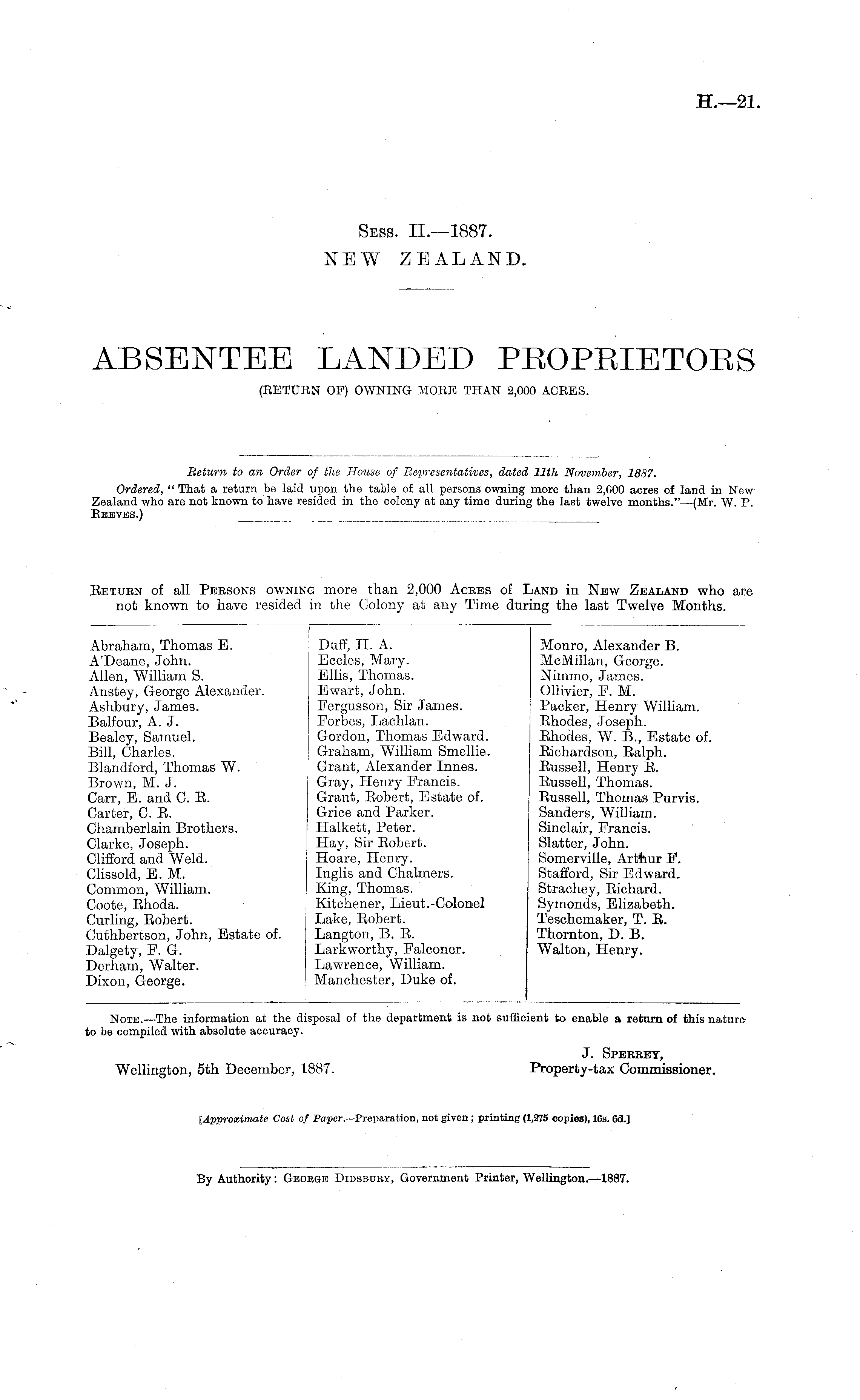Return to an Order of the House of Representatives, dated 11th November, 1887. Ordered, " That a return be laid upon the table of all persons owning more than 2,000 acres of land in New Zealand who are not known to have resided in the colony at any time during the last twelve months."—(Mr. W. P. Reeves.)