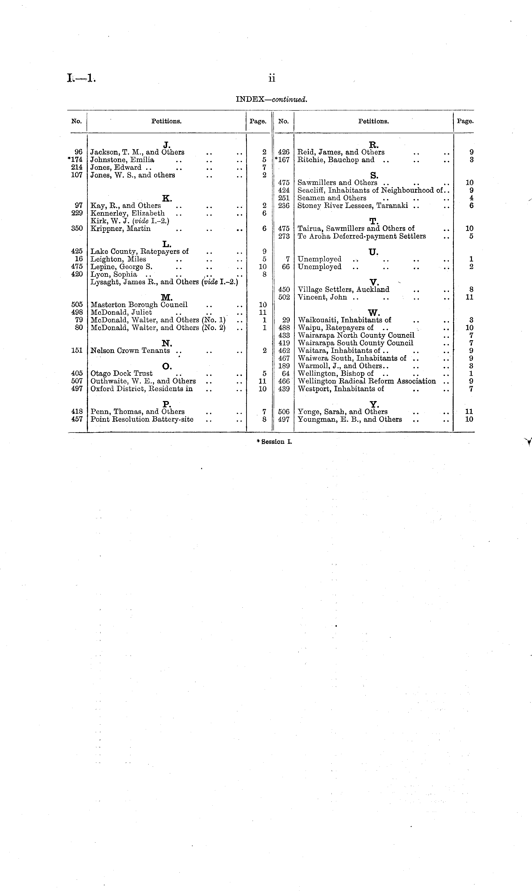 No. Petitions. Page. No. Petitions. Page. 96 '174 214 107 J. Jackson, T. M., and Others Johnstone, Emilia Jones, Edward Jones, W. S., and others 2 5 7 2 426 *167 R. Reid, James, and Others Ritchie, Bauchop and 9 3 K. Kay, E., and Others Kennerley, Elizabeth Kirk, W. J. (vide I.-2.) Krippner, Martin 475 424 251 236 s. Sawmillers and Others Seaclifi, Inhabitants of Neighbourhood of.. Seamen and Others Stoney River Lessees, Taranaki .. 10 9 i 6 97 229 2 6 350 6 475 273 T. Tairua, Sawmillers and Others of Te Aroha Deferred-payment Settlers 10 5 425 16 475 420 L. Lake County, Ratepayers of Leighton, Miles Lepine, George S. Lyon, Sophia .. .. ( .. Lysaght, James R., and Others (vide I.-2.) 9 5 10 8 7 66 u. Unemployed Unemployed 1 2 450 502 V. Village Settlers, Auckland .. Vincent, John .. 8 11 505 498 79 80 M. Masterton Borough Council McDonald, Juliet McDonald, Walter, and Others (No. 1) .. McDonald, Walter, and Others (No. 2) .. 10 11 1 1 29 488 433 419 462 467 189 64 466 439 w. Waikouaiti, Inhabitants of Waipu, Ratepayers of Wairarapa North County Council Wairarapa South County Council Waitara, Inhabitants of .. Waiwera South, Inhabitants of .. Warmoll, J., and Others.. Wellington, Bishop of Wellington Radical Reform Association .. Westport, Inhabitants of 151 N. Nelson Crown Tenants .. 2 3 10 7 7 9 9 3 1 9 7 405 507 497 o. Otago Dock Trust Outhwaite, W. E., and Others Oxford District, Residents in 5 11 10 418 457 P. Penn, Thomas, and Others Point Resolution Battery-site 7 3 506 497 Y. Yonge, Sarah, and Others Youngman, E. B., and Others 11 10 iesi don I.