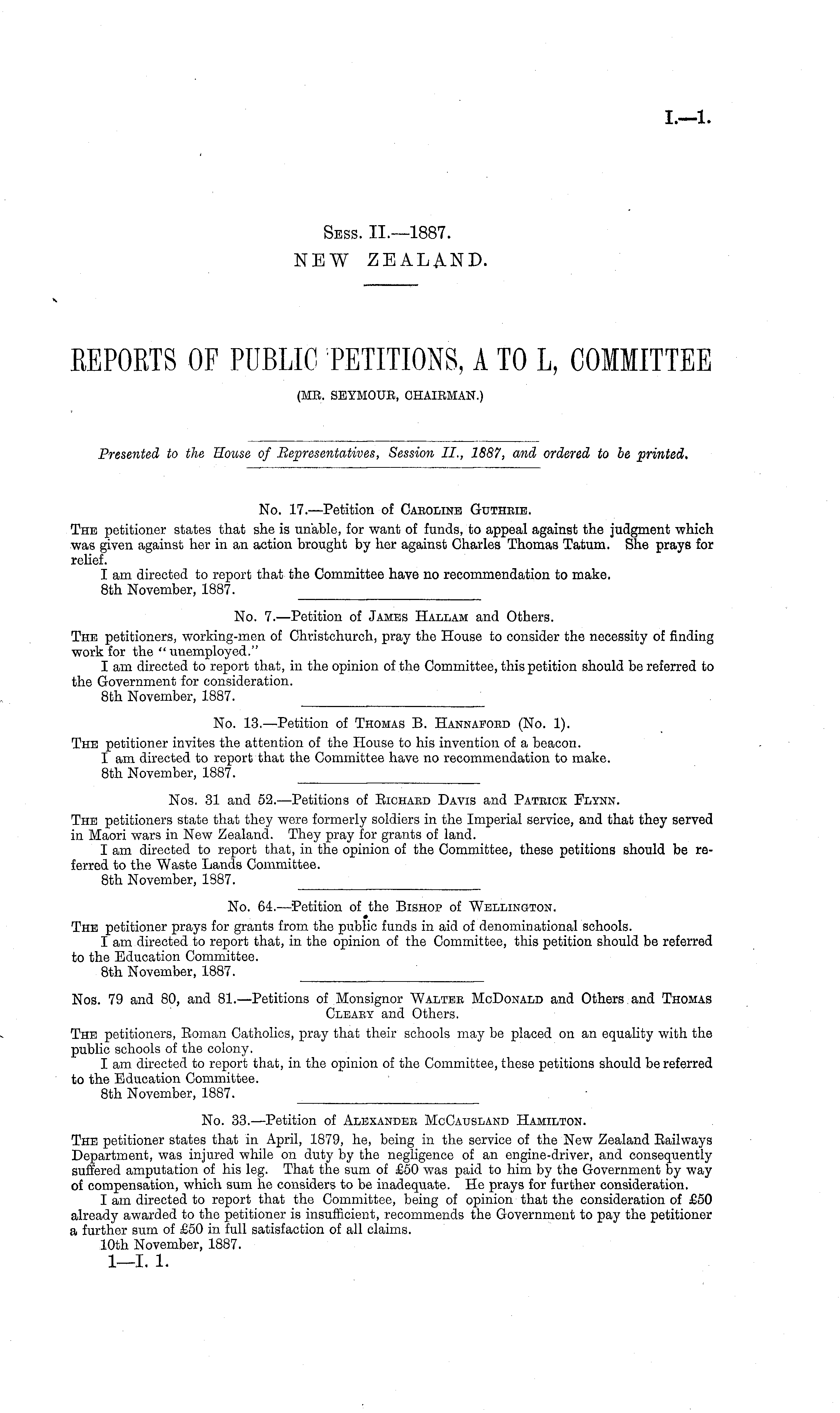 No. 7. —Petition of James Hallam and Others. The petitioners, working-men of Christchurch, pray the House to consider the necessity of finding work for the " unemployed." I am directed to report that, in the opinion of the Committee, this petition should be referred to the Government for consideration. Bth November, 1887.