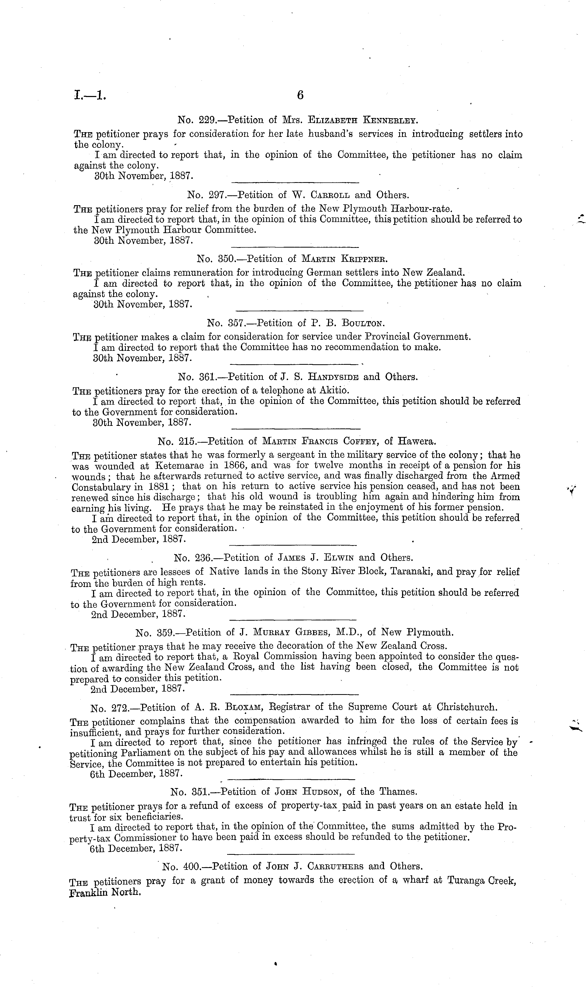 No. 297. —Petition of W. Caeeoll and Others. The petitioners pray for relief from the burden of the New Plymouth Harbour-rate. I am directed to report that, in the opinion of this Committee, this petition should be referred to the New Plymouth Harbour Committee. 30th November, 1887.