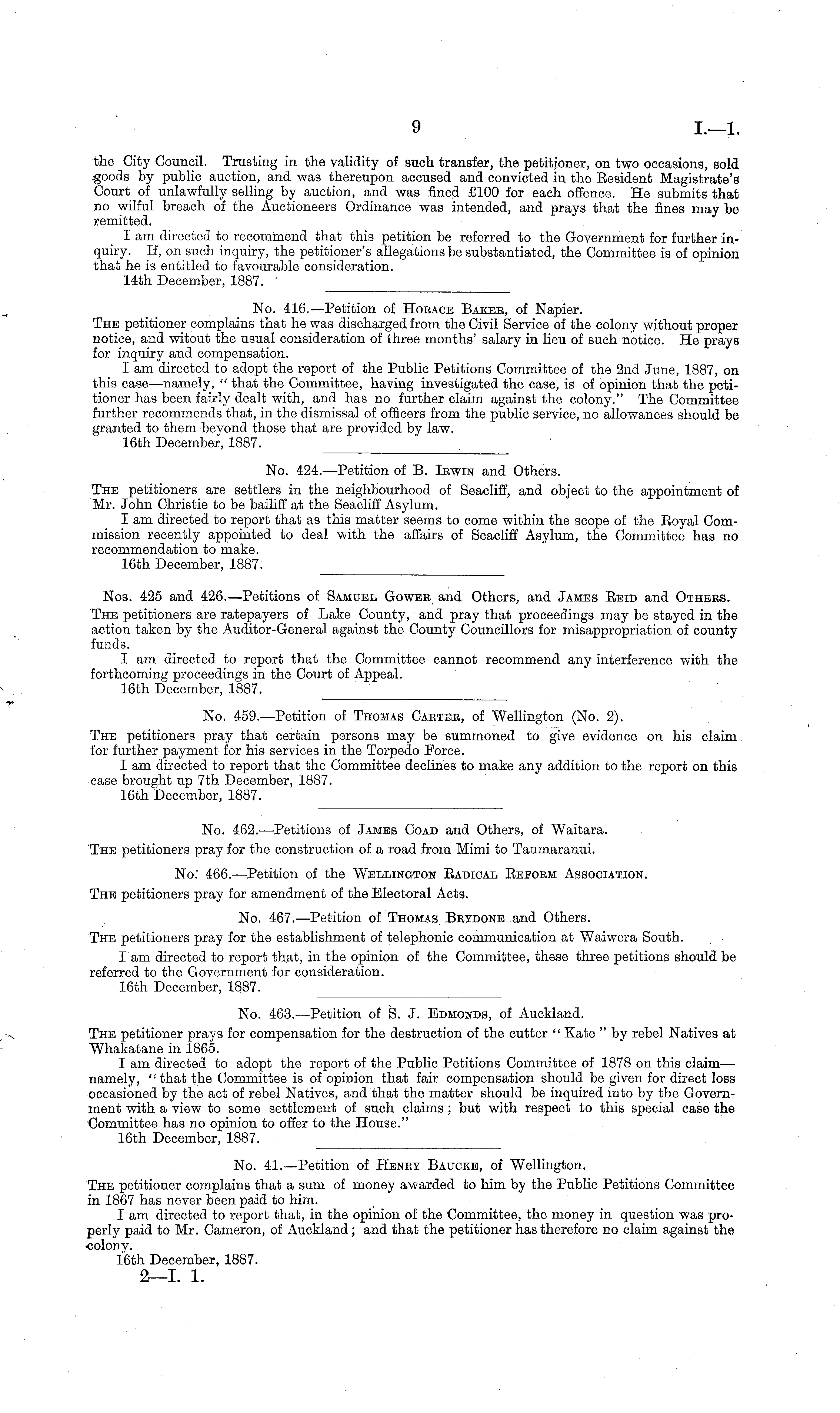 No. 416.—Petition of Hobace Bakbb, of Napier. The petitioner complains that he was discharged from the Civil Service of the colony without proper notice, and witout the usual consideration of three months' salary in lieu of such notice. He prays for inquiry and compensation. I am directed to adopt the report of the Public Petitions Committee of the 2nd June, 1887, on this case —namely, " that the Committee, having investigated the case, is of opinion that the petitioner has been fairly dealt with, and has no further claim against the colony." The Committee further recommends that, in the dismissal of officers from the public service, no allowances should be granted to them beyond those that are provided by law. 16th December, 1887.