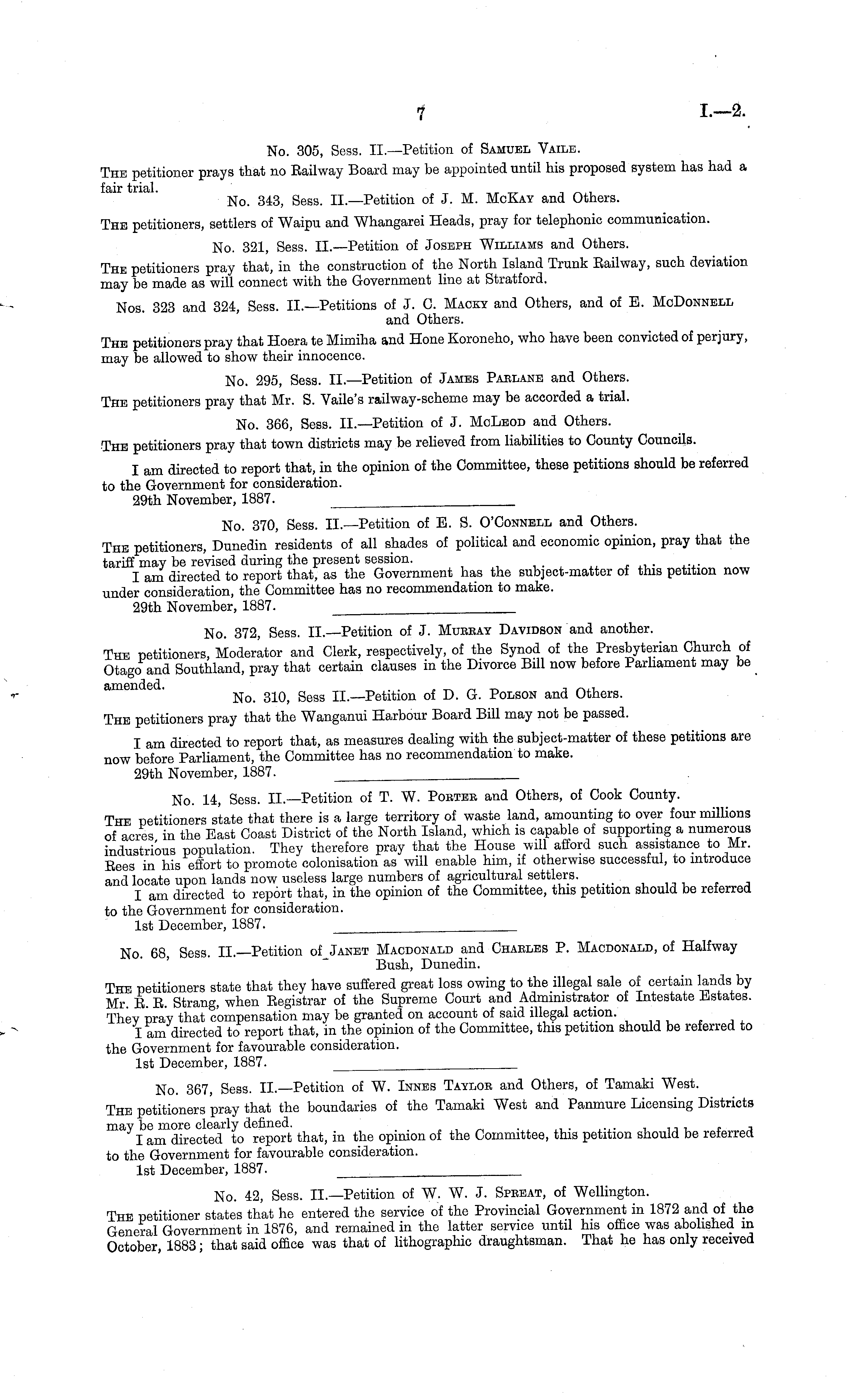 No. 370, Sess. ll.—Petition of E. S. O'Connell and Others. The petitioners, Dunedin residents of all shades of political and economic opinion, pray that the tariff may be revised during the present session. I am directed to report that, as the Government has the subject-matter of this petition now under consideration, the Committee has no recommendation to make. 29th November, 1887.
