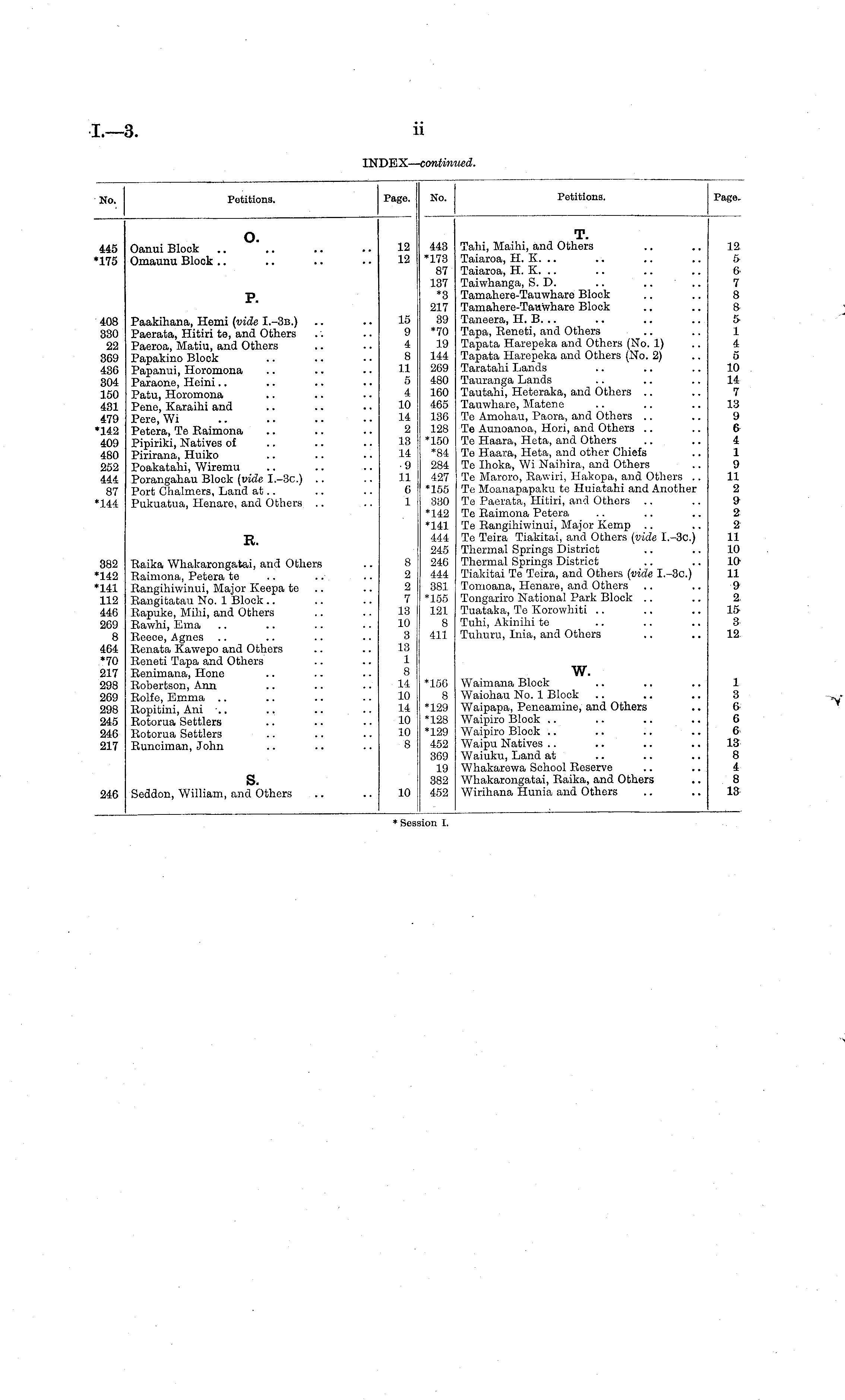 No. Petitions. Page. No. Petitions. Page. 408 330 22 369 436 304 150 431 479 •142 409 480 252 444 87 ♦144 445 175 o. Oanui Block Omaunu Block .. P. Paakihana, Hemi (vide I.-Sb.) Paerata, Hitiri te, and Others Paeroa, Matiu, and Others Papakino Block Papanui, Horomona Paraone, Heini Patu, Horomona Pene, Karaihi and Pere.Wi Petera, Te Baimona Pipiriki, Natives of Pirirana, Huiko Poakatahi, Wiremu Porangahau Block (vide I.-3c.) .. Port Chalmers, Land at.. Pukuatua, Henare, and Others .. 12 12 15 9 4 8 11 5 4 10 14 2 13 1.4 •9 11 6 1 443 •173 87 137 *3 217 39 *70 19 144 269 480 160 465 136 128 •150 •84 284 427 •155 330 •142 •141 444 245 246 444 381 •155 121 8 411 T. Tahi, Maihi, and Others Taiaroa, H. K. .. Taiaroa, H. K. .. Taiwhanga, S. D. Tamahere-Tauwhare Block Tamahere-Tauwhare Block Taneera, H. B. .. Tapa, Beneti, and Others Tapata Harepeka and Others (No. 1) Tapata Harepeka and Others (No. 2) Taratahi Lands Tauranga Lands Tautahi, Heteraka, and Others Tauwhare, Matene Te Amohau, Paora, and Others Te Aunoanoa, Hori, and Others Te Haara, Heta, and Others Te Haara, Heta, and other Chiefs Te Ihoka, Wi Naihira, and Others Te Maroro, Bawiri, Hakopa, and Others .. Te Moanapapaku te Huiatahi and Another Te Paerata, Hitiri, and Others Te Baimona Petera Te Bangihiwinui, Major Kemp Te Teira Tiakitai, and Others (vide I.-3c.) Thermal Springs District Thermal Springs District Tiakitai Te Teira, and Others (vide I.-3o.) Tomoana, Henare, and Others Tongariro National Park Block Tuataka, Te Korowhiti Tuhi, Akinihi to Tuhuru, Inia, and Others L2 5 6 7 8 a 51 4 5 10 14 7 13 9 6 4 1 9 11 2 9 2 2 11 10 10 11 9 2. 15 3 12 R. 382 ♦142 ♦141 112 446 269 8 464 *70 217 298 269 298 245 246 217 Baika Whakarongatai, and Others Baimona, Petera te Bangihiwinui, Major Keepa te Bangitatau No. 1 Block Bapuke, Mihi, and Others Bawhi, Ema Beeoe, Agnes Benata Kawepo and Others Beneti Tapa and Others Benimana, Hone Bobertson, Ann Bolfe, Emma Bopitini, Ani Botorua Settlers Botorua Settlers Bunciman, John 8 2 2 7 13 10 3 13 1 8 14 10 14 10 10 8 w. *156 8 *129 *128 *129 452 369 19 382 452 Waimana Block Waiohau No. 1 Block Waipapa, Peneamine, and Others Waipiro Block Waipiro Block Waipu Natives Waiuku, Land at Whakarewa School Beserve Whakarongatai, Baika, and Others Wirihana Hunia and Others 1 3 6 6 6 13 8 4 8 13 s. Seddon, William, and Others 246 10