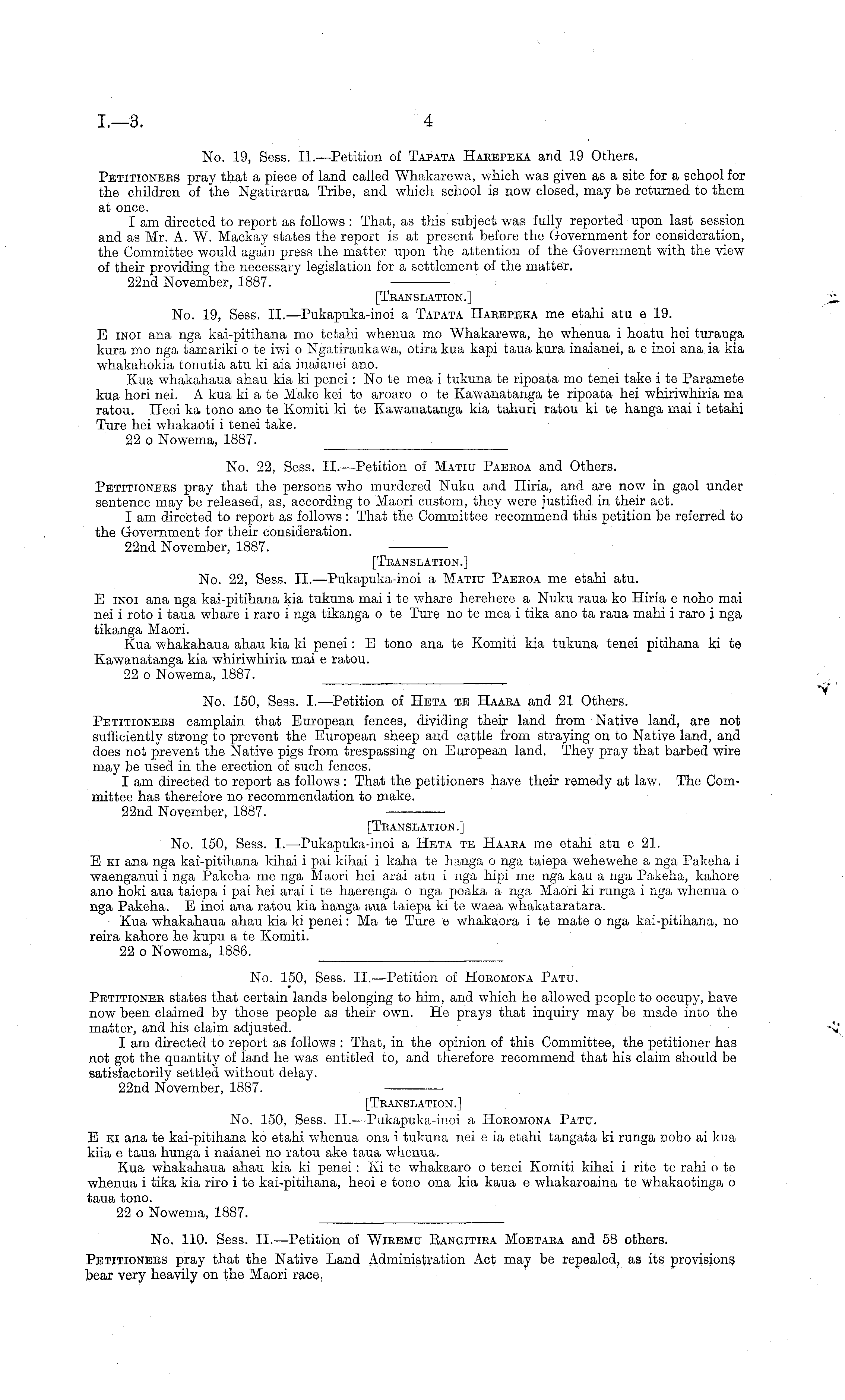 [Teanslation.] No. 19, Sess. ll.—Pukapuka-inoi a Tapata Habepeka me etahi atu c 19. E inoi ana nga kai-pitihana mo tetahi whenua mo Whakarewa, he whenua i hoatu hei turanga kura mo nga tamariki o te iwi o Ngatiraukawa, otira kua kapi taua kura inaianei, a c inoi ana ia kia whakahokia tonutia atu ki aia inaianei ano. Kua whakahaua ahau kia ki penei: No te mea i tukuna te ripoata mo tenei take ite Paramete kua hori nei. A kua ki ate Make kei te aroaro o te Kawanatanga te ripoata hei whiriwhiria ma ratou. Heoi ka tono ano te Komiti kite Kawanatanga kia tahuri ratou kite hanga mai i tetahi Ture hei whakaoti i tenei take. 22 o Nowema, 1887.
