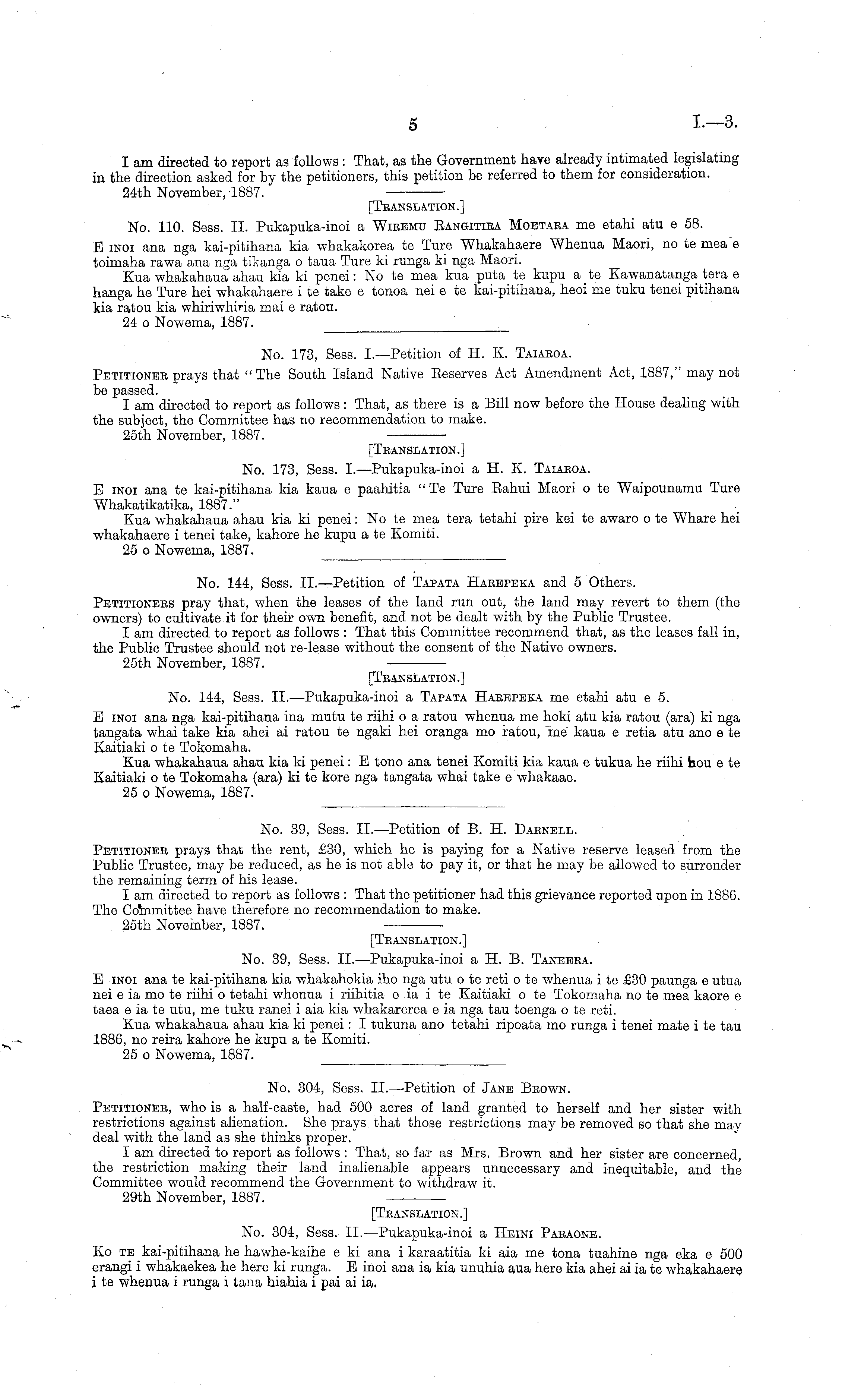 [Teanslation.] No. 144, Sess. ll.—Pukapuka-inoi a Tapata Haeepeka me etahi atu c 5. E inoi ana nga kai-pitihana ma mntu te riihi o a ratou whenna me hoki atu kia ratou (ara) ki nga tangata whai take kia ahei ai ratou te ngaki hei oranga mo ratou, me kaua c retia atu ano c te Kaitiaki o te Tokomaha. Kua whakahaua ahau kia ki penei: E tono ana tenei Komiti kia kaua c tukua he riihi bou etc Kaitiaki o te Tokomaha (ara) kite kore nga tangata whai take c whakaae. 25 o Nowema, 1887.