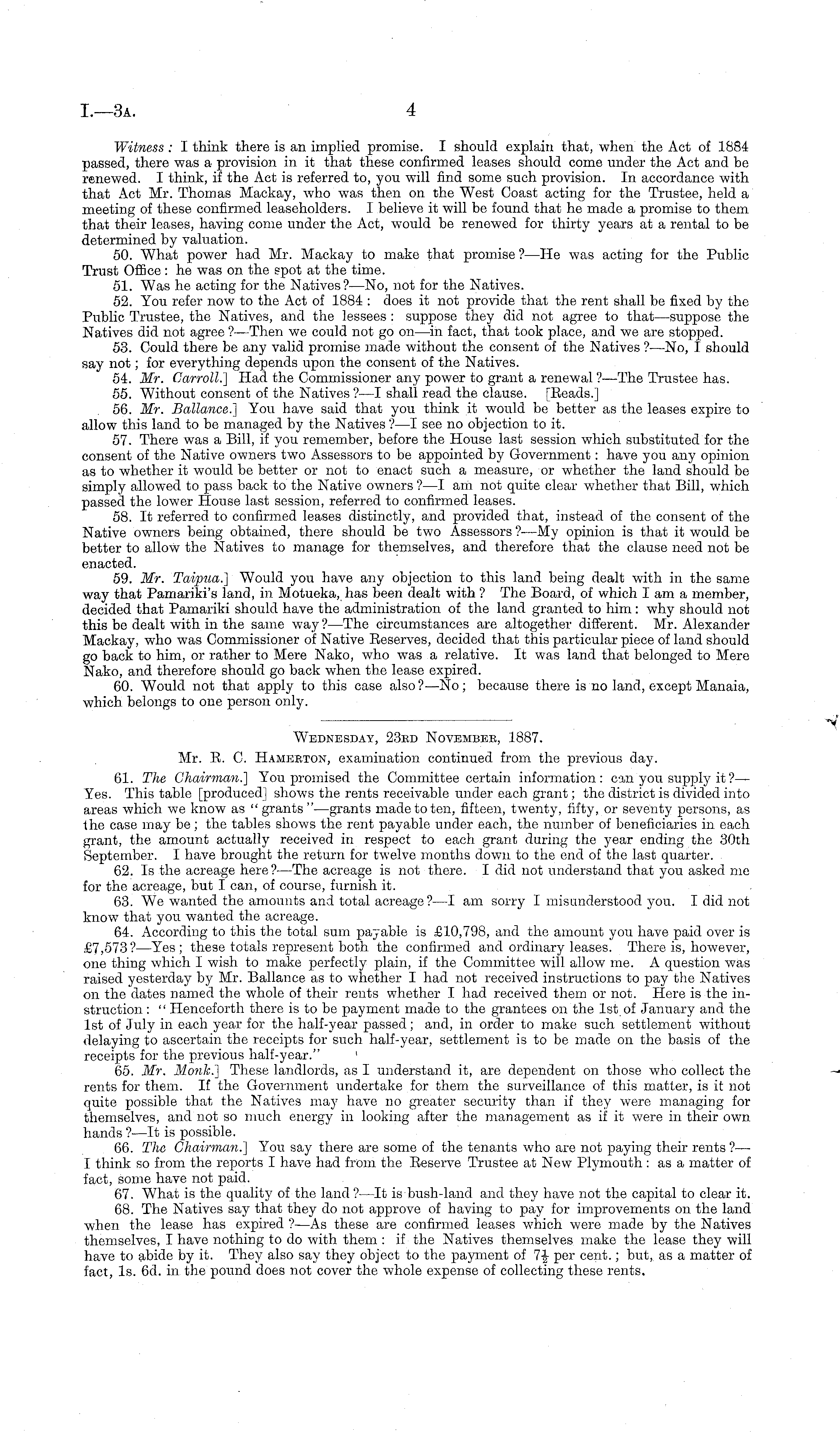 Wednesday, 23ed Novembee, 1887. Mr. B. C. Hamebton, examination continued from the previous day. 61. The Chairman.] You promised the Committee certain information: can you supply it?— Yes. This table [produced] shows the rents receivable under each grant; the district is divided into areas which we know as "grants"—grants made to ten, fifteen, twenty, fifty, or seventy persons, as the case may be; the tables shows the rent payable under each, the number of beneficiaries in each grant, the amount actually received in respect to each grant during the year ending the 30th September. I have brought the return for twelve months down to the end of the last quarter. 62. Is the acreage here? —The acreage is not there. I did not understand that you asked me for the acreage, but I can, of course, furnish it. 63. We wanted the amounts and total acreage?—l am sorry I misunderstood you. I did not know that you wanted the acreage. 64. According to this the total sum payable is £10,798, and the amount you have paid over is £7,573? —Yes; these totals represent both the confirmed and ordinary leases. There is, however, one thing which I wish to make perfectly plain, if the Committee will allow me. A question was raised yesterday by Mr. Ballance as to whether I had not received instructions to pay the Natives on the dates named the whole of their rents whether I had received them or not. Here is the instruction : " Henceforth there is to be payment made to the grantees on the Ist of January and the Ist of July in each year for the half-year passed; and, in order to make such settlement without delaying to ascertain the receipts for such half-year, settlement is to be made on the basis of the receipts for the previous half-year." ' 65. Mr. Monk.] These landlords, as I understand it, are dependent on those who collect the rents for them. If the Government undertake for them the surveillance of this matter, is it not quite possible that the Natives may have no greater security than if they were managing for themselves, and not so much energy in looking after the management as if it were in their own hands ?—lt is possible. 66. The Chairman.] You say there are some of the tenants who are not paying their rents ?— I think so from the reports I have had from the Beserve Trustee at New Plymouth : as a matter of fact, some have not paid. 67. What is the quality of the land ?—lt is bush-land and they have not the capital to clear it. 68. The Natives say that they do not approve of having to pay for improvements on the land when the lease has expired ?—As these are confirmed leases which were made by the Natives themselves, I have nothing to do with them : if the Natives themselves make the lease they will have to abide by it. They also say they object to the payment of 7-J- per cent.; but, as a matter of fact, Is. 6d. in the pound does not cover the whole expense of collecting these rents.