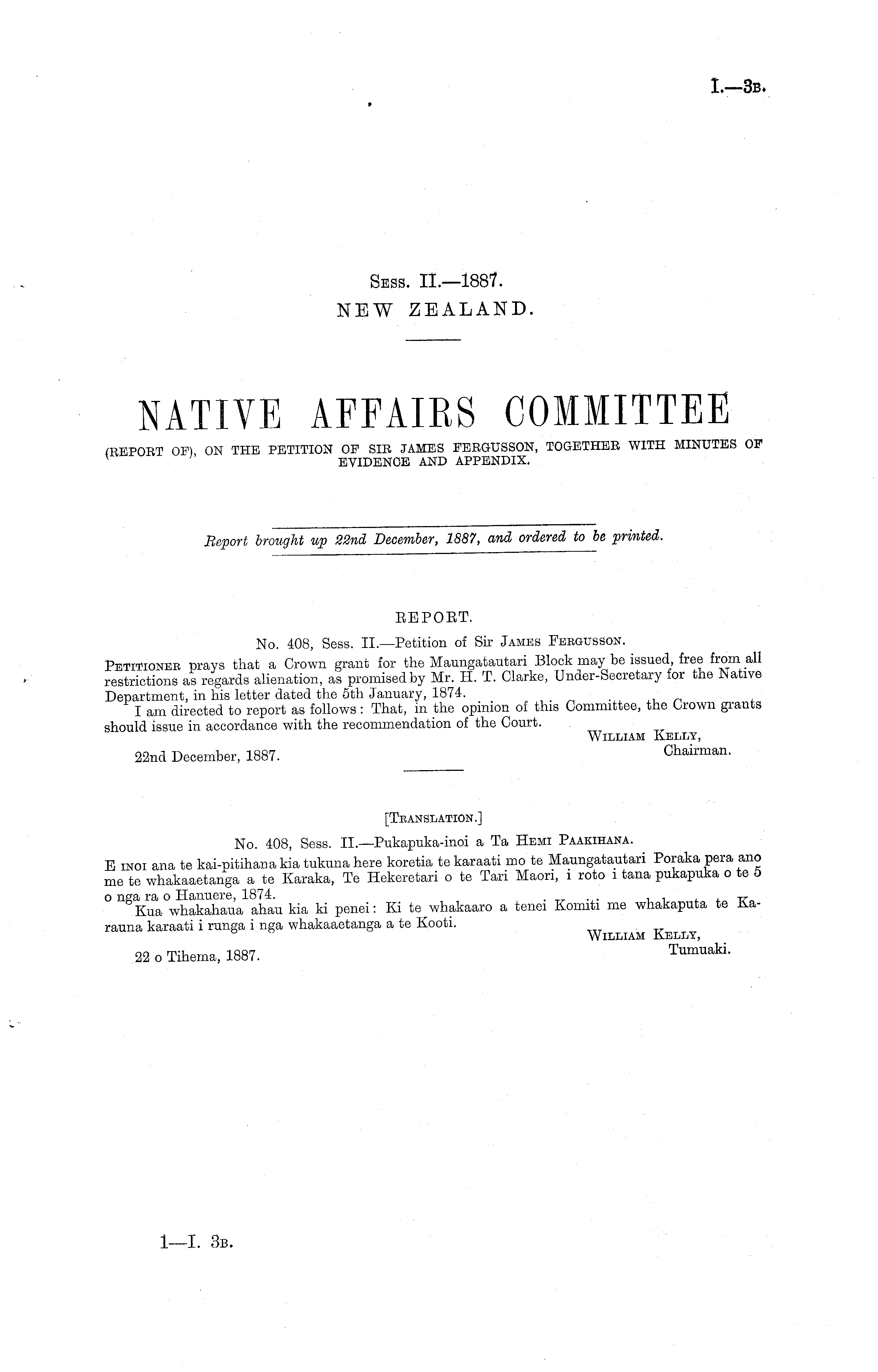 [Translation.] No. 408, Sess. ll.—Pukapuka-inoi a Ta Hemi Paakihana. E inoi ana te kai-pitihana kia tukuna here koretia te karaati mo te Maungatautari Poraka pera ano me te whakaaetanga a te Karaka, Te Hekeretari o te Tari Maori, i roto i tana pukapuka o te 5 o nga ra o Hanuere, 1874. ._...,. , , . . —■„ Kua whakahaua ahau kia ki penei: Xi te whakaaro a tenei Komiti me whakaputa te Harauna karaati i runga i nga whakaaetanga a te Kooti. William Kelly, 22 o Tihema, 1887. Tumuaki.